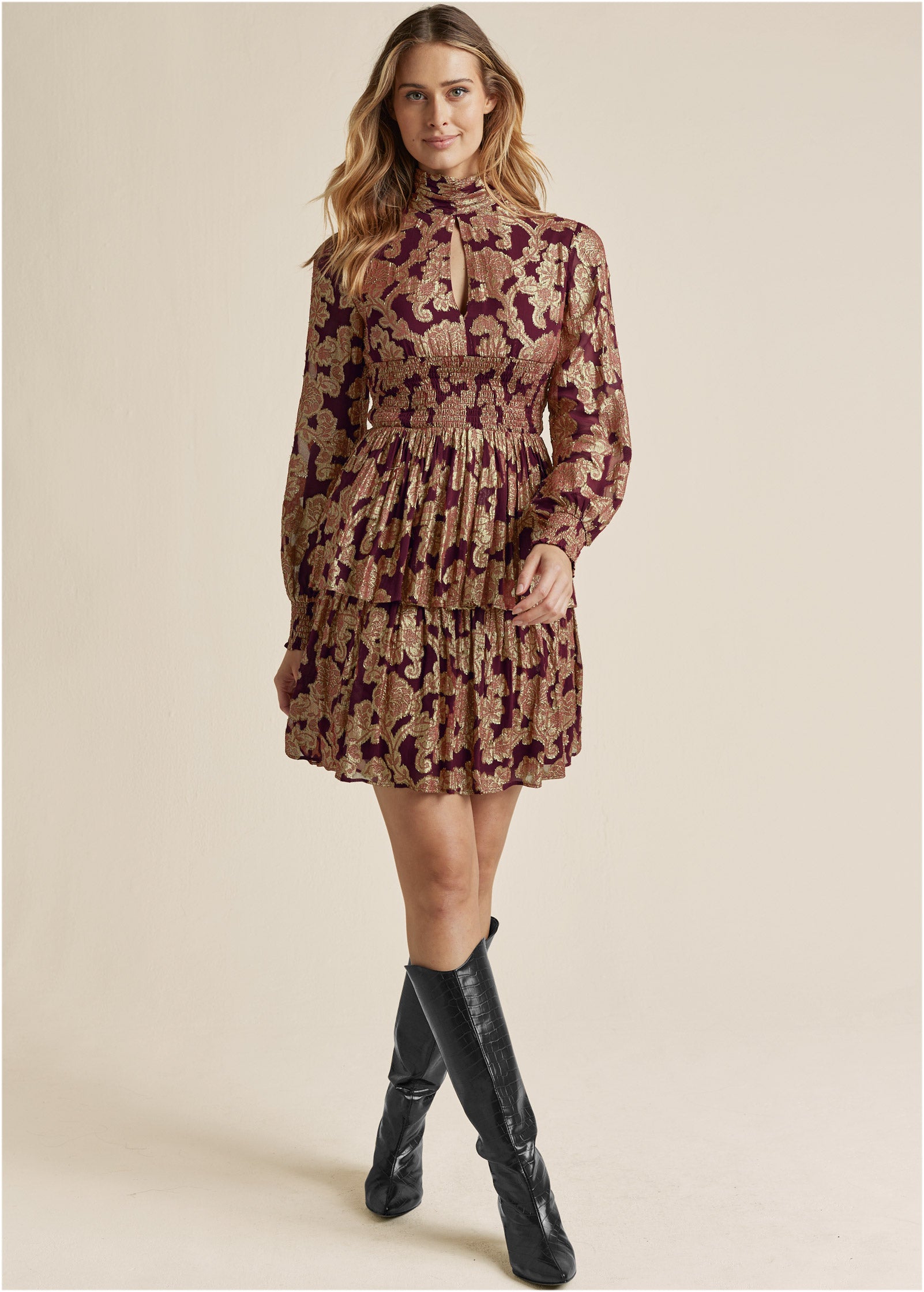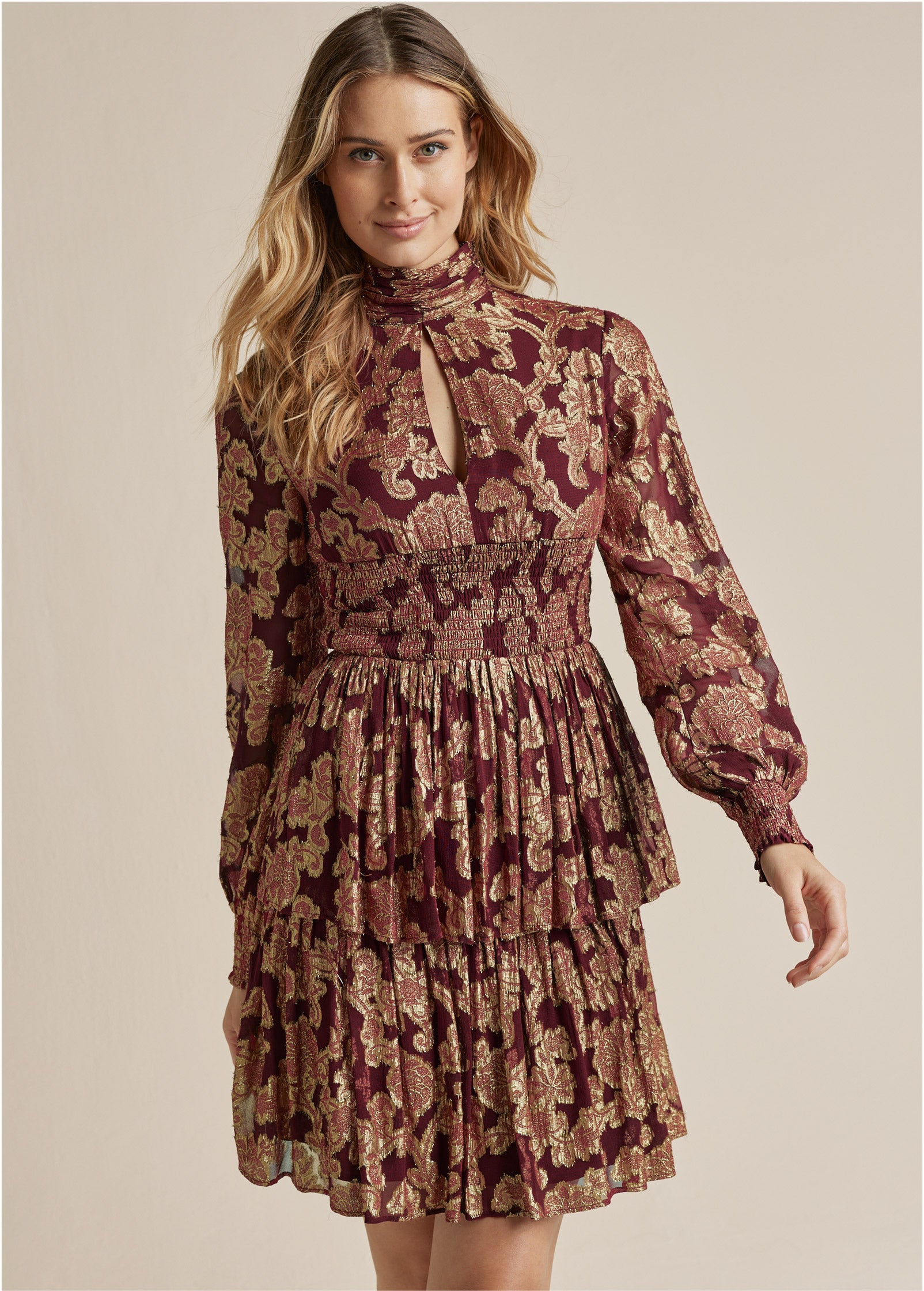Smocked Waist Jaquard Mini Dress - Wine & Gold