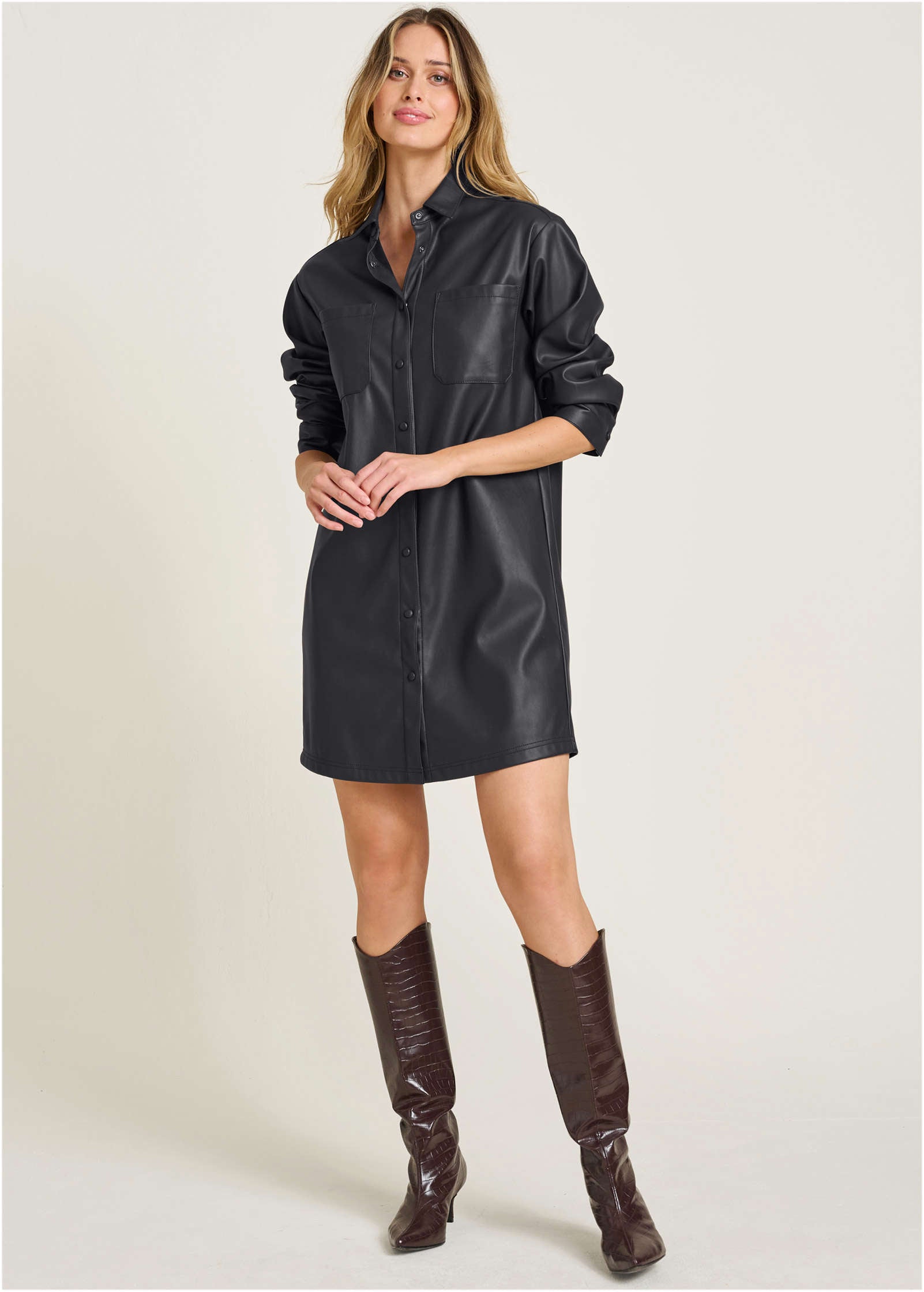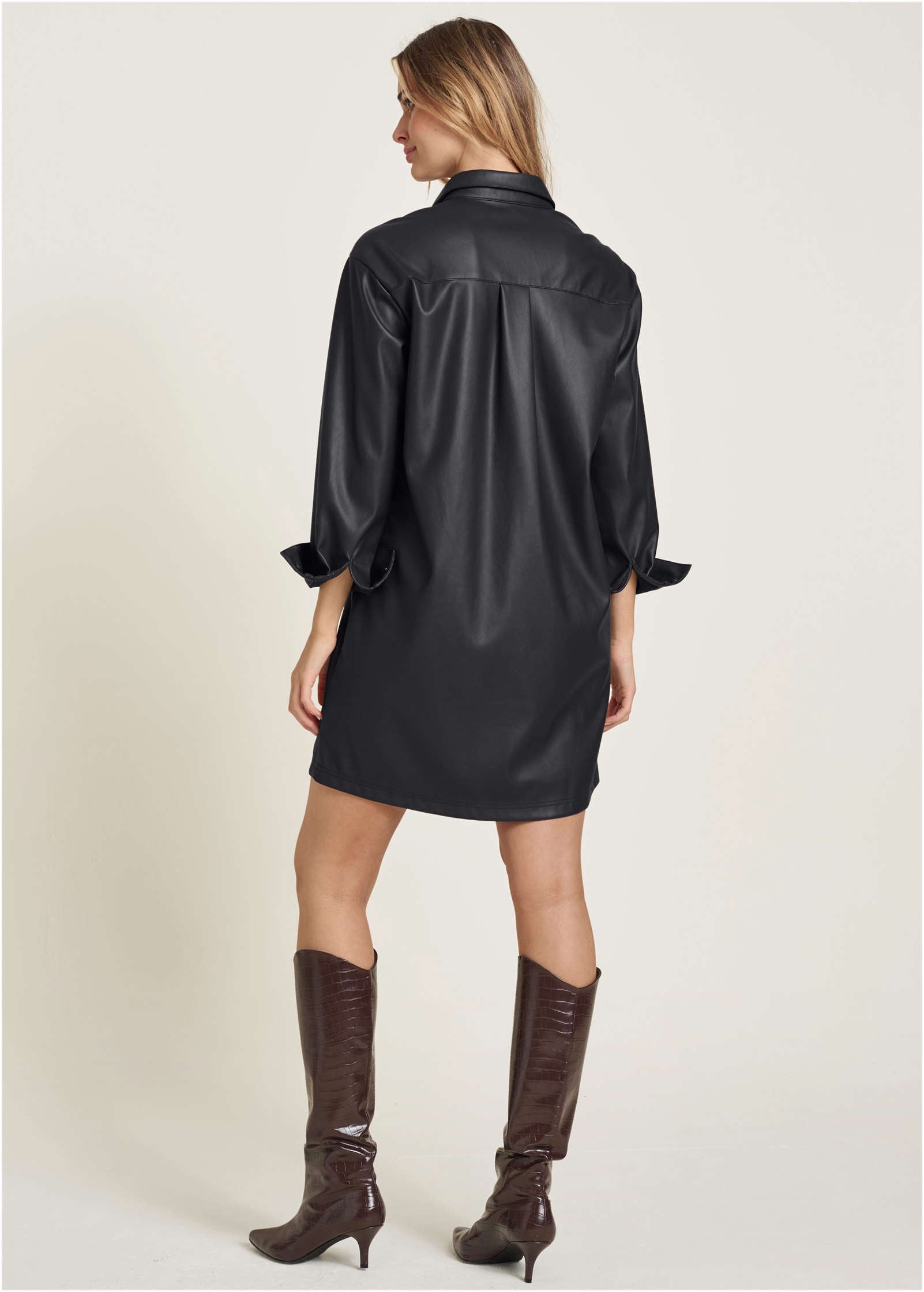 Faux Leather Shirt Dress - Black