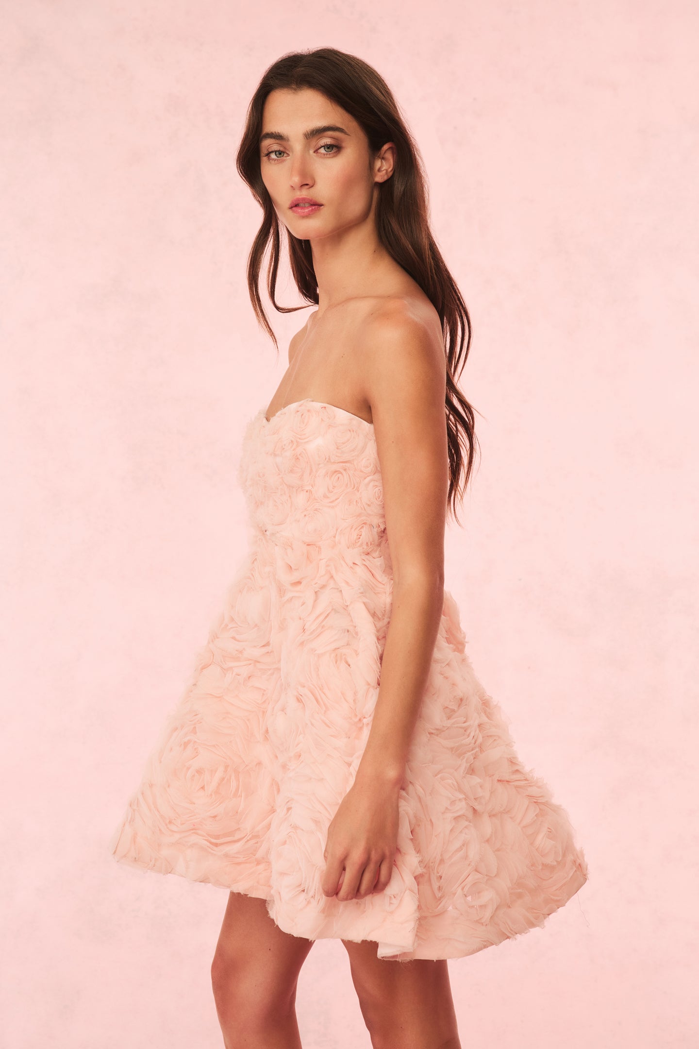Wake up and smell the roses in the Bellamina Dress. This stunning event mini arrives with a beautiful abundance of organza roses adorning the dress all over varying in different sizes. With a strapless neckline. the dress has a fitted bodice that flows out to an airy. but structured bubble-like skirt.