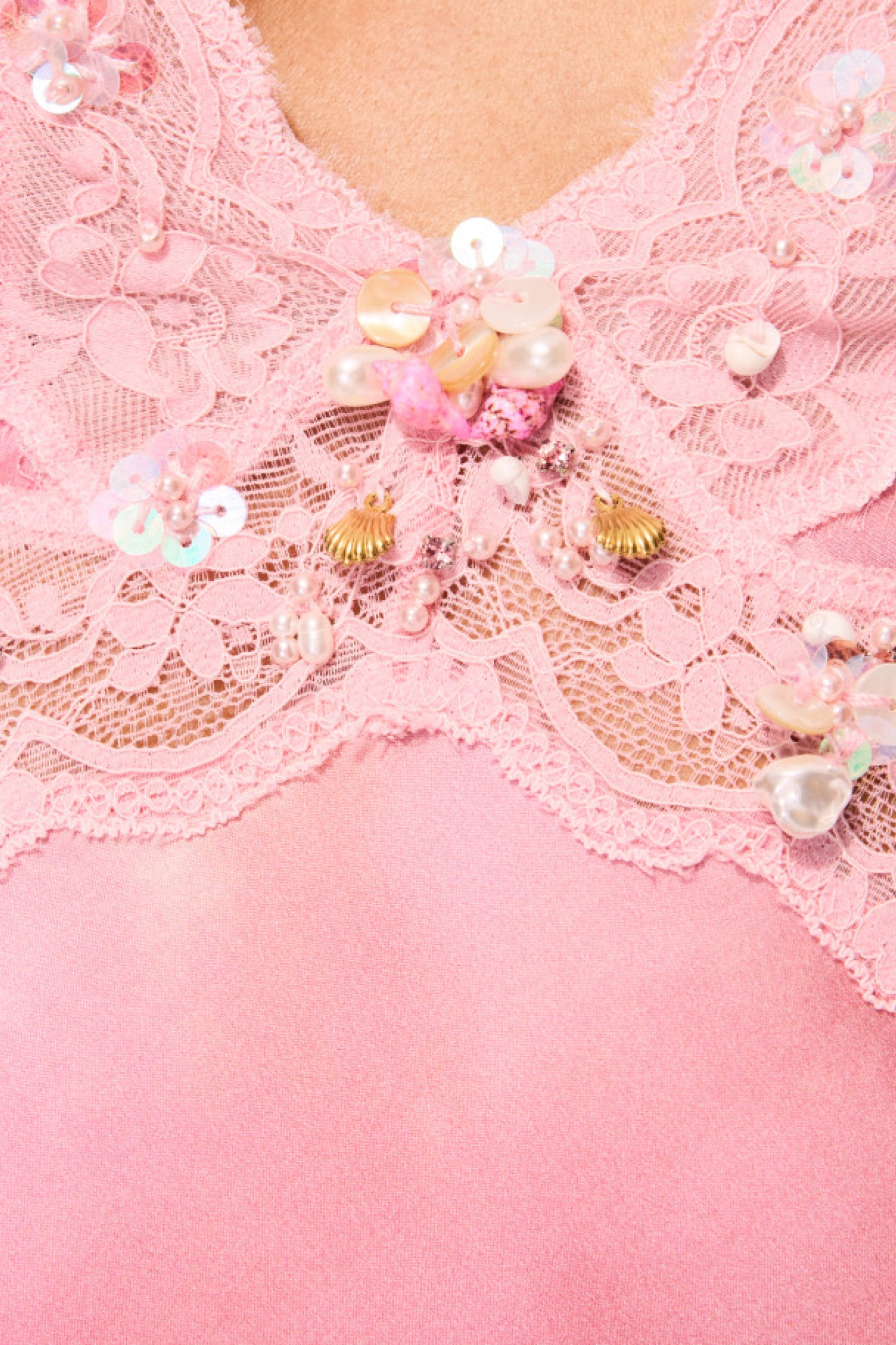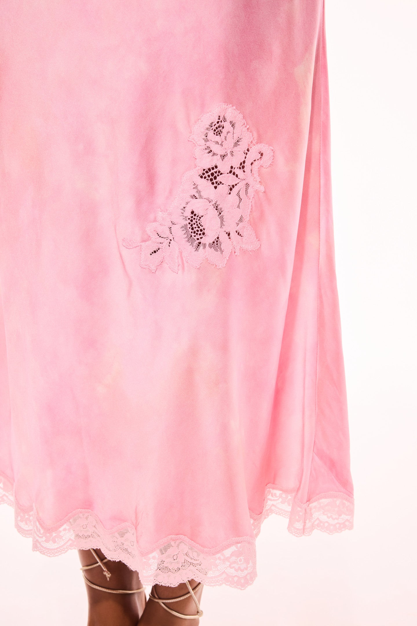 Introducing the Bier Dress. This gorgeous slip dress stuns with a solid charmeuse silk blend fabric with a hand-dyed-like print all over. The midi dress features vintage-inspired laces at the neckline and hem adorned with shell-and-pearl embellishments.