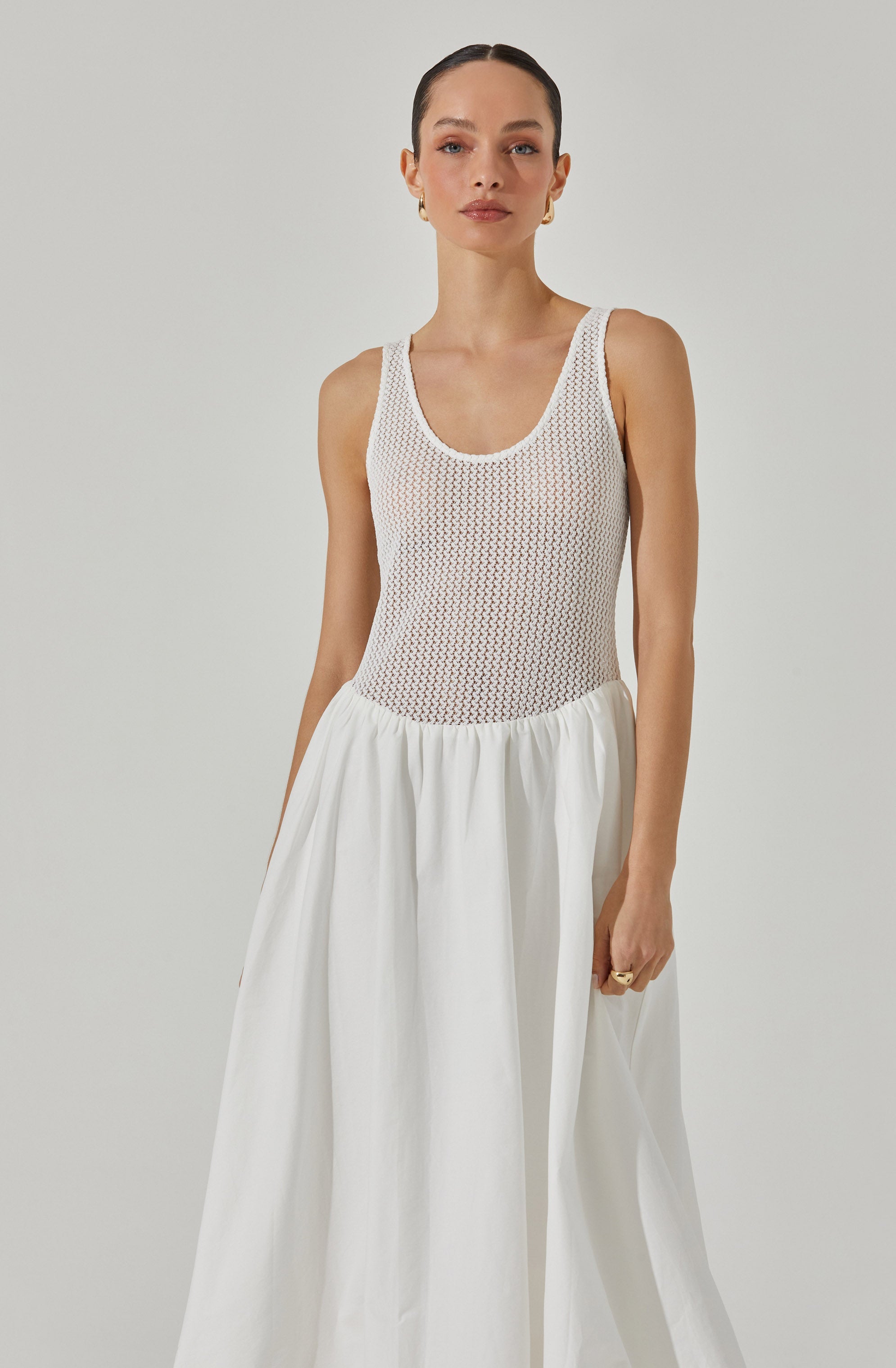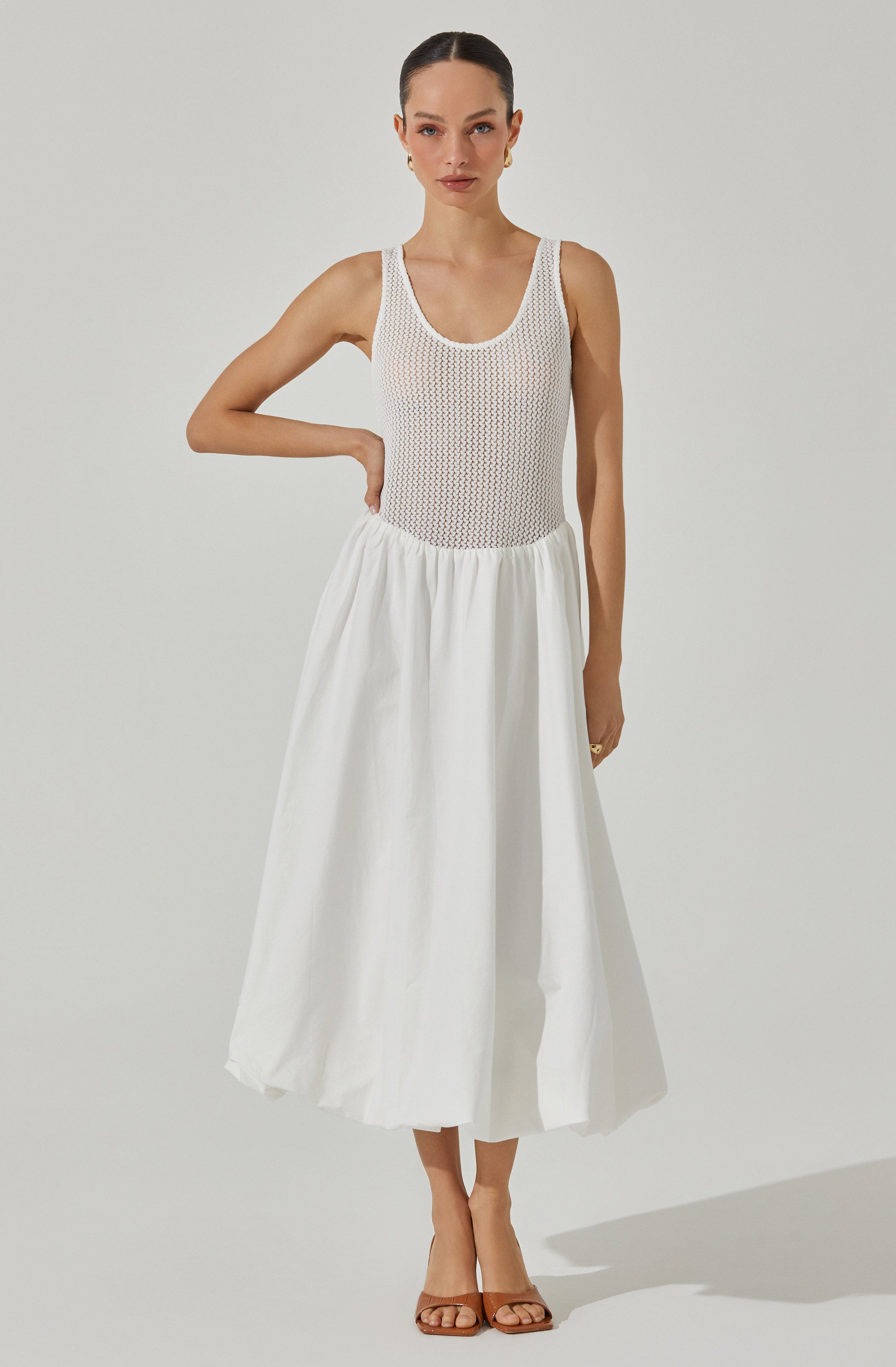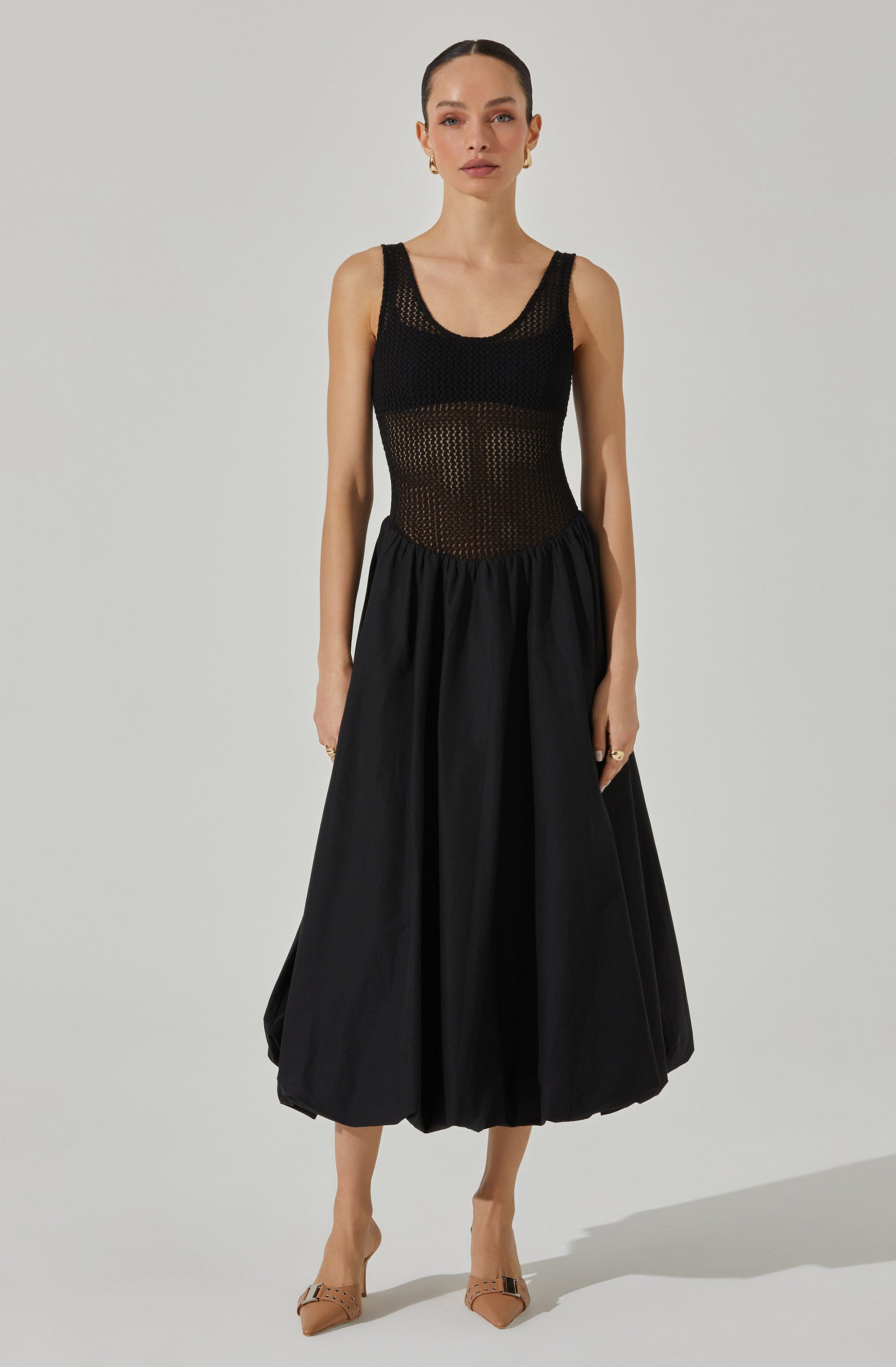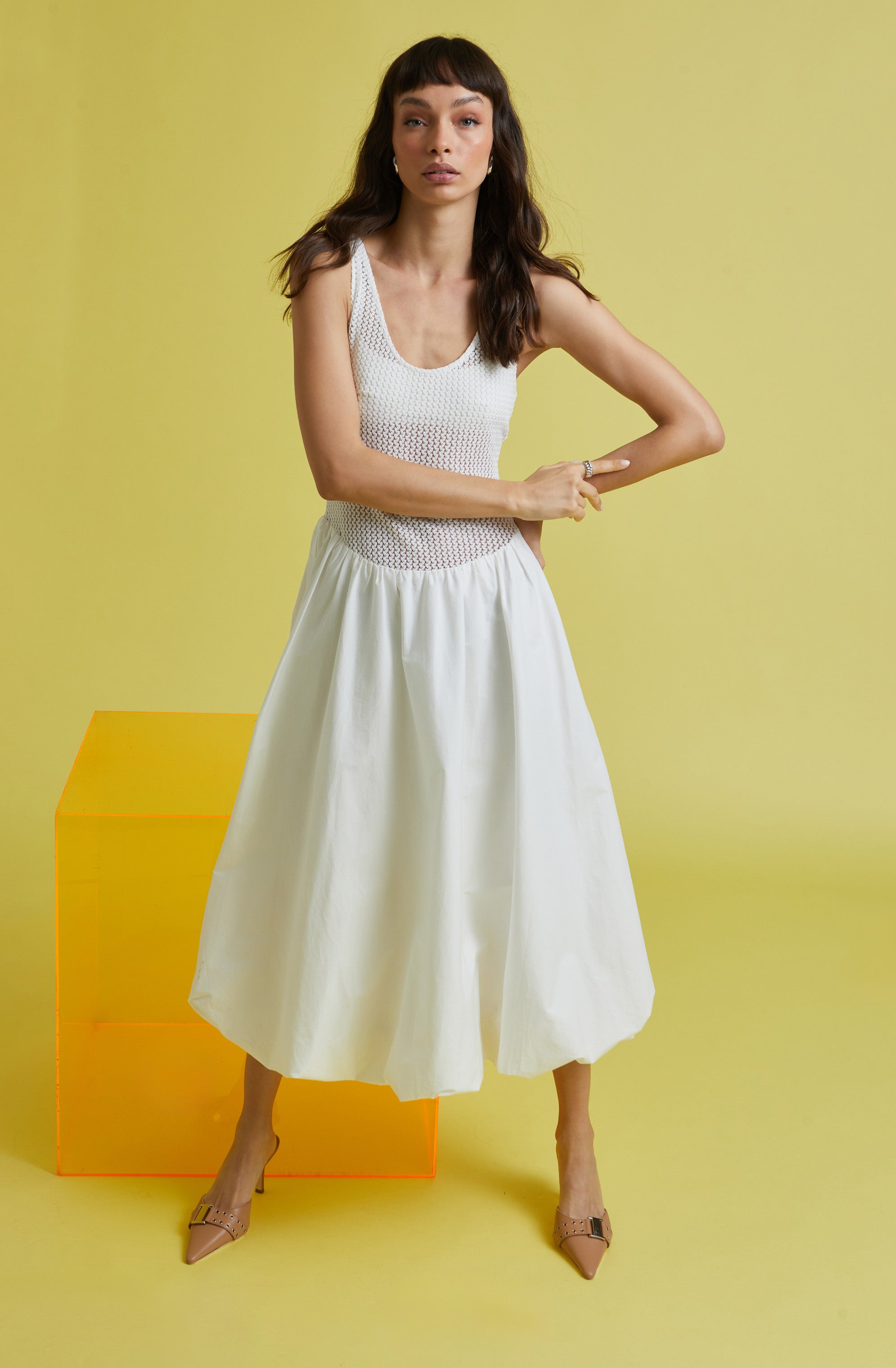 Bubble hem skirt silhouette. scoop-neck tank
