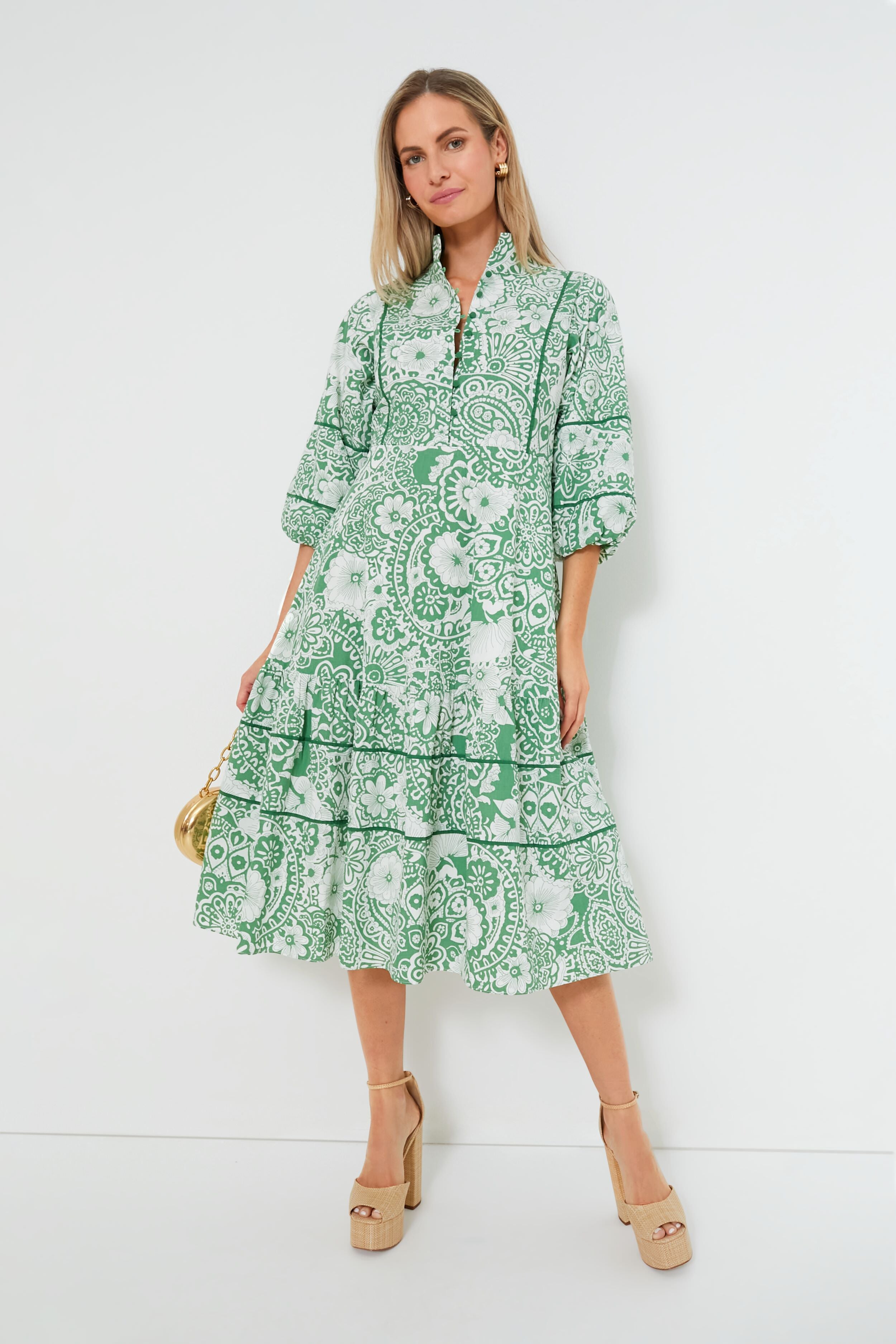 The Green and White Floral Hillsborough Dress is perfect for warm. breezy days lounging by the beach or going to lunch with friends. This midi boasts three-quarter length puff sleeves. a fit and flare silhouette. and a tiered skirt with piping panels. The eye-catching green is the cherry on top. creating an enchanting swirl of patterns and shapes. Pair with heels and a clutch. or with simple sandals and gold jewelry.