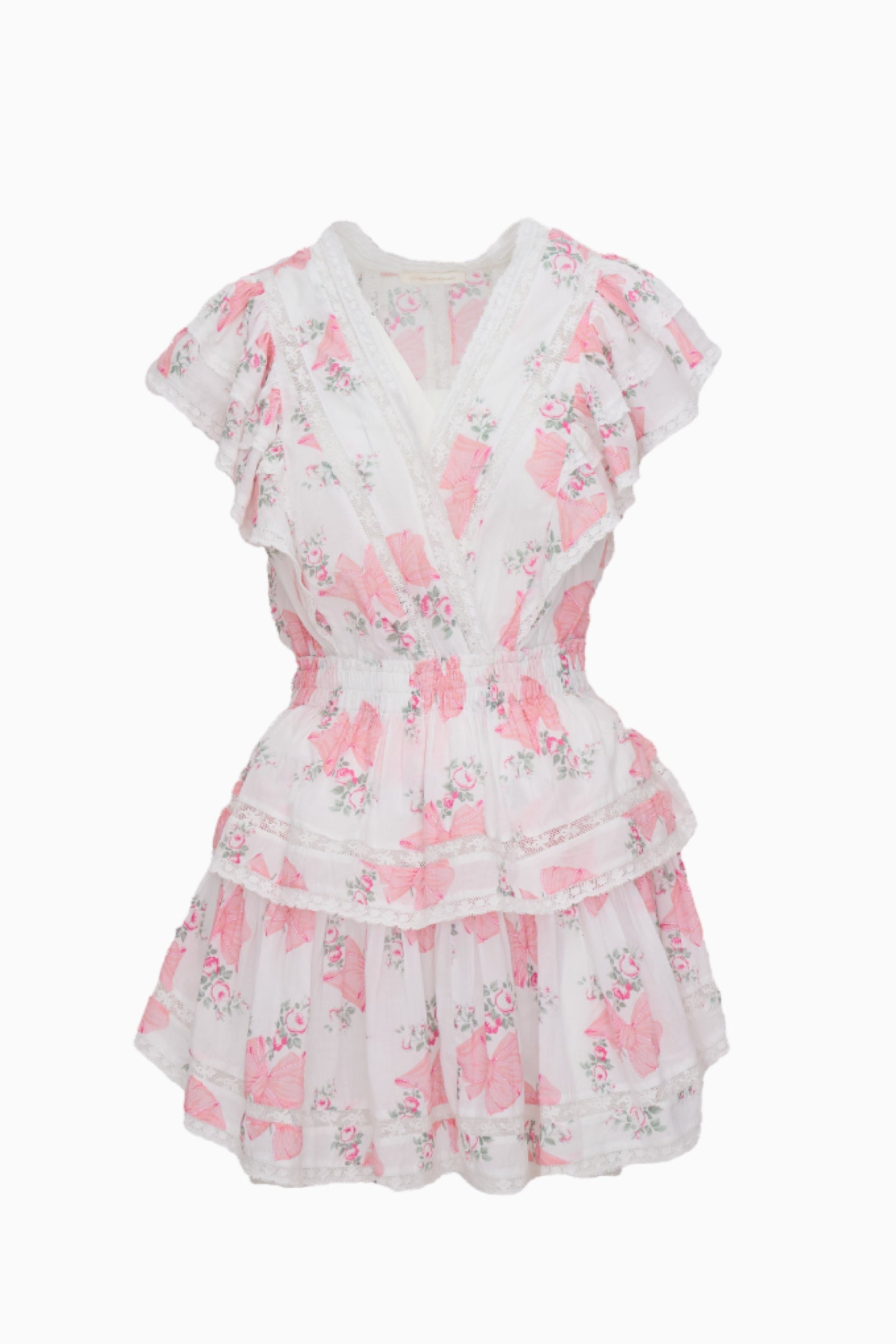 Our Gwen Dress returns as part of our Heirloom Print Capsule featuring our signature Rosa Beaux print made-to-match our Hair & Body Perfume Mists. With lace and embroidery details. this short frock has a faux wrap top. which forms a deep v neckline. Shirred ruffles line the outer edges of the shoulder and bodice. forming flutter sleeves. The skirt is constructed just like our signature Ruffle Mini—with an elastic waist and two flounced tiers.