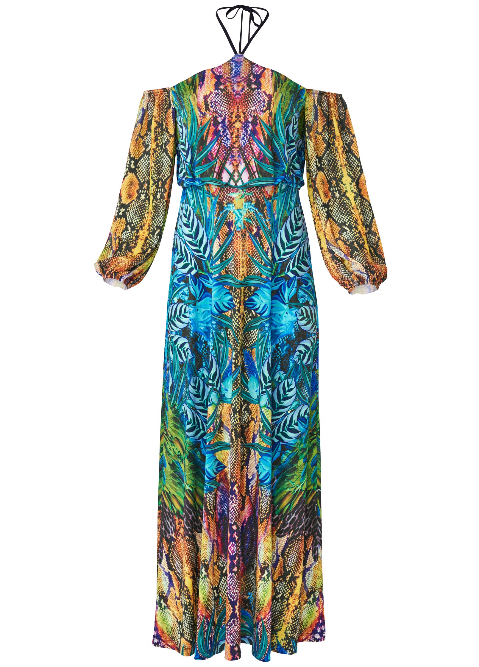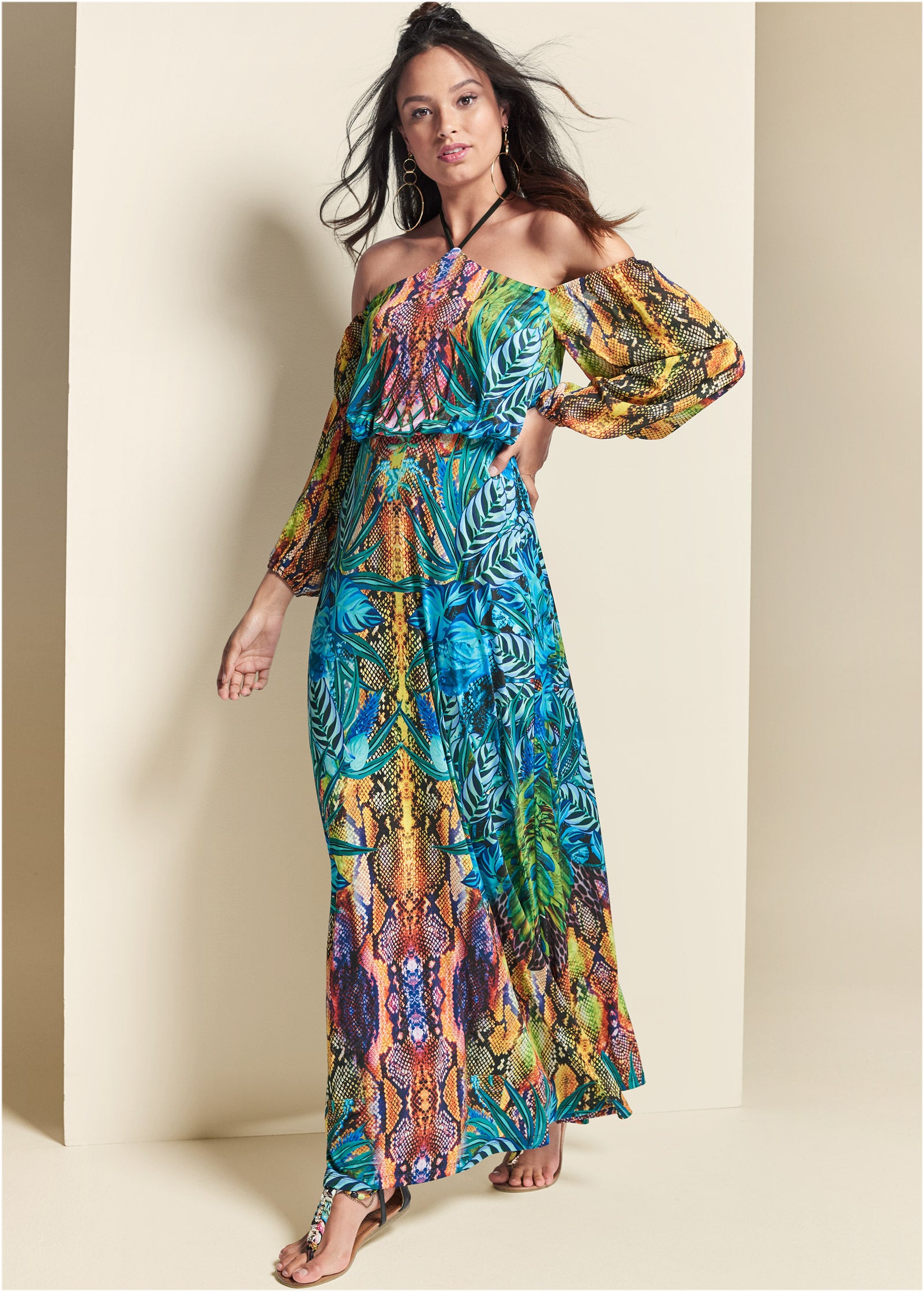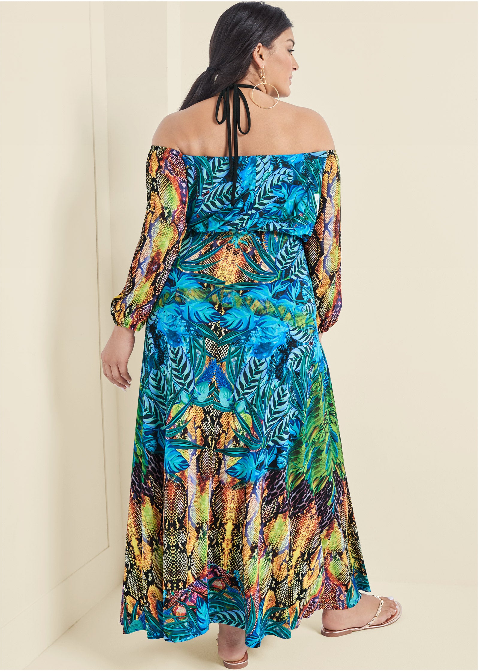 So many colors and so many textures come together in harmony in this majestic off-the-shoulder maxi! This beautifully captivating style is sure to radiate warm. tropical vibes no matter the weather!