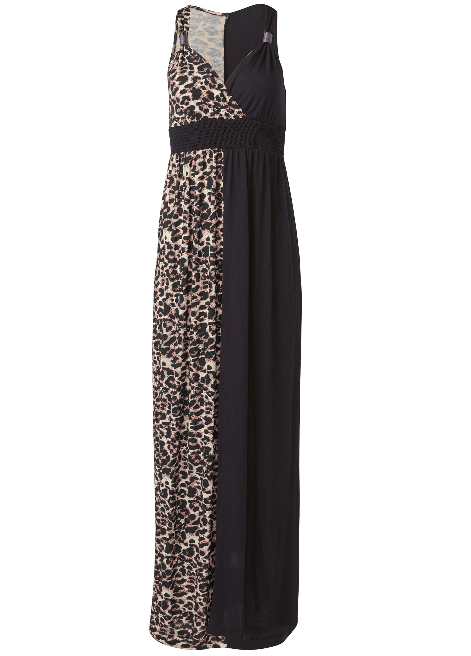 You're looking at a dress that isn't afraid to unleash its wild side. Fierce leopard print on one side and classic black on the other. this color block maxi dress is a bold statement maker. With a wrap-style neckline and empire waist it's a universally flattering piece that goes from beach days to sunset dinners with ease. Don't head out on vacay without this dress in your suitcase. * Sizes: XS (2). S (4-6). M (8-10). L (12-14). XL (16) * Plus sizes: 1X (18-20). 2X (22-24). 3X (26-28) * For printed portion placement may vary * Maxi length approx. 54.5" * By Lascana for Aljck