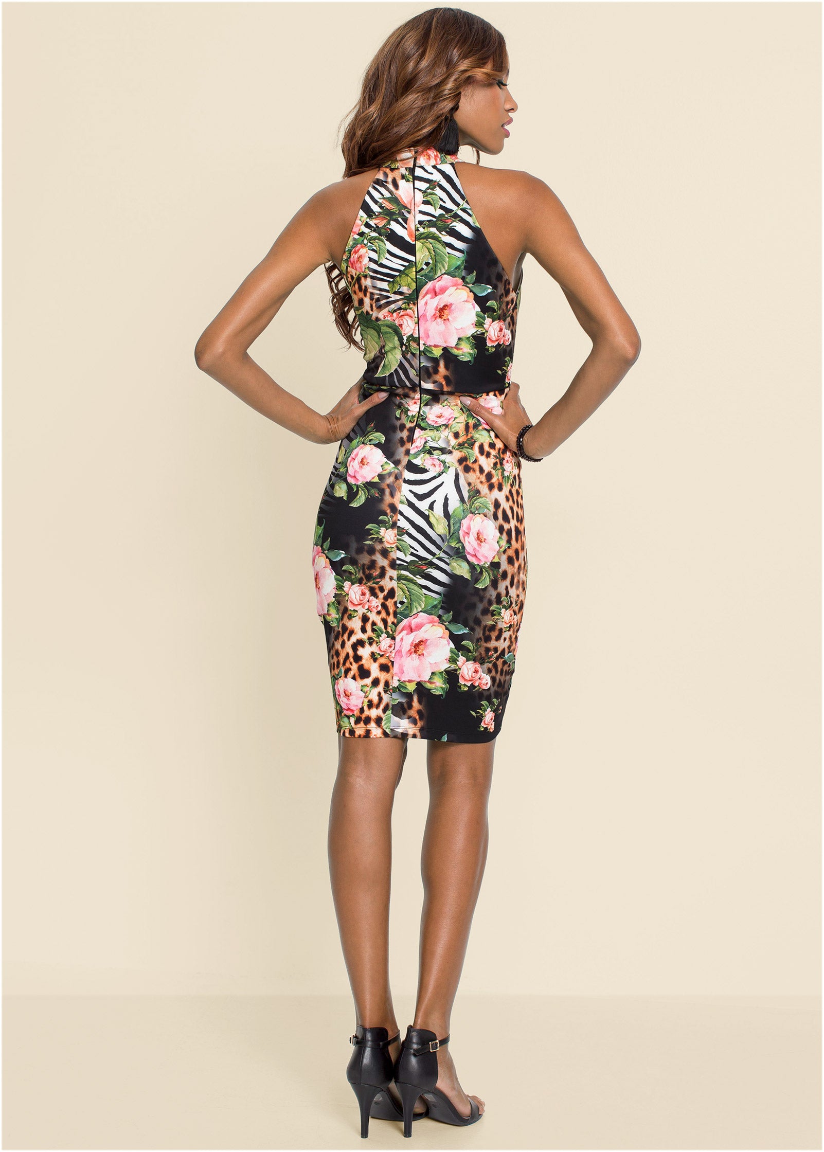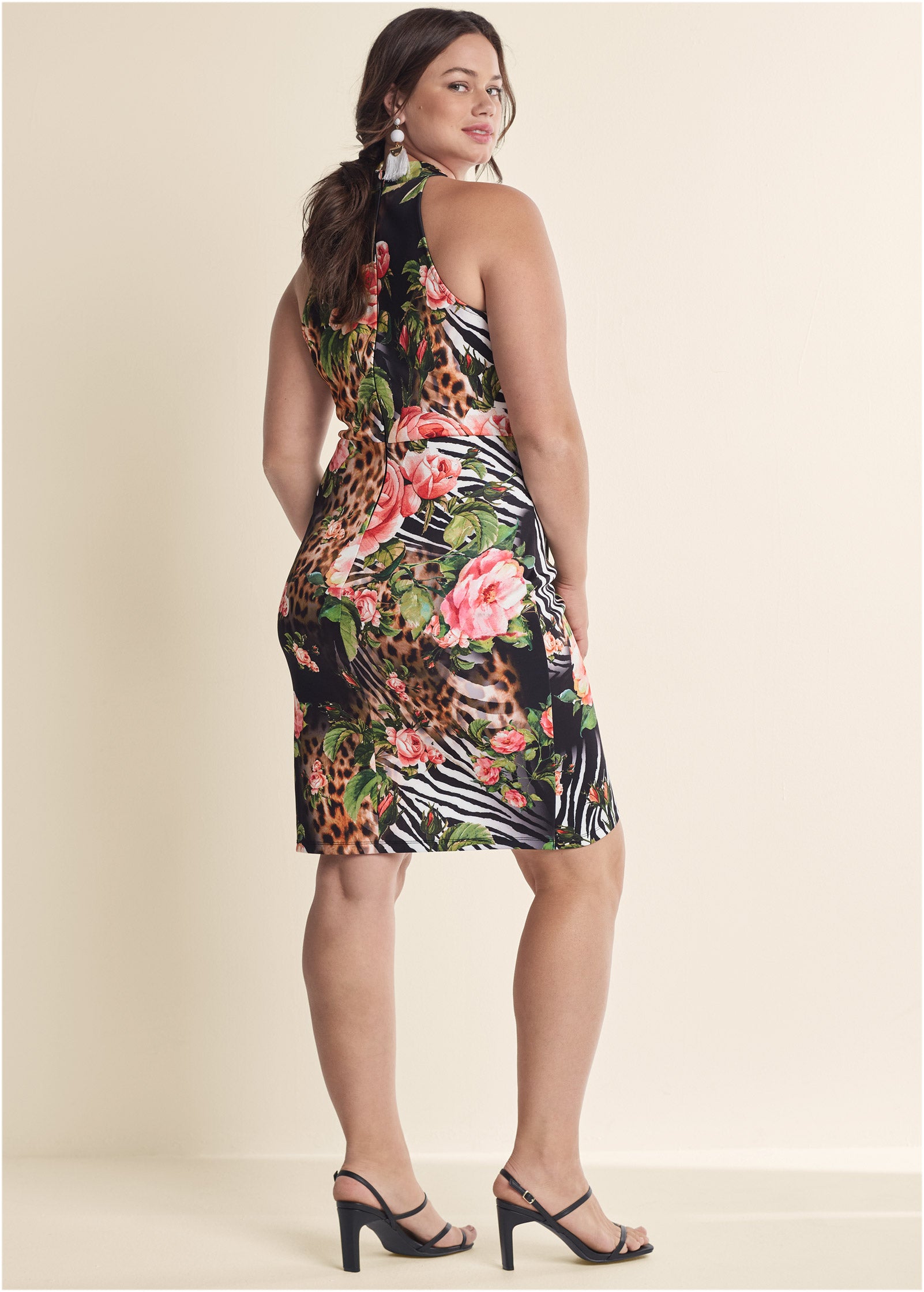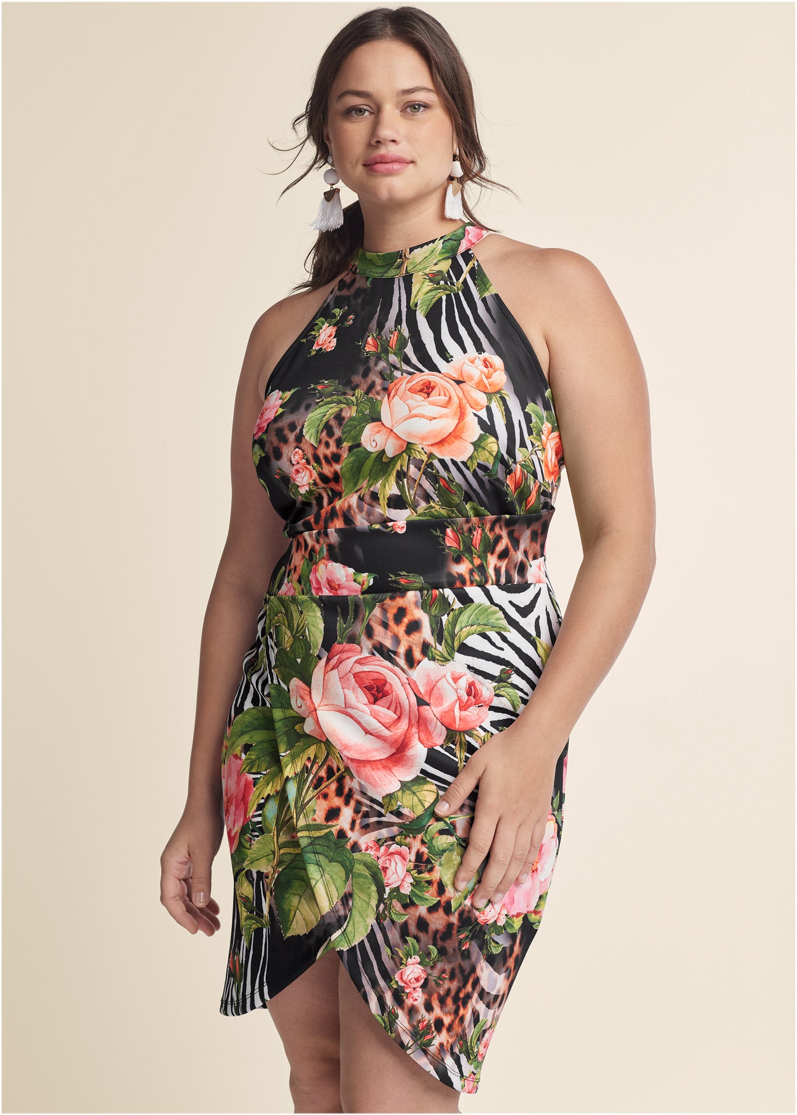 In a feminine shape that wraps across the front to create a tulip skirt. this pretty bodycon gets a wildly edgy twist with a blend of animal prints and florals for balance. The mock neck draws the eye up. covering just enough to contrast the sleeveless bodice while the wide waistband defines your curves.* Sizes: XS (2). S (4-6). M (8-10). L (12-14). XL (16)* Plus sizes: 1X (18-20). 2X (22-24). 3X (26-28)* Zipper closure at back* Layered faux wrap skirt* Print placement may vary* Poly/elastane. Imported