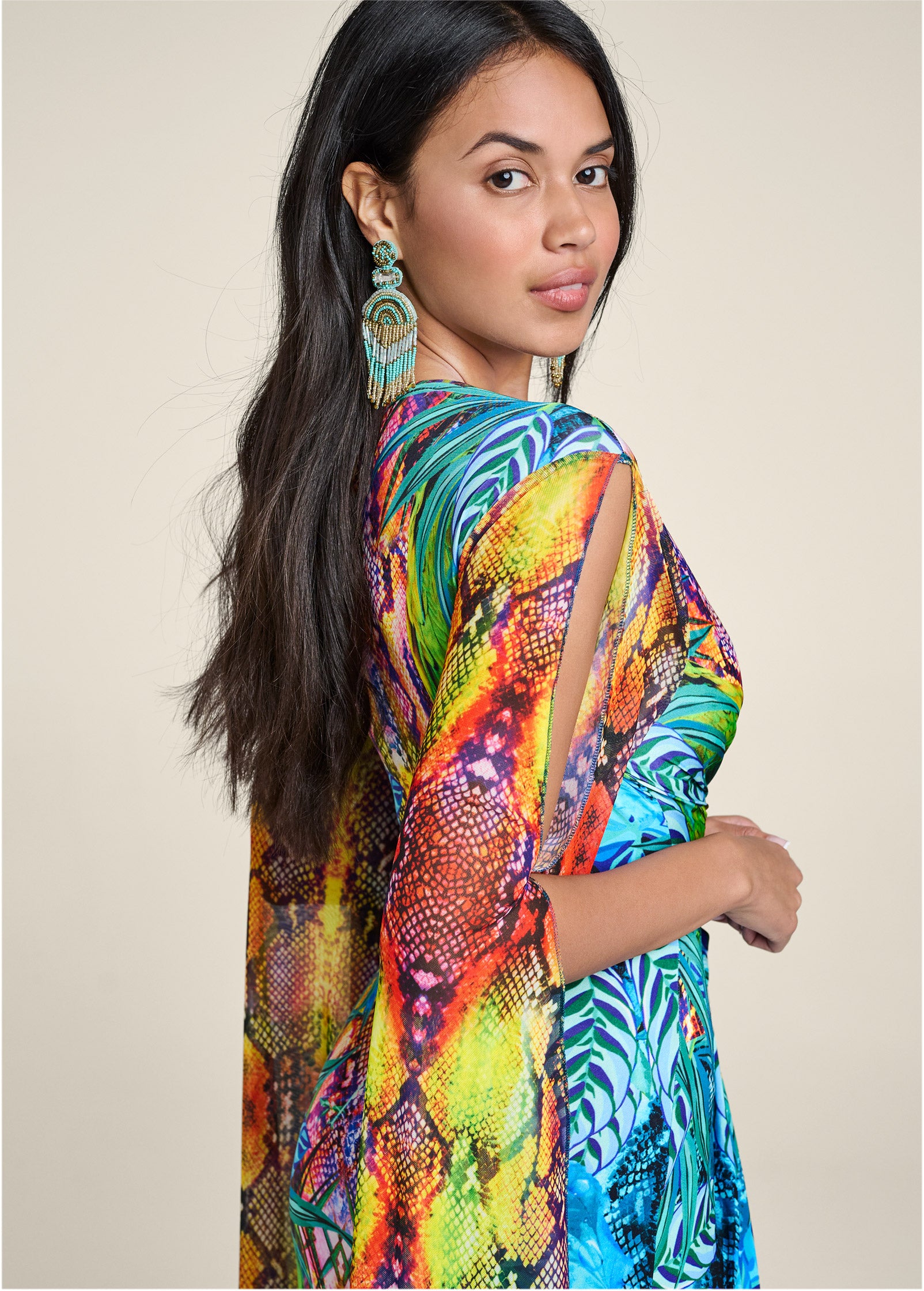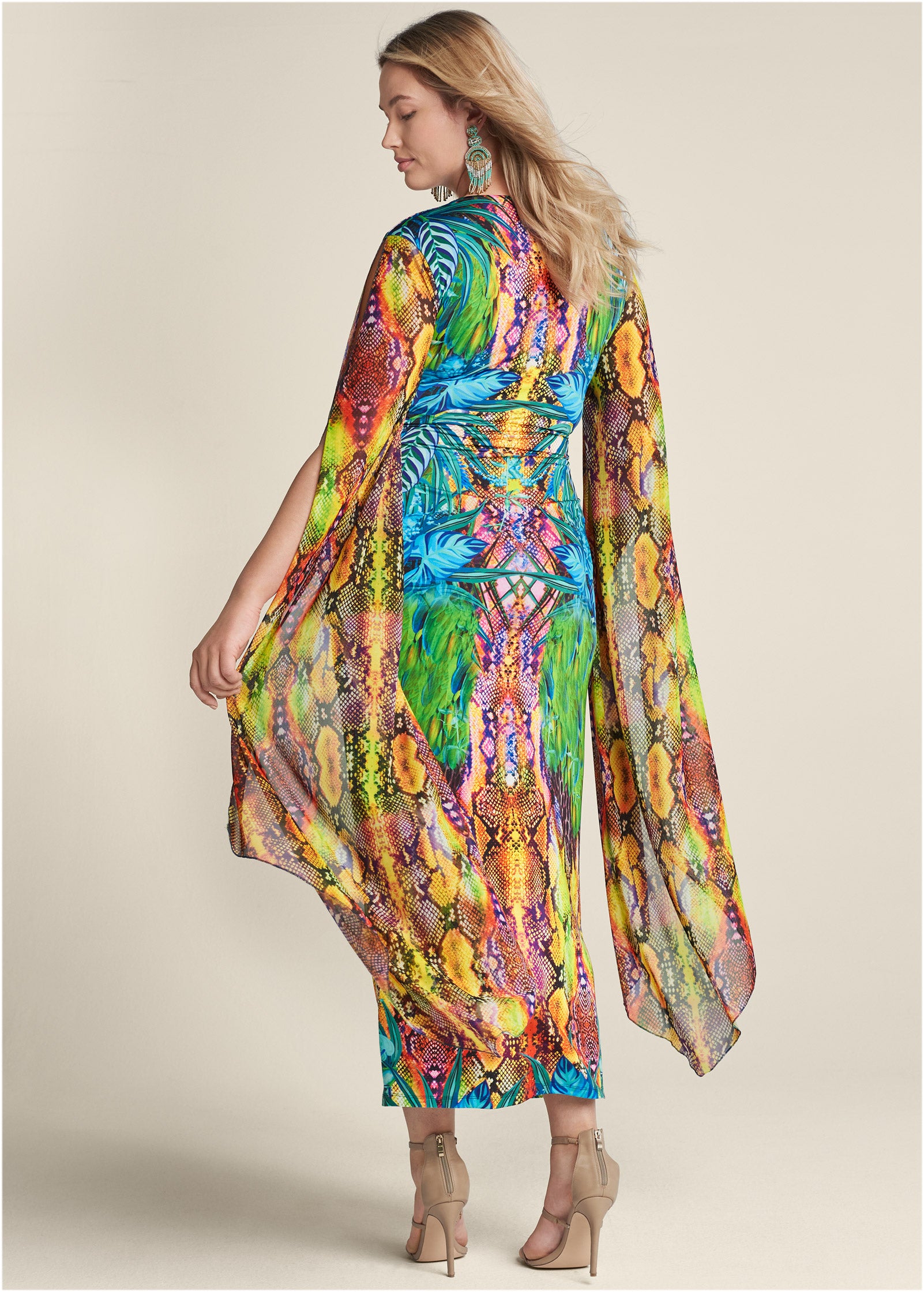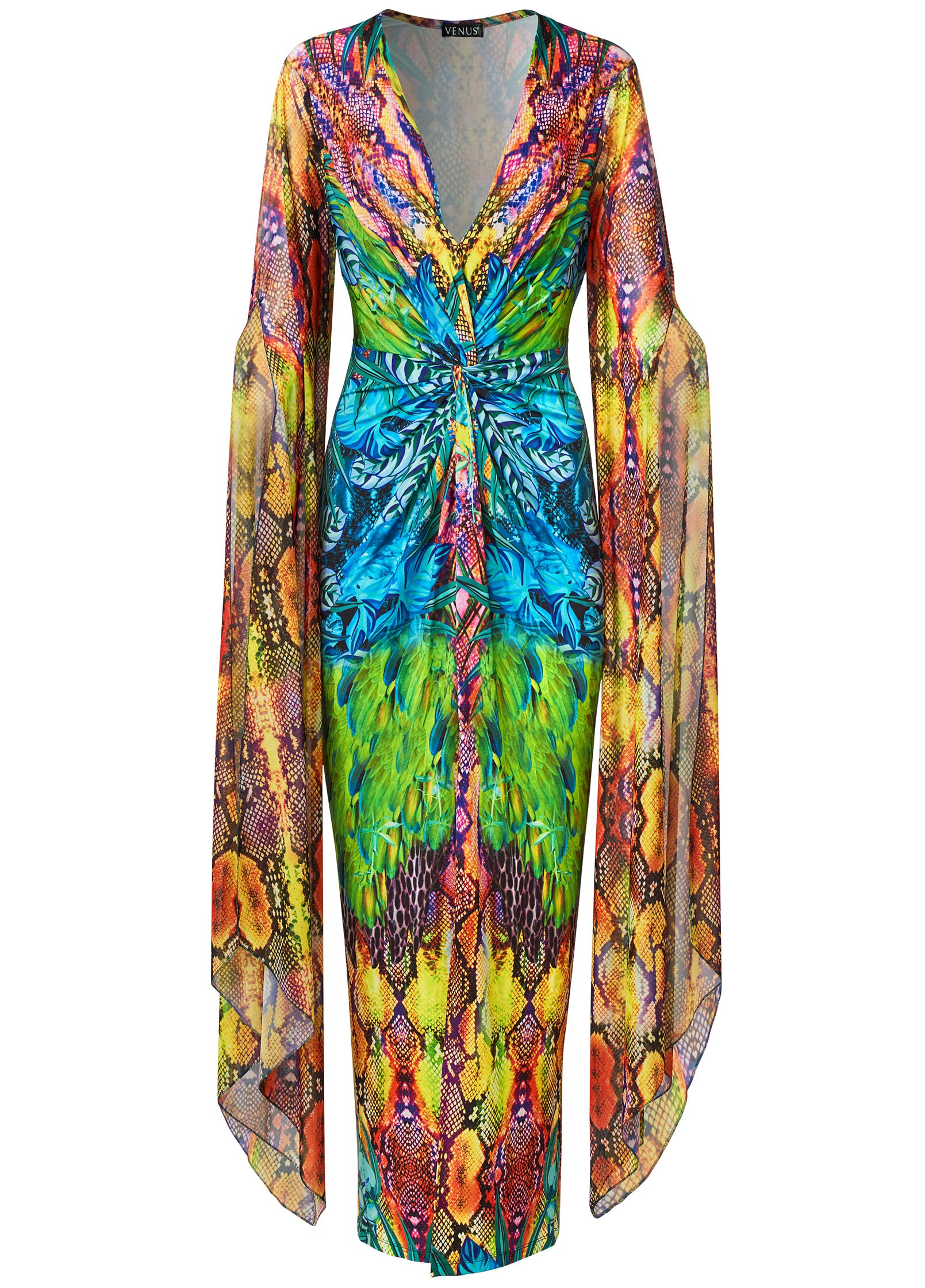 Dramatic. swaying sleeves extend down the full length of this ethereal maxi dress. with slits along each arm showing off a playful peek of skin. The deep plunging V-neck and center front skirt slit along with the flattering twist waist detail. draw the eye in to enhance your curves.* Sizes: XS (2). S (4-6). M (8-10). L (12-14). XL (16)* Plus sizes: 1X (18-20). 2X (22-24). 3X (26-28)* Print is placed* Deep V-neck* Twist detail at front* Long drape sleeve detail* Maxi length approx. 59"* Slit starts at 36"* Poly/elastane. Imported