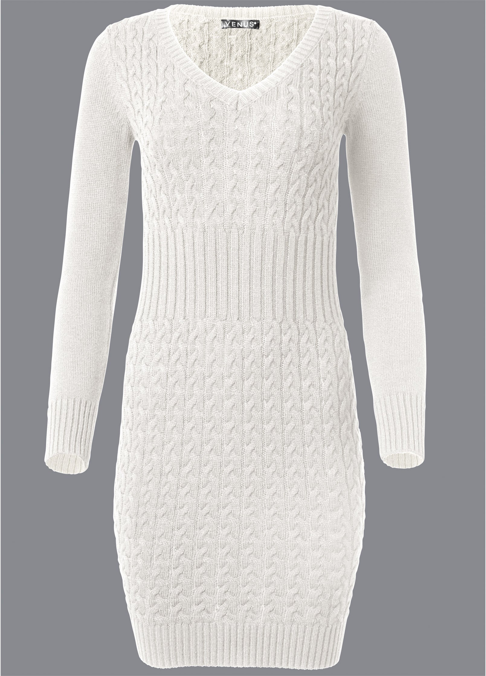 All the elements of your favorite sweaters meet in this one sleek V-neck sweater dress! Cozy cable knit and classic ribbing combine in this mini dress that is ready for all your chilly-day occasions. Thoughtfully placed ribbing under the bust has a smoothing effect for an hourglass-inspired silhouette.* Sizes: XS (2). S (4-6). M (8-10). L (12-14). XL (16)* Plus sizes: 1X (18-20). 2X (22-24). 3X (26-28)* V-neck* Cable knit bodice detail* Hits above the knee 36"* Fabric has stretch* Acrylic. Imported