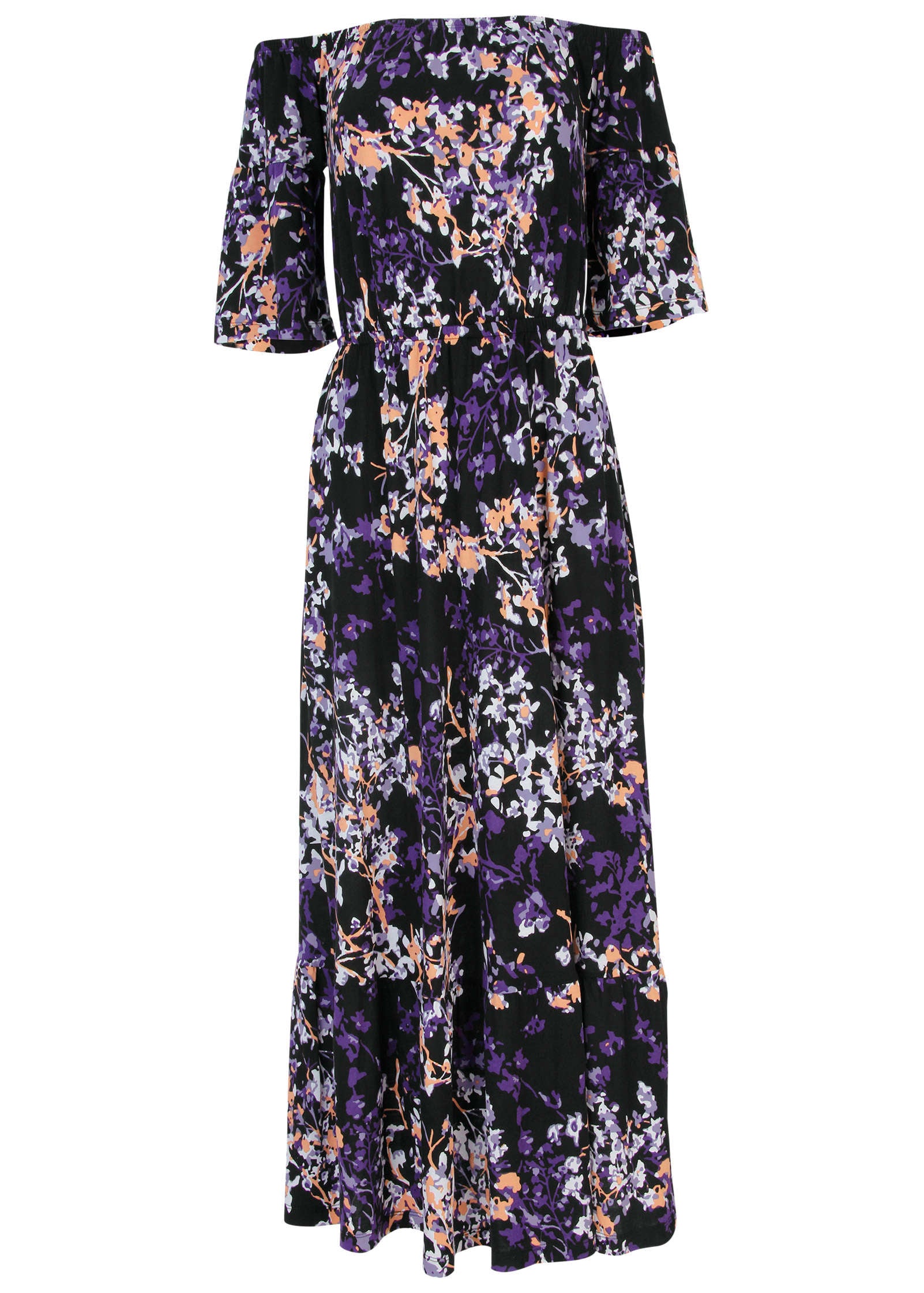 A maxi a day keeps the bad vibes away! Stay in a sunny state of mind with the easy off-the-shoulder neckline and fluttered sleeves of this tiered maxi. Elastic around the waist creates a cinched-in effect. contrasting the flowy hem and sleeves for balance. Add a belt for structure and change up the look!* Sizes: XS (2). S (4-6). M (8-10). L (12-14). XL (16)* Plus sizes: 1X (18-20). 2X (22-24). 3X (26-28)* Plus sizes run large; size down for a better fit* Elastic neckline and waist* Belt not included* Fabric has stretch* By Lascana for Aljck* Viscose. Imported