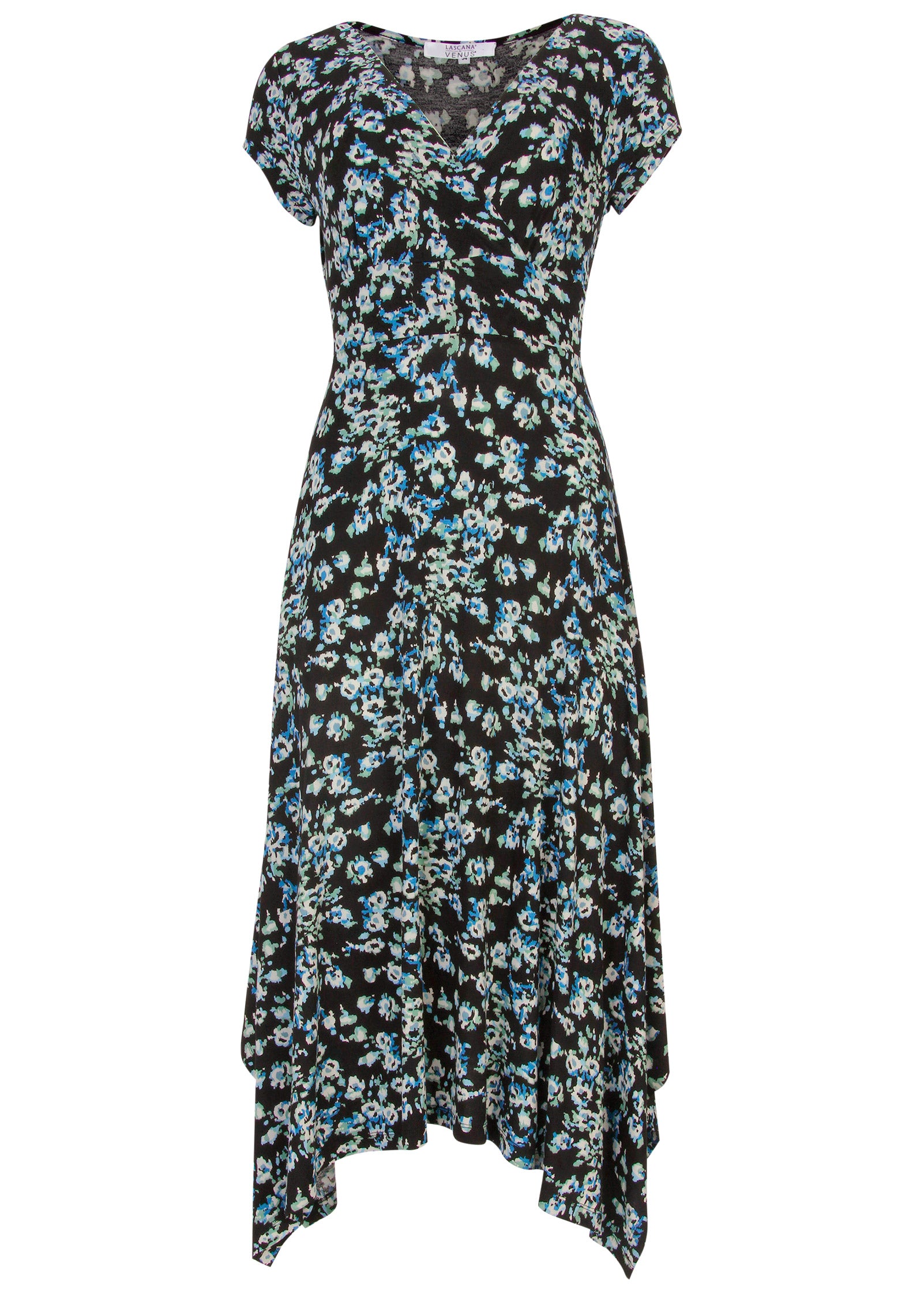 When figure-flattering surplice styling combines with vibrant florals. this timeless look results. Its asymmetrical midi-length hem and short sleeves balance the fit of this wrap-inspired midi dress. tying at the waist to accent your curves for everything from morning meetings to after-dark dinners.* Sizes: XS (2). S (4-6). M (8-10). L (12-14). XL (16) * Plus sizes: 1X (18-20). 2X (22-24). 3X (26-28)* Print placement may vary* Surplice neckline* Tie at waist* 39" approx. length; varies by size* Fabric has stretch* By Lascana for Aljck* Viscose/elastane. Imported