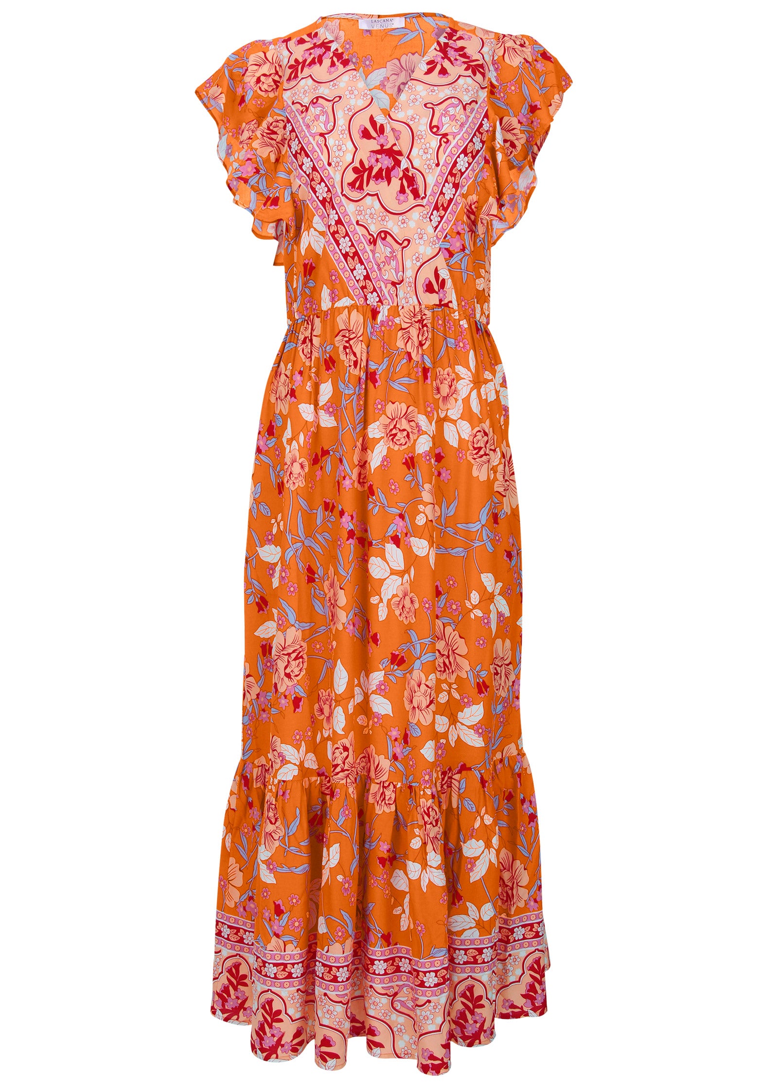 Your vacation called and it said don't forget to bring this dress. The vibrant pink-and-orange palette rivals the sunset. while the flutter sleeves and twirly hem pair perfectly with warm ocean breezes. When it's time to get away. this dress deserves to make the trip. * Sizes: XS (2). S (4-6). M (8-10). L (12-14). XL (16) * Item runs large; size down for a better fit * Wrap front * Short flutter sleeves * Tiered hem * Unlined * 53" approx. length; varies by size * By Lascana for Aljck * Fabric has stretch * Viscose. Imported