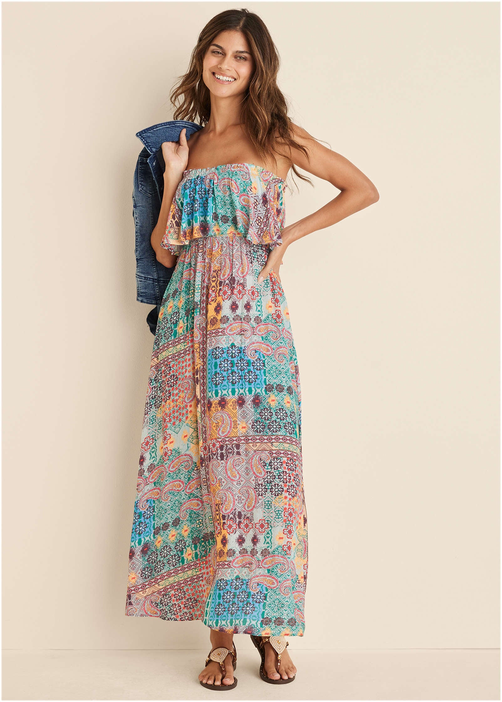This strapless maxi has all the makings of a sunny-day staple. Easy. effortless fit. flattering empire waist. vivid print: check. check annnd check. Toss this on and instantly feel like you're on vacation.* Sizes: XS (2). S (4-6). M (8-10). L (12-14). XL (16)* Strapless* Maxi length* By Lascana for Aljck* Viscose. Imported