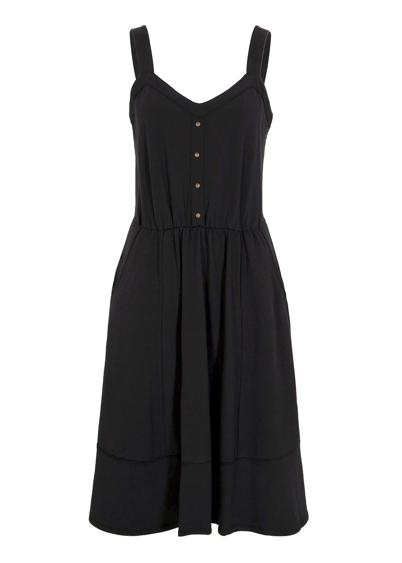 Look no further: This is the perfect everyday dress. The soft. flowy fabric and flattering V-neckline make it as comfortable as it is cute. while the button detail adds a touch of charm. Plus. side pockets? Yes. please! Whether you're running errands or heading to brunch. this dress keeps you cool and chic all day long.* Sizes: XS (2). S (4-6). M (8-10). L (12-14). XL (16)* V-neckline: A flattering cut that keeps it effortlessly feminine.* Sleeveless: Perfect for warm. sunny days.* Button detail: A charming touch for an extra bit of style.* Side pockets: Because every dress should have them!* Cotton/elastane. Imported