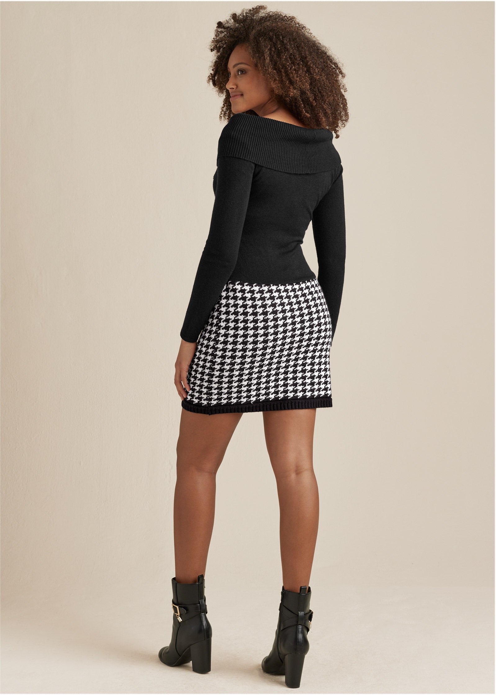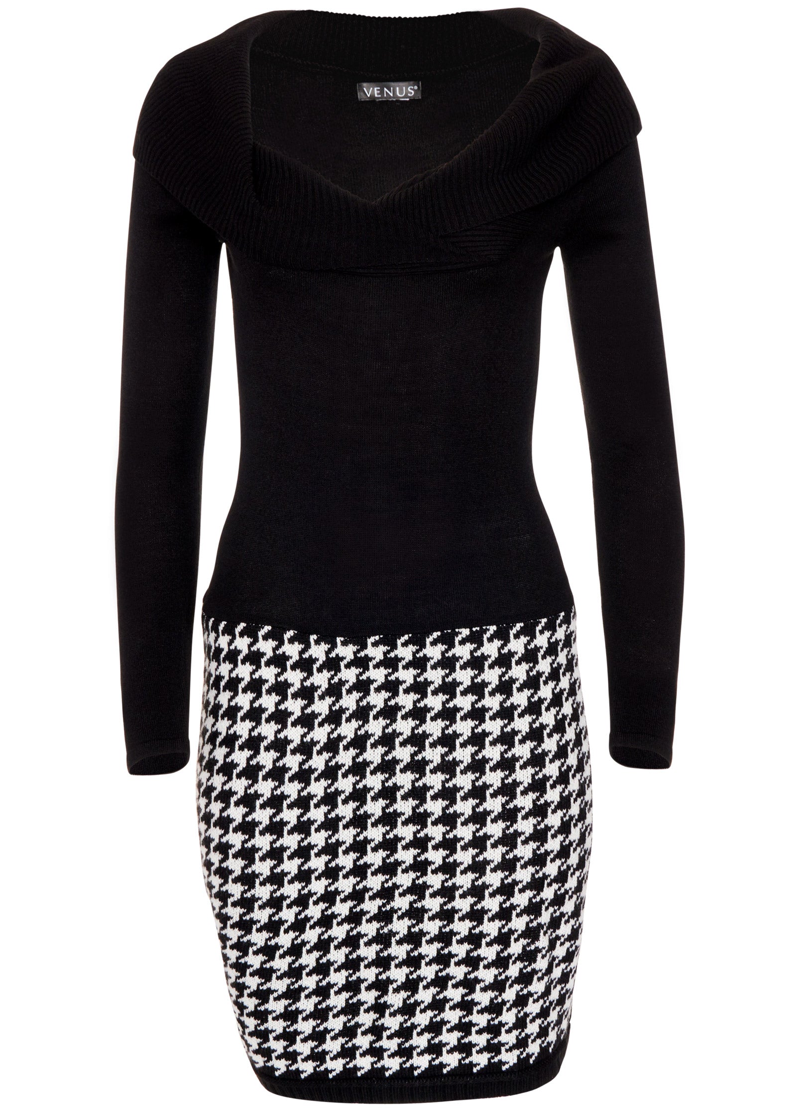 Definitely classy and just a little bit sassy. this polished sweater dress turns heads with a classic houndstooth print on the bottom. Curve hugging from top to hem with a drop waist and folded-over collar to frame your face. you'll step out feeling put-together with minimal effort.* Sizes: XS (2). S (4-6). M (8-10). L (12-14). XL (16)* Plus sizes: 1X (18-20). 2X (22-24). 3X (26-28)* Bodycon silhouette highlights your natural curves* Mock shawl neckline creates V-neck* Mini length approx. 35"* Full long sleeves* Acrylic. Imported