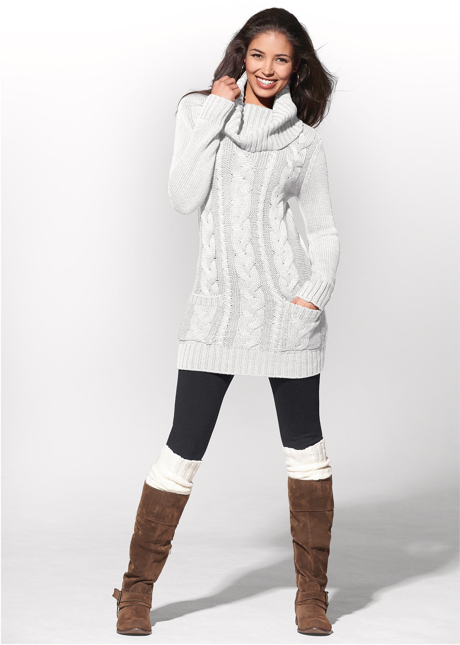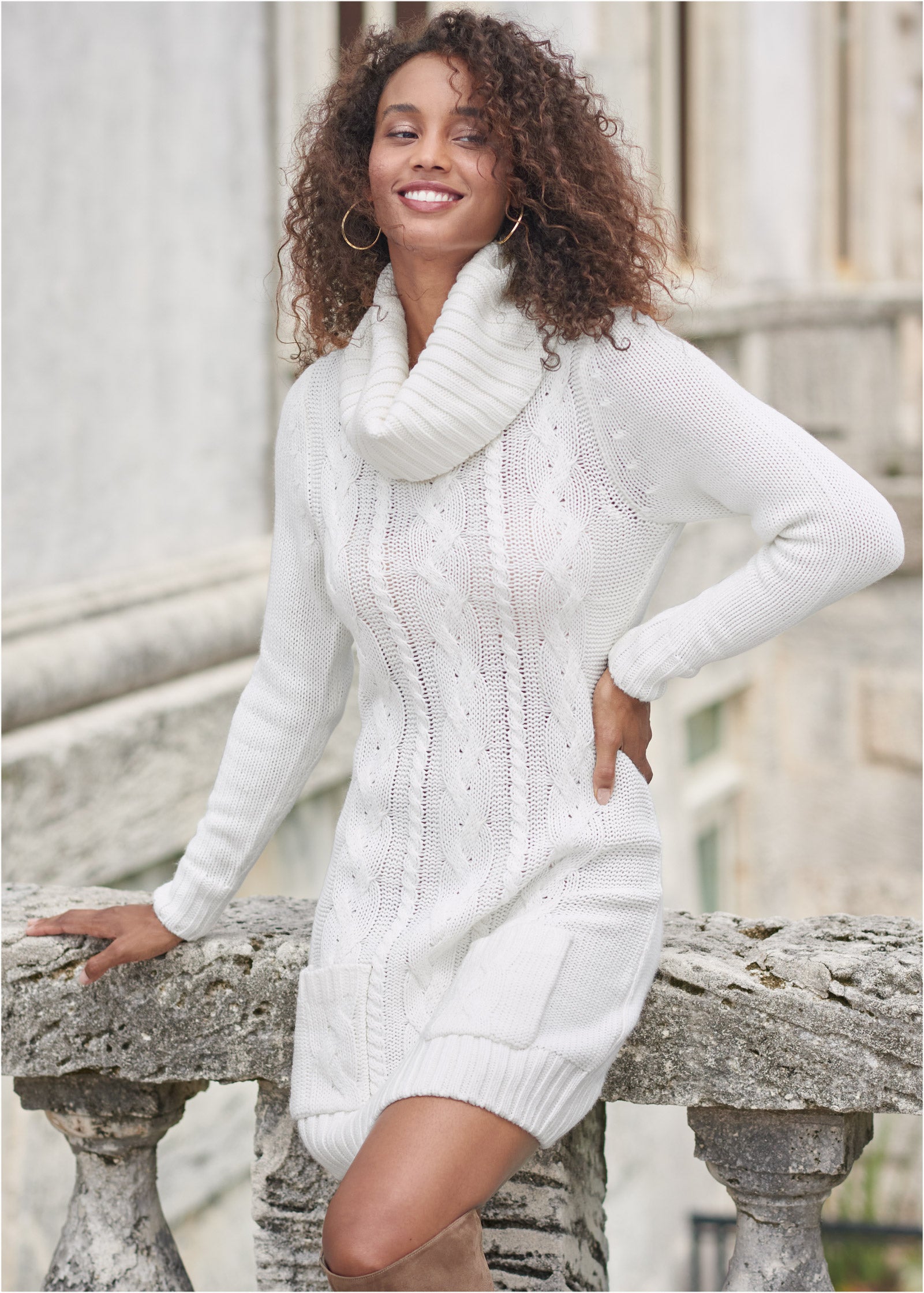 Can cold weather dressing get any easier than this Cozy Sweater Dress? With a fitted bodice and cable knit detailing. this dress beats the chill without all the bulk. The cowl neck adds an extra layer of cozy while front patch pockets give you that little something to get excited about..* Sizes: XS (2). S (4-6). M (8-10). L (12-14). XL (16)* Plus sizes: 1X (18-20). 2X (22-24). 3X (26-28)* Cowl neck* Full long sleeves* Front pockets* Mini length approx. 35"* Acrylic. Imported
