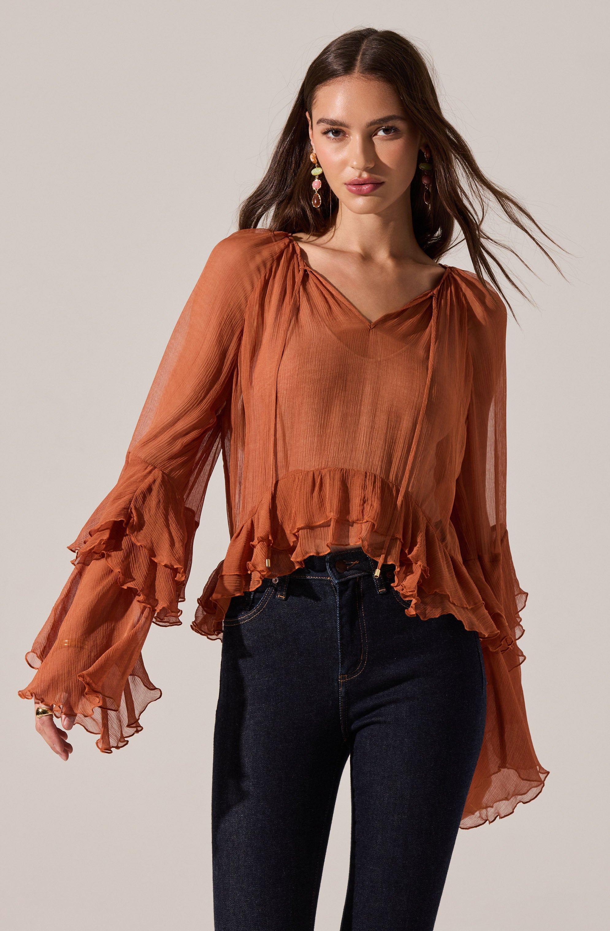 - Bell sleeves with ruffle tiers