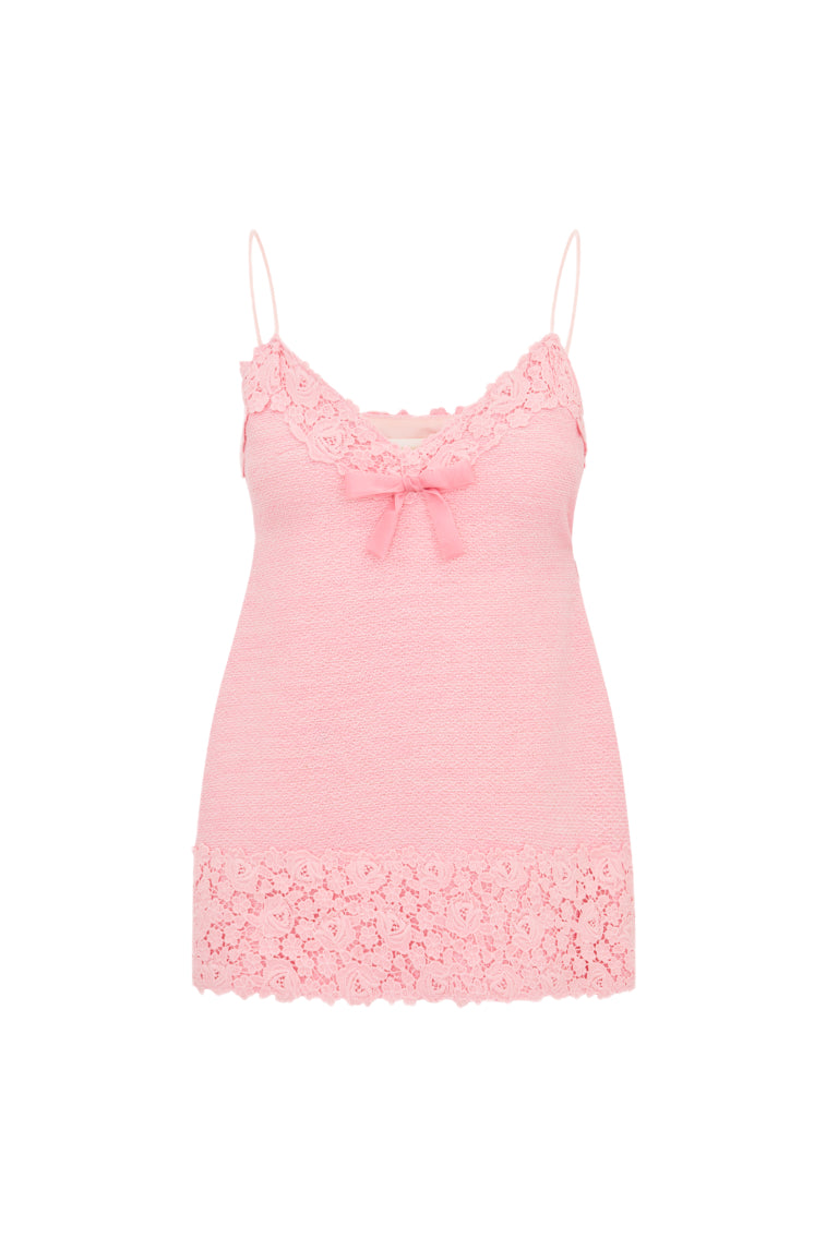 Channeling the Upper East Side energy in the Meva Dress. This preppy mini debuts with a polished. tweed fabric featuring custom ditsy floral guipure lace at the neckline and hem of the dress. The A-line mod dress begins with spaghetti straps before falling to an empire waisted above a fitted bodice. This piece is finished with a top-applied charmeuse bow at center front and a side seam zipper for functionality.
