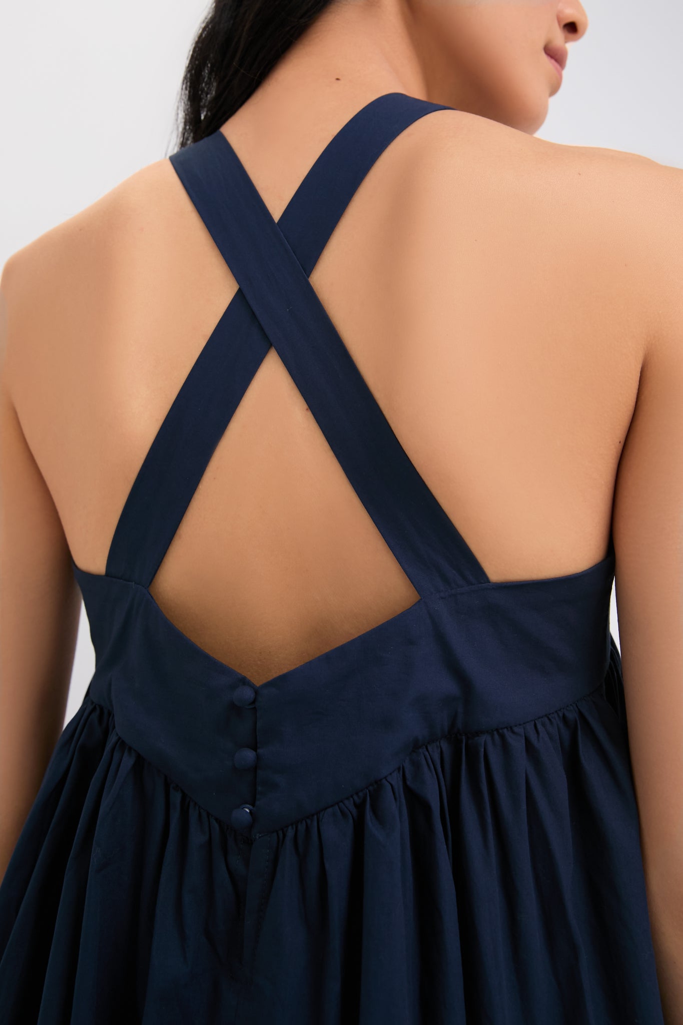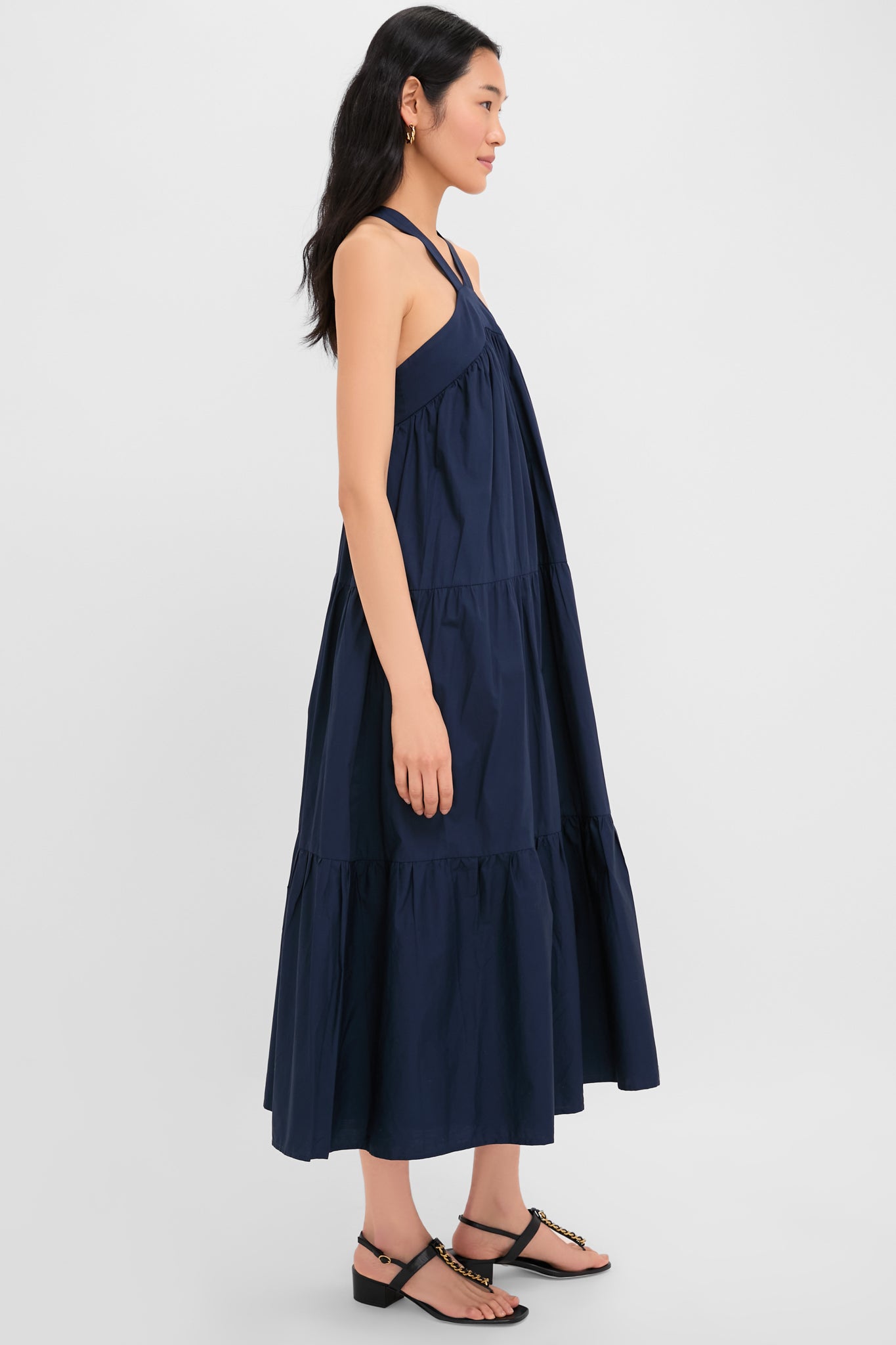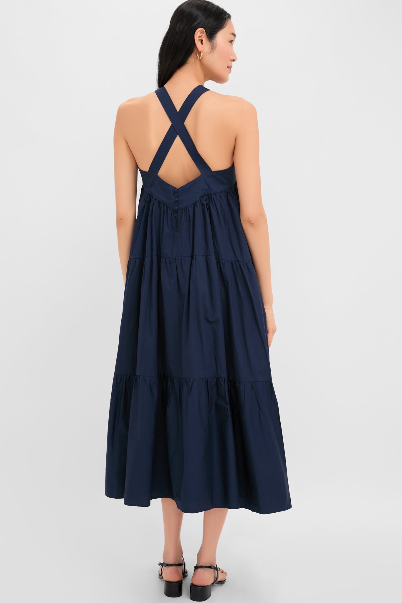 The Navy Irene Dress is effortless and oh-so-elegant. This maxi boasts a halter neckline. criss-crossed straps. and a full tiered body that will move with you every step you take. Opt for a casual look with simple sandals and a tote. or dress up with heels and accessories.