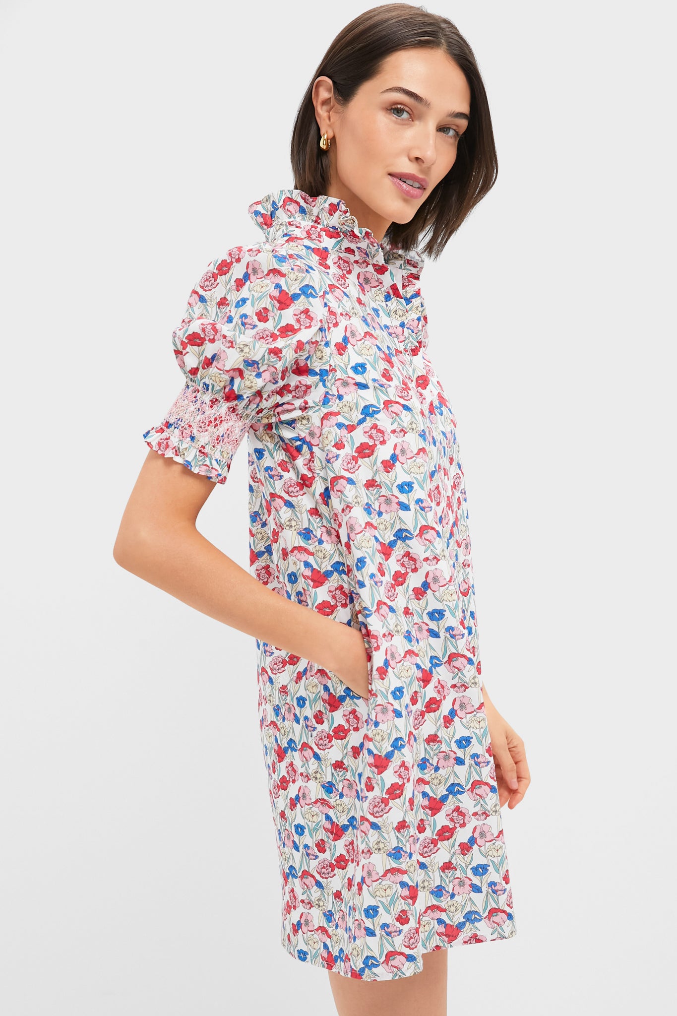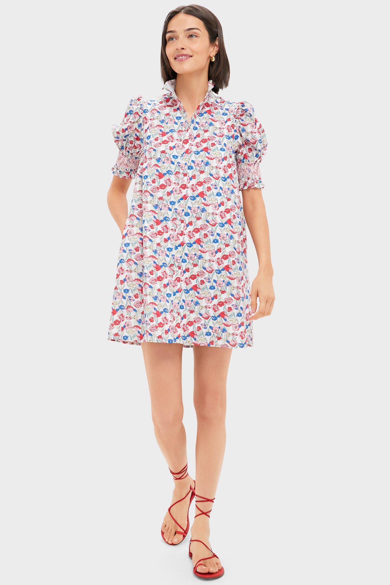 The Luisa Mini Dress is your go-to for sunny days. thanks to its vibrant red and blue clover floral print and flattering smocked puff sleeves. The ruffled collar and breezy silhouette make it perfect for brunch. beach walks. or spontaneous weekend plans. Pair with sandals or sneakers and you're instantly dressed—with zero effort.