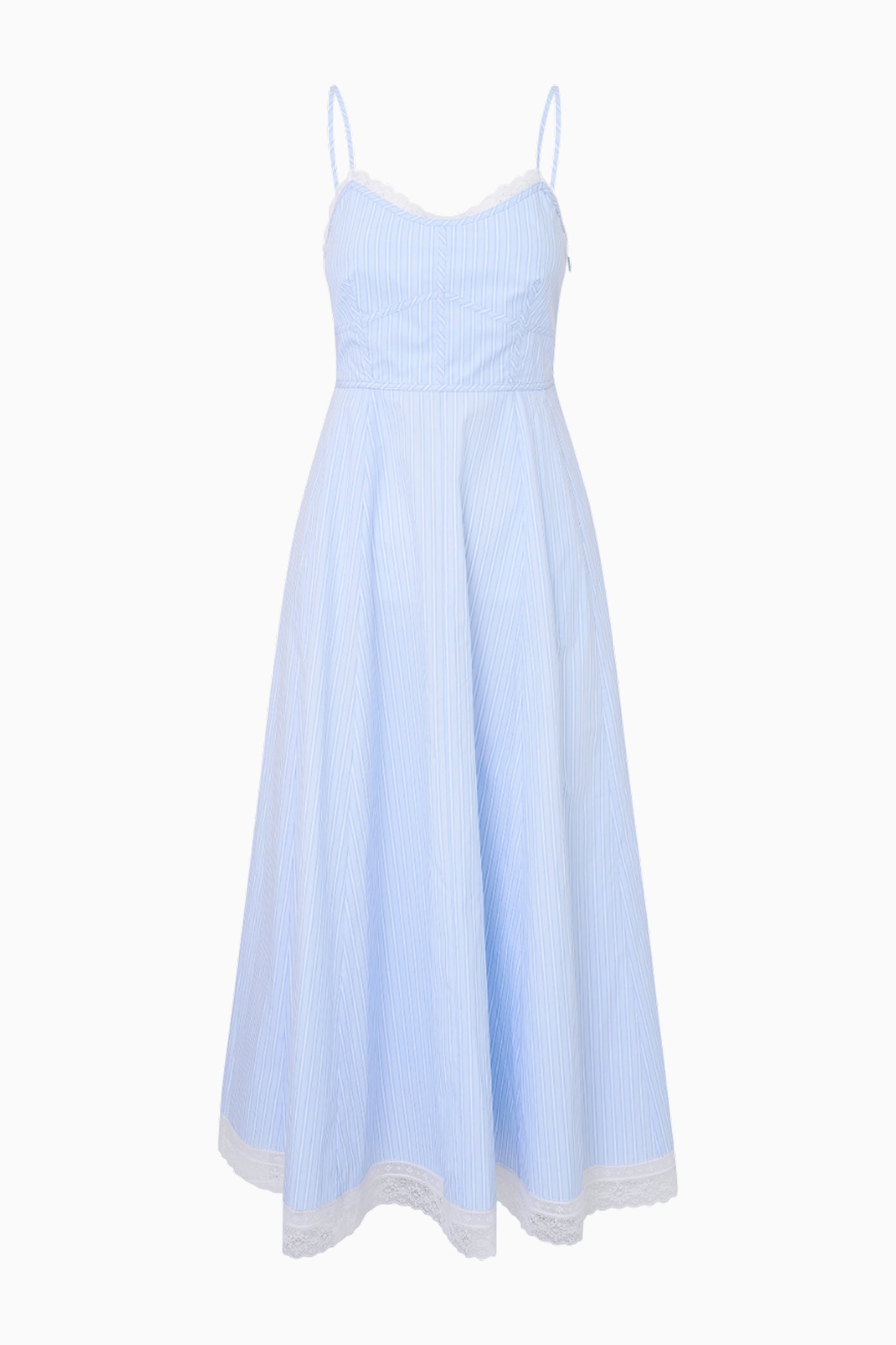 Look sweet in the Sandara Dress. This sophisticated midi dress debuts with a crisp poplin fabric with vintage-inspired laces. With an A-line silhouette. the piece begins with spaghetti straps. smocking at the back that falls to a sweepy skirt with seams giving it a flattering shape.