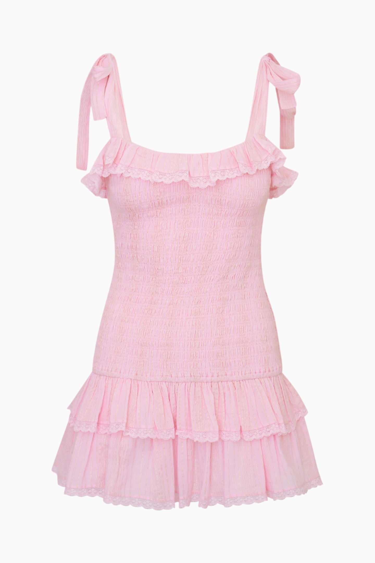 This feminine mini debuts with a cotton fabric adorned with vintage-inspired laces and embroideries. The dress begins with tank straps featuring self tie details. smocking throughout for easy pull on. and ruffle tiers at the skirt.