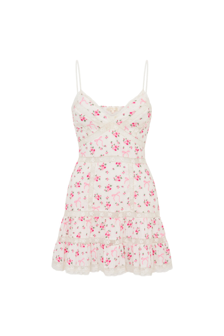 Daytime dreaming in the Solbina Dress. This charming sun dress debuts with an airy cotton fabric featuring vintage-inspired laces stripped throughout. The pretty mini begins with thin spaghetti straps above a v-neckline that flows to an empire waist with a slight cinch that releases into an airy. ruffle skirt. Smocking at the back gives this piece extra elastic and comfort.