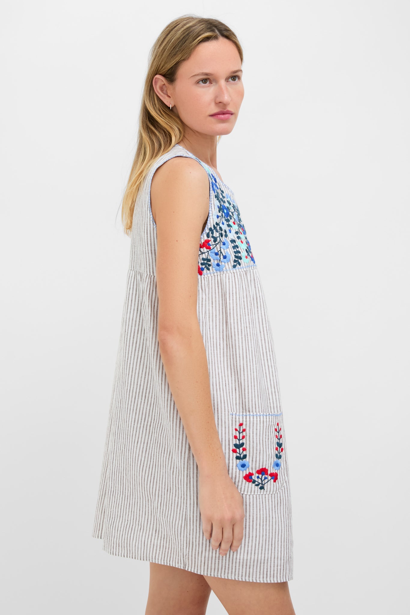 The Tan Stripe Embroidered Linen Sunny Mini Dress is a fun take on a classic style. This shift silhouette features mini length. patch pockets. and embroidery detailing throughout. This dress embodies a true throw-and-go nature. throw on with sandals or sneakers. sunnies. and a tote for all your necessities.