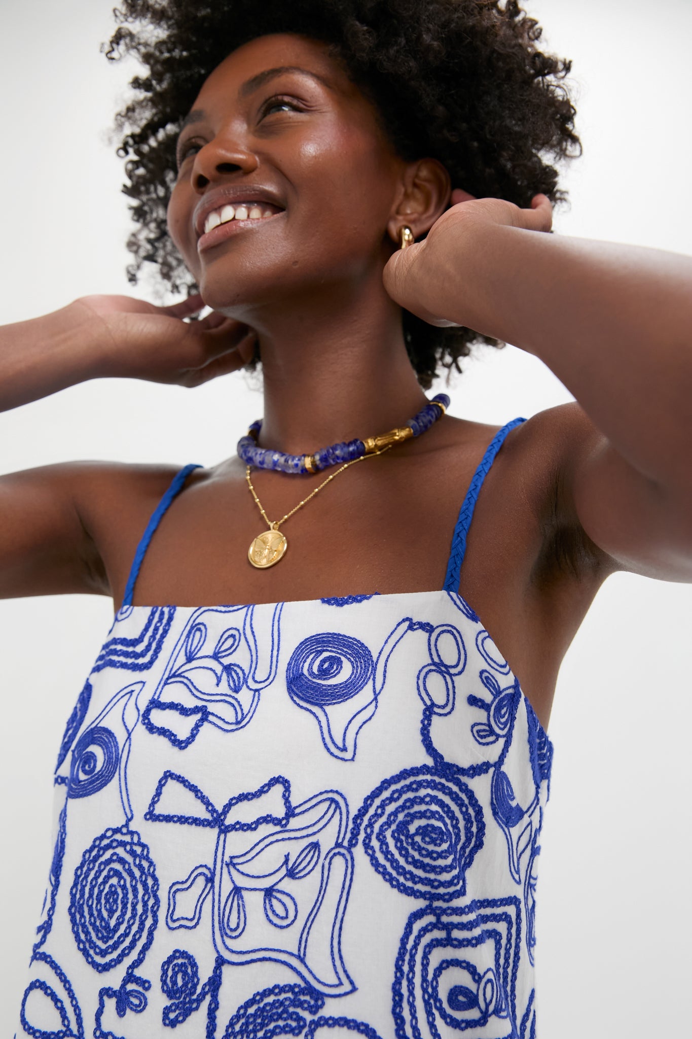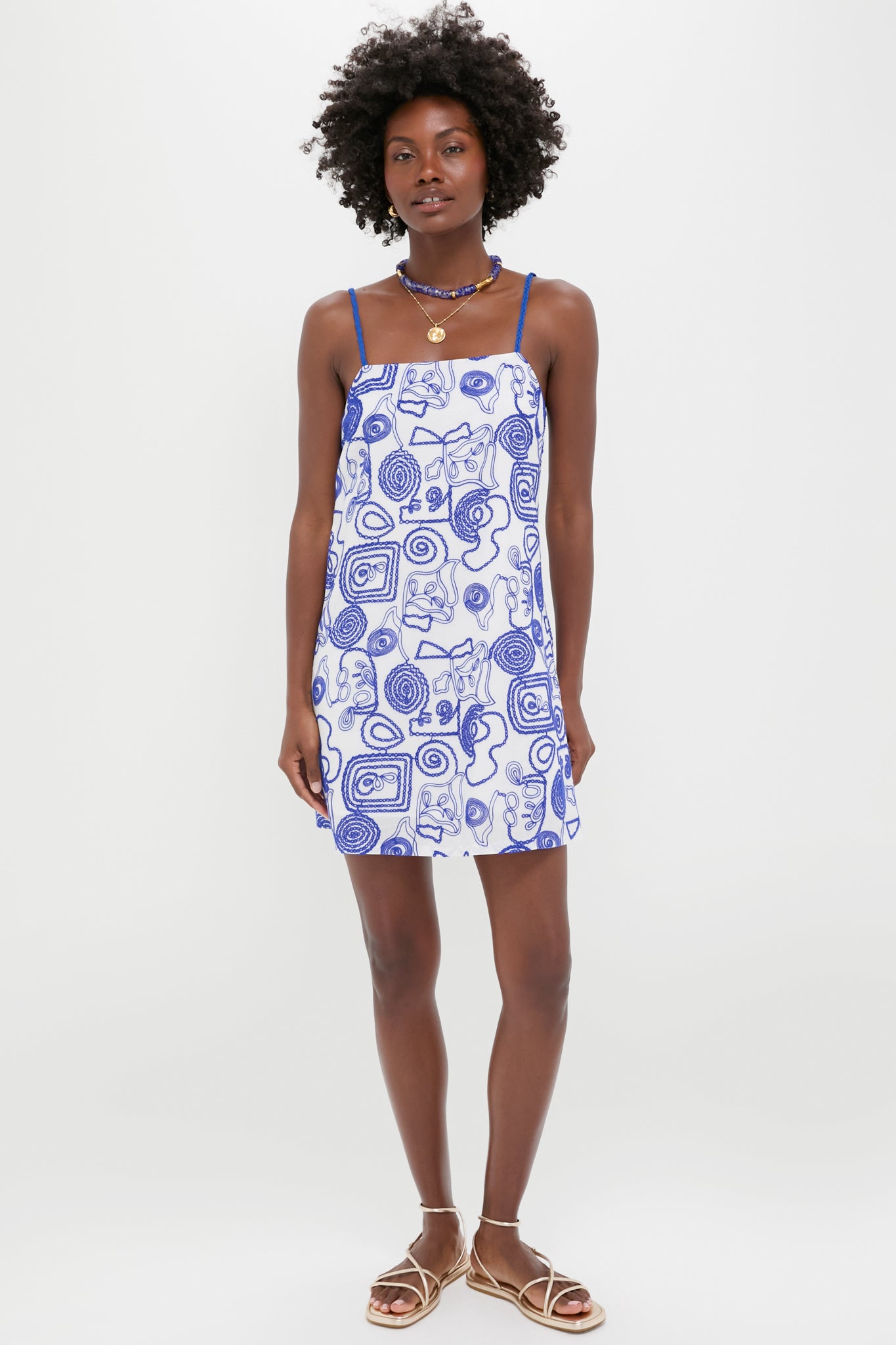The Santorini Dress boasts an easy A-line silhouette with abstract royal blue detailing throughout and adjustable braided straps. Perfect for weekend trips and shopping days. we are styling this with sandals and fun jewelry for a playful warm-weather look!