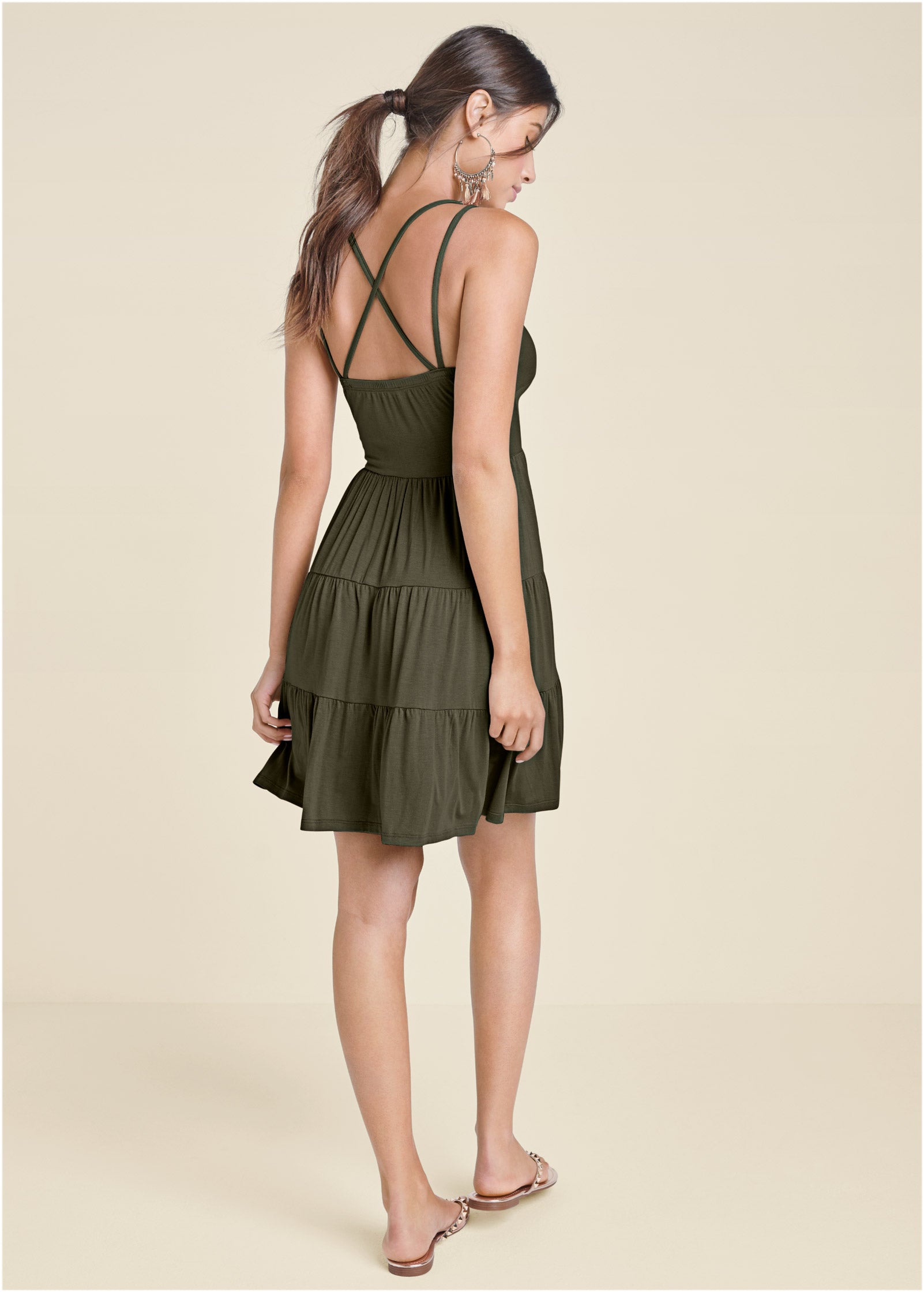 This swingy mini dress is a warm-weather essential that you'll wear over and over (and over) again! With its strappy upper back and flirty tiered skirt. this throw-on-and-go piece is certainly not short on eye-catching appeal. Throw a jean jacket over top and complete the look with casual sandals or style it for a night out with strappy wedges and statement earrings.