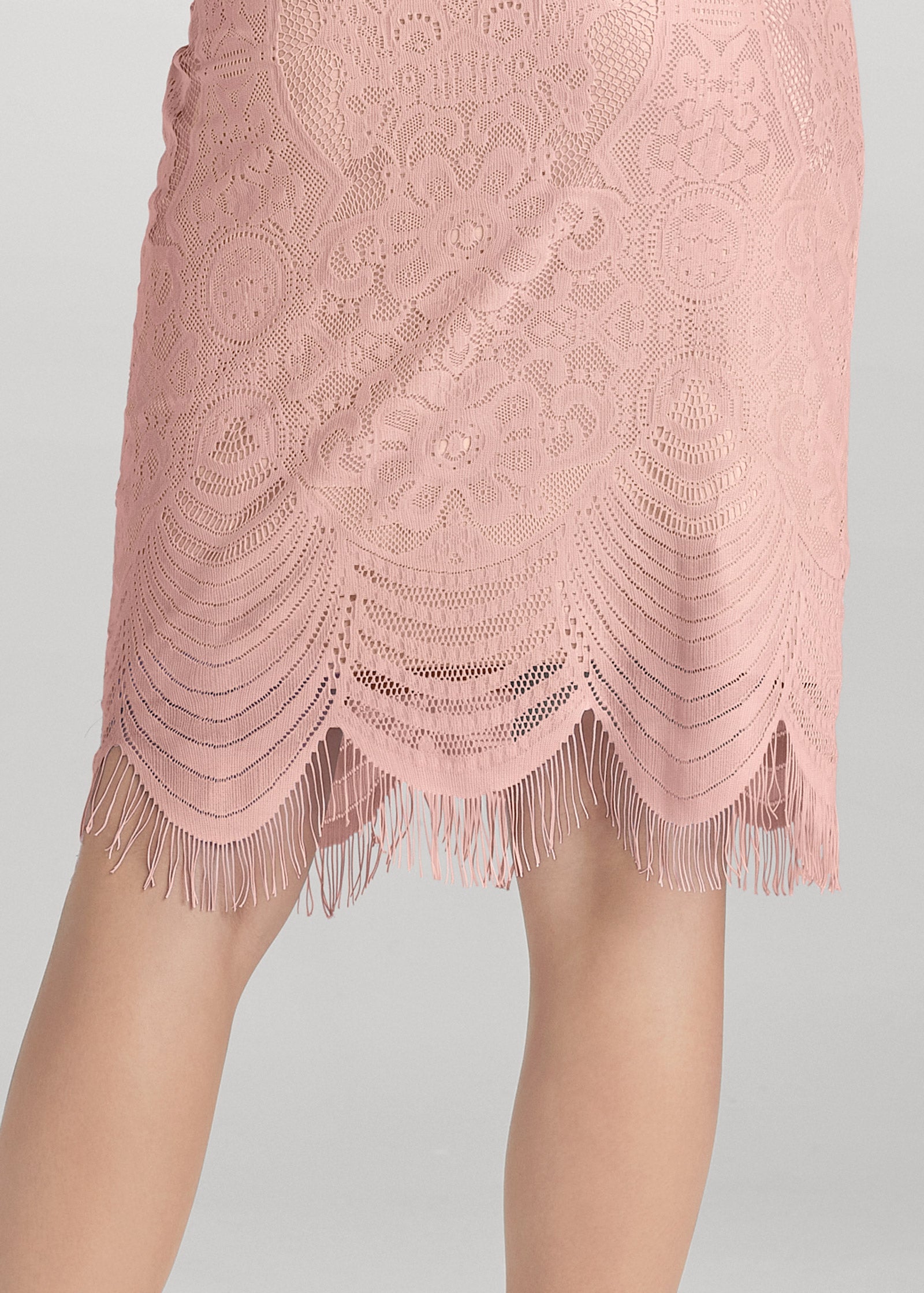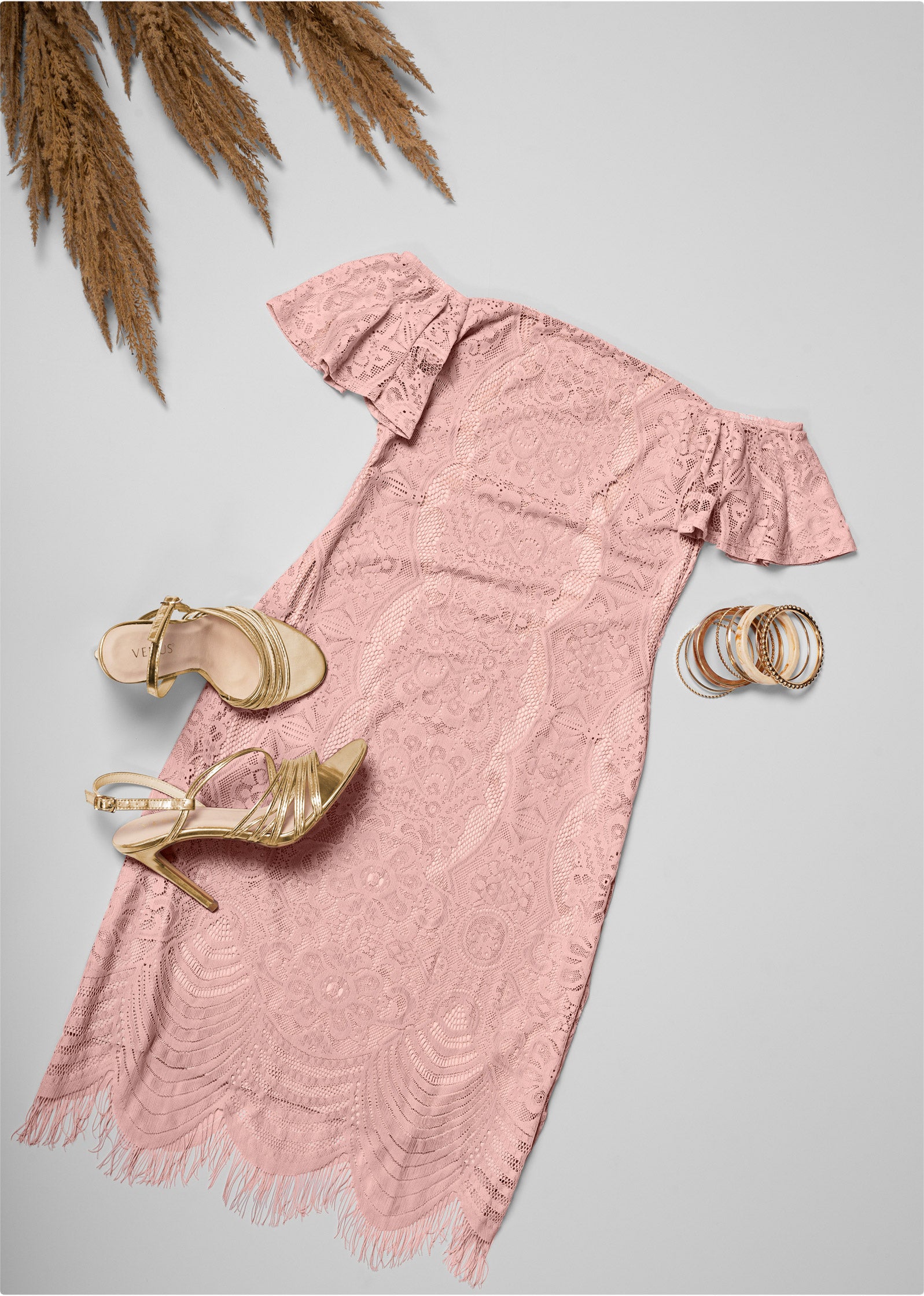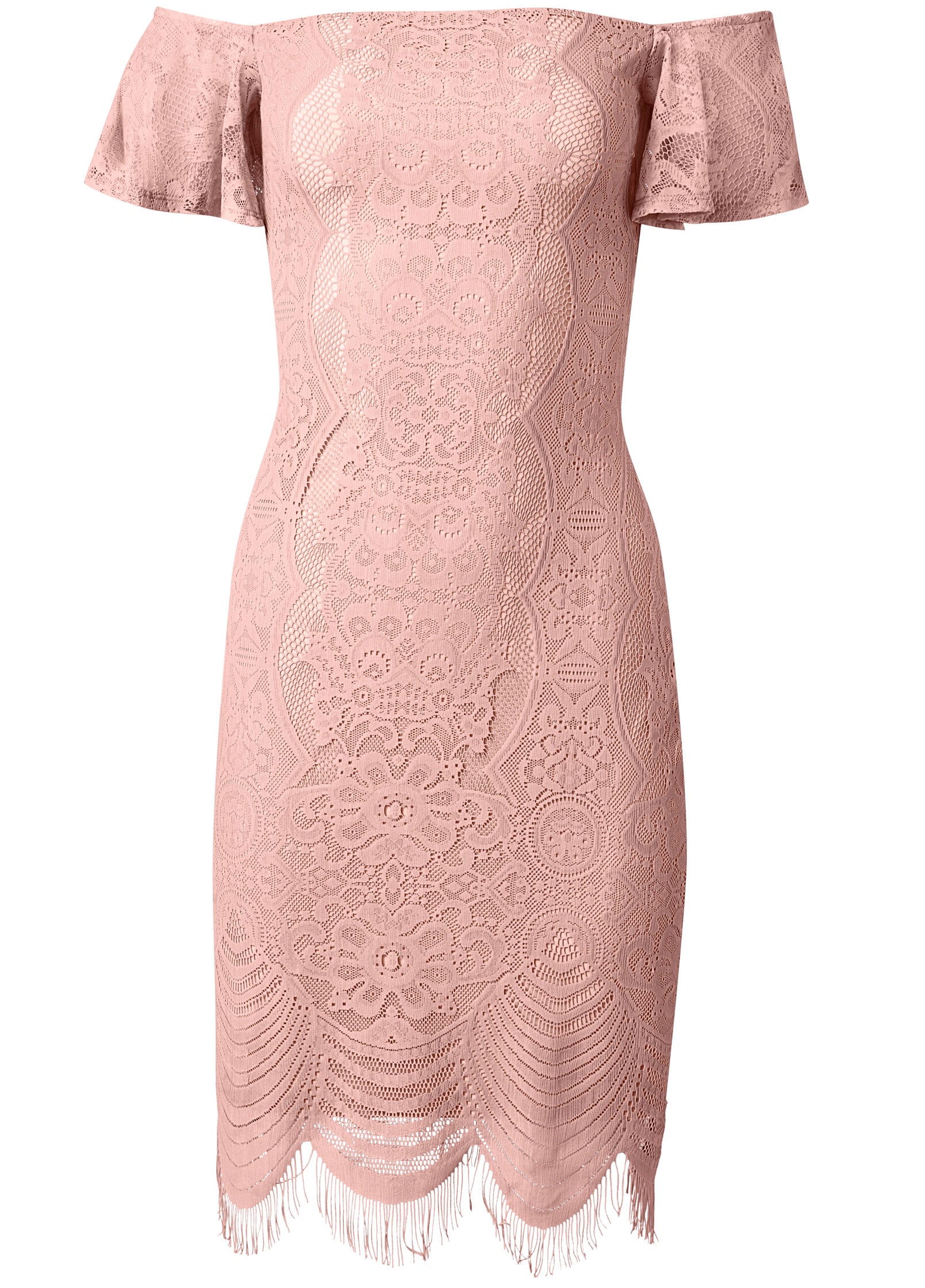 Get set for your next event in this lacy off-the-shoulder dress that'll keep the compliments coming! Ruffled short sleeves add a hint of flair to the fitted body that sits just at the knee with a scalloped hem. Eyelash lace trims the edge for a little extra flirt that twirls with you on the dance floor.* Sizes: XS (2). S (4-6). M (8-10). L (12-14). XL (16)* Allover lace* Off-the-shoulder neckline with ruffled short sleeves* Scalloped hem with eyelash lace* No closures* Fabric has stretch* Nylon/spandex with poly lining. Imported