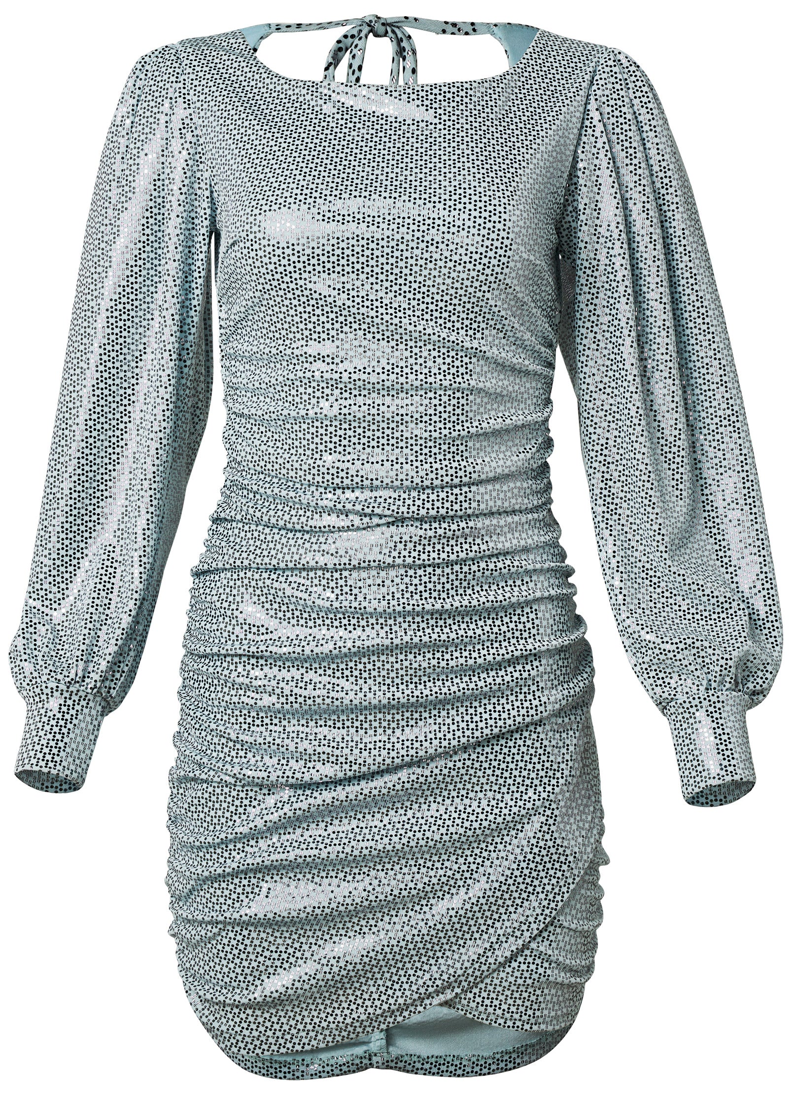 Get your shine on in this shimmer bodycon mini dress. With a fully open back that ties behind the neck. this party-ready number is full of allure with front-to-back ruching. billowy balloon sleeves and allover sequins that glimmer under the spotlight (which you're sure to steal as soon as you arrive!).* Sizes: XS (2). S (4-6). M (8-10). L (12-14). XL (16) * Plus sizes: 1X (18-20). 2X (22-24). 3X (26-28)* Dress is semi-lined* Tie back closure* Sequin detail* Fabric has stretch* Poly/spandex. Imported