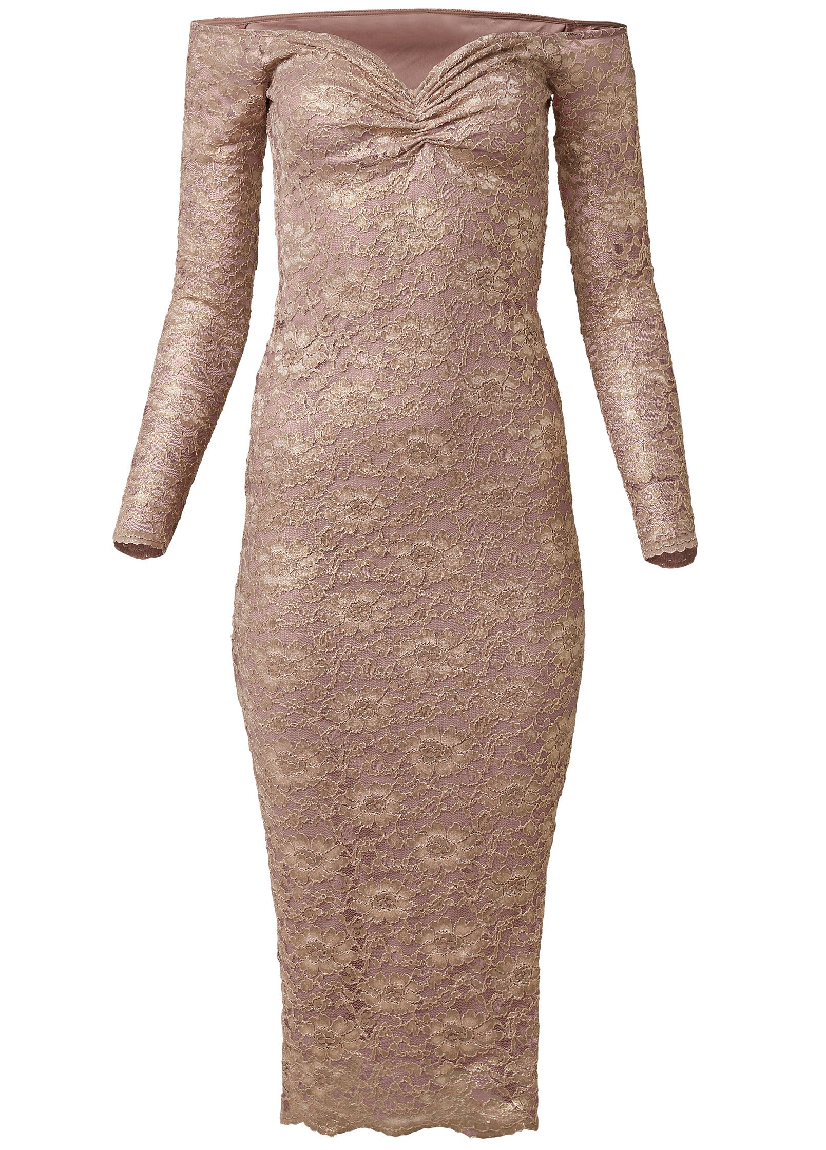 This off-the-shoulder lace midi dress shines bright on every occasion with a gold metallic sheen throughout. The bodycon silhouette with subtle side slit is lined from top to bottom. while the sheer long sleeves and romantic ruched sweetheart bust give this shimmer dress its romantic allure. * Sizes: XS (2). S (4-6). M (8-10). L (12-14). XL (16) * Plus sizes: 1X (18-20). 2X (22-24). 3X (26-28)* No closures* Shimmer fabric has stretch* Nylon/poly/spandex. Imported