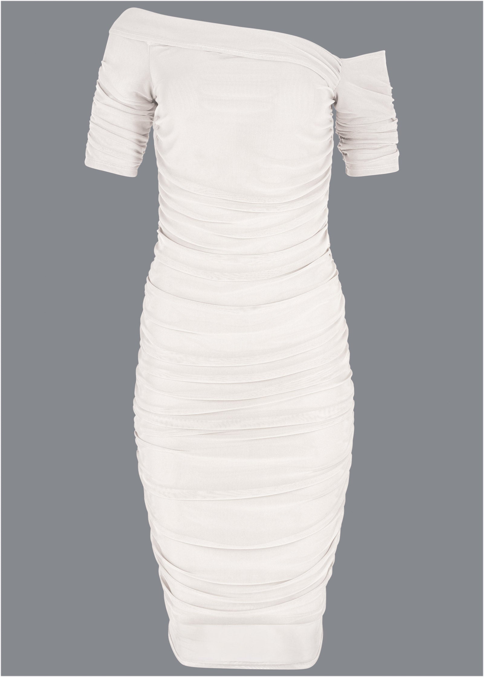 Top to bottom ruching gives your curves the love they deserve! Off-the-shoulder sleeves soften the bodycon silhouette of this dress. while the sheer mesh overlay goes a little longer than the lining to echo the femininity. Flaunt your figure in this romantic dress at your most dressed-up occasions.* Sizes: XS (2). S (4-6). M (8-10). L (12-14). XL (16)* Plus sizes: 1X (18-20). 2X (22-24). 3X (26-28)* If in between sizes. we recommend sizing down for a better fit* All-over ruched detail* Sheer mesh overlay* Body is lined* Hits below the knee 43"* Fabric has stretch* Poly/spandex with poly lining. Imported