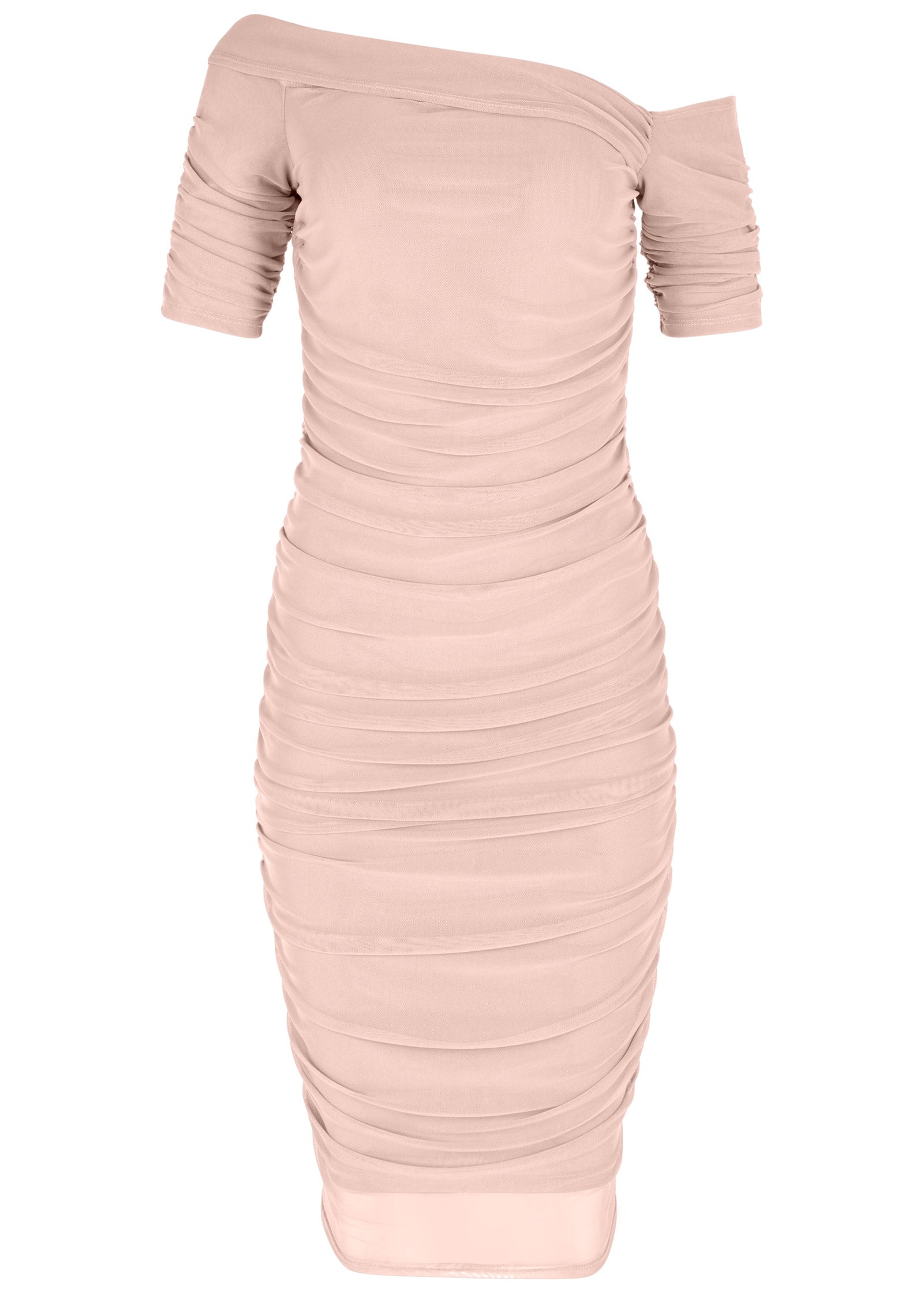 Top to bottom ruching gives your curves the love they deserve! Off-the-shoulder sleeves soften the bodycon silhouette of this dress. while the sheer mesh overlay goes a little longer than the lining to echo the femininity. Flaunt your figure in this romantic dress at your most dressed-up occasions.* Sizes: XS (2). S (4-6). M (8-10). L (12-14). XL (16)* Plus sizes: 1X (18-20). 2X (22-24). 3X (26-28)* If in between sizes. we recommend sizing down for a better fit* All-over ruched detail* Sheer mesh overlay* Body is lined* Hits below the knee 43"* Fabric has stretch* Poly/spandex with poly lining. Imported