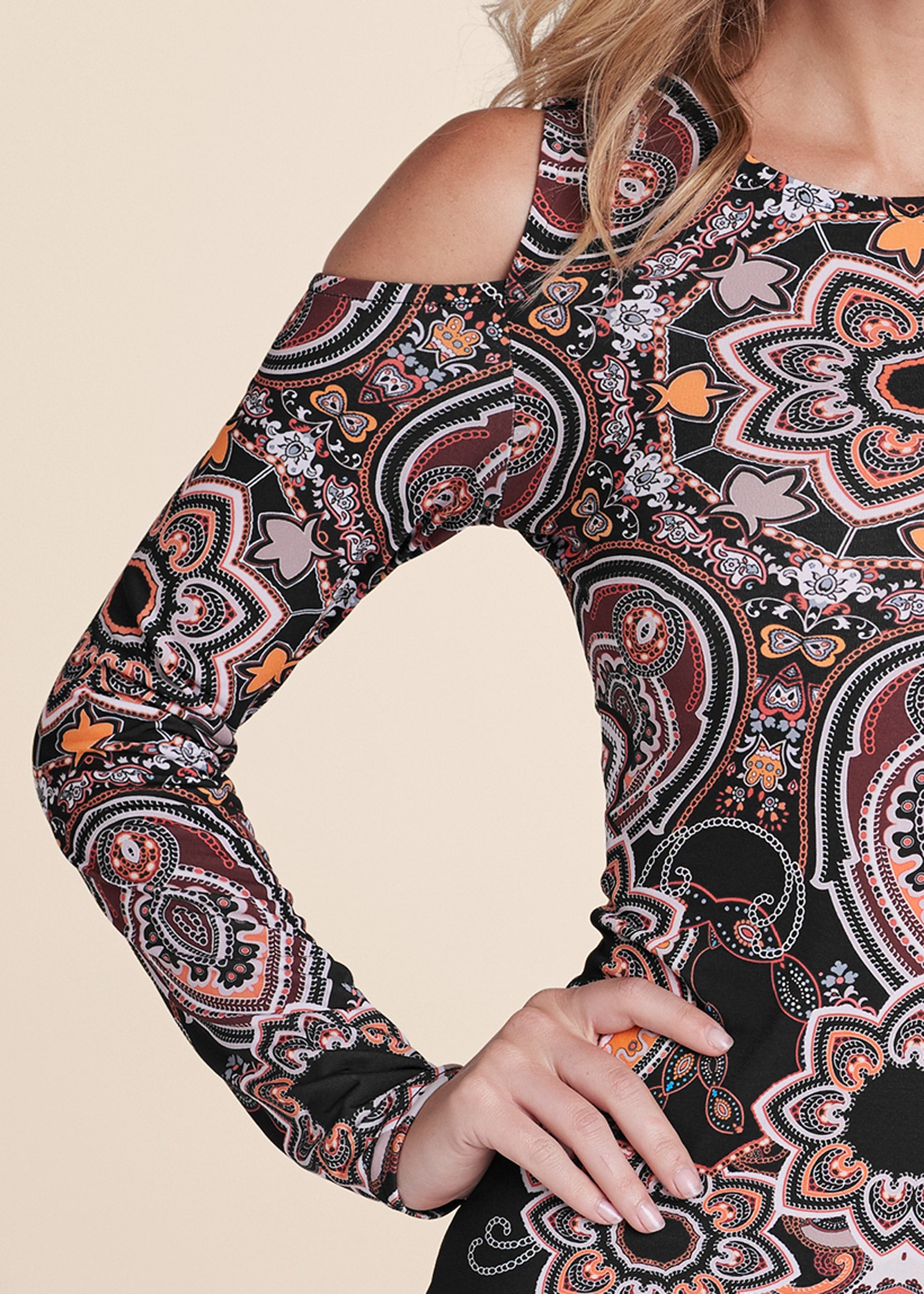 Step into this fitted. cold-shoulder mini dress and achieve a hip-hugging look you'll love! With a trendy paisley print placed strategically to show off your curves. this sleek printed short dress features a crew neckline and pairs well with booties or strappy sandals to fit your next occasion.* Sizes: XS (2). S (4-6). M (8-10). L (12-14). XL (16) * Print is placed at center front * Cold shoulders* Hits above the knee 37"* Fabric has stretch* Poly/spandex. Imported