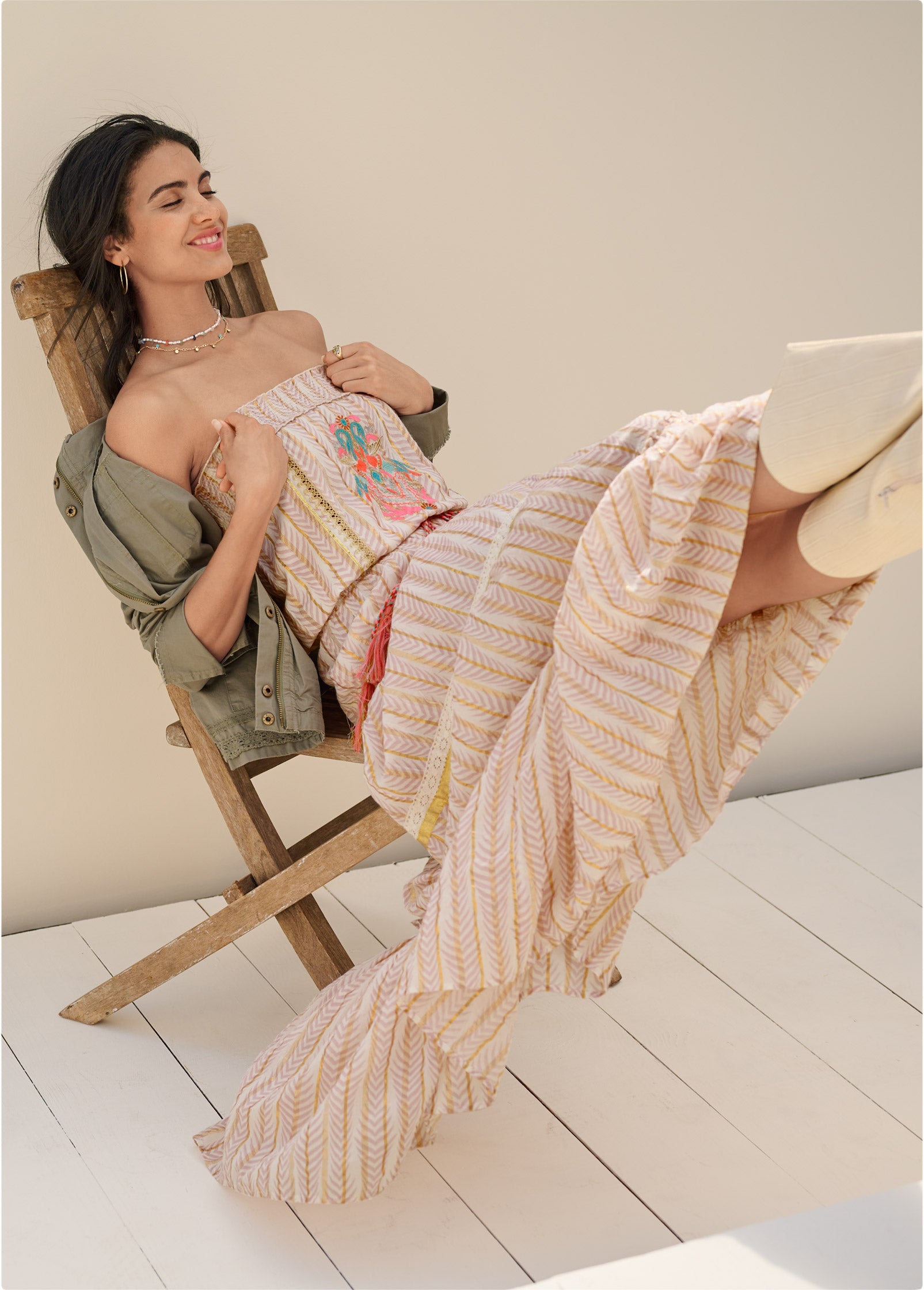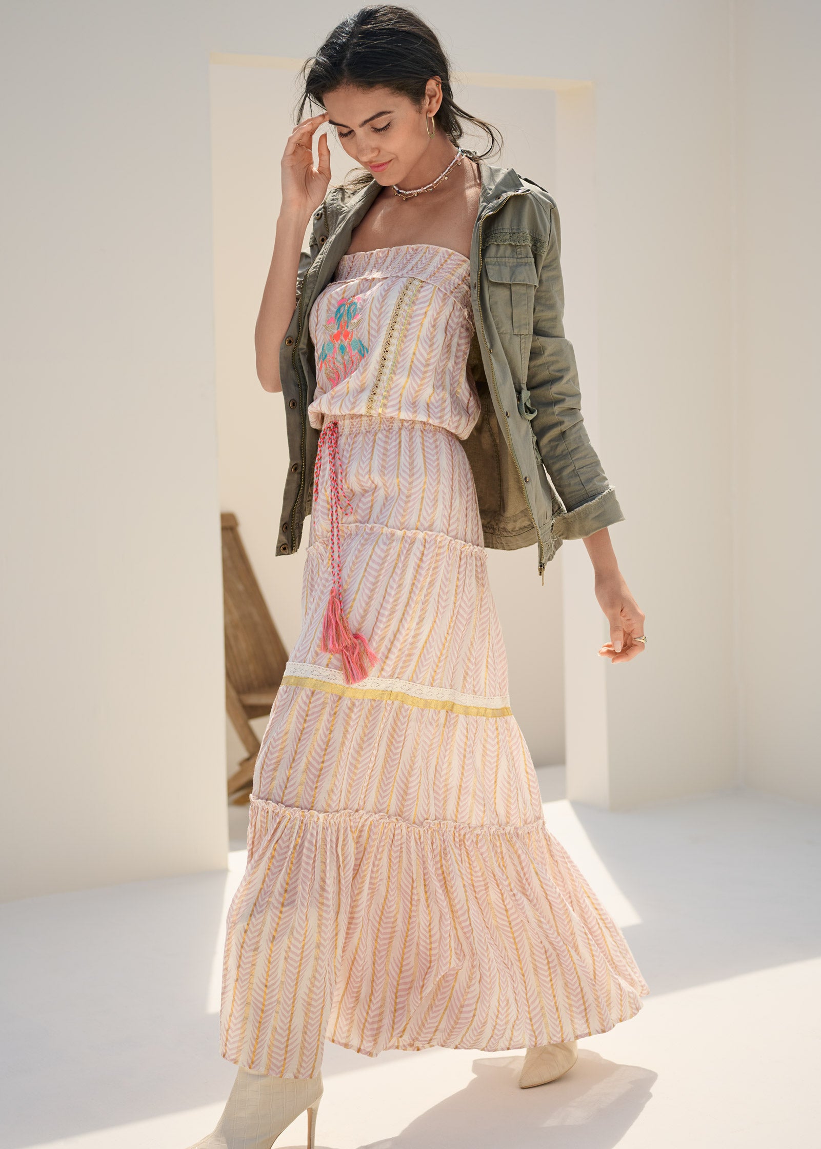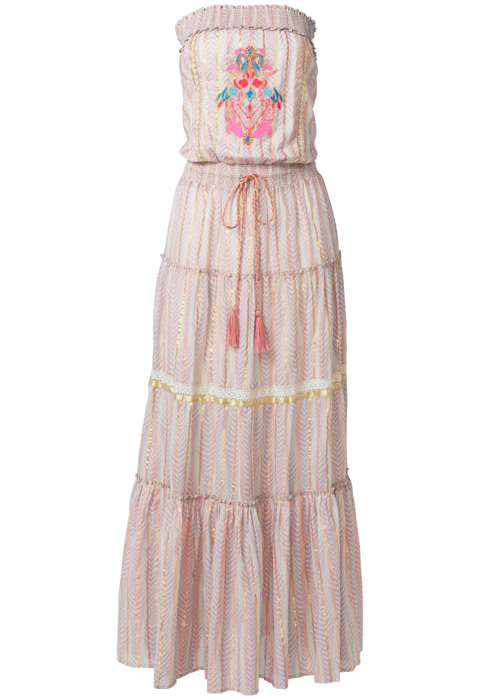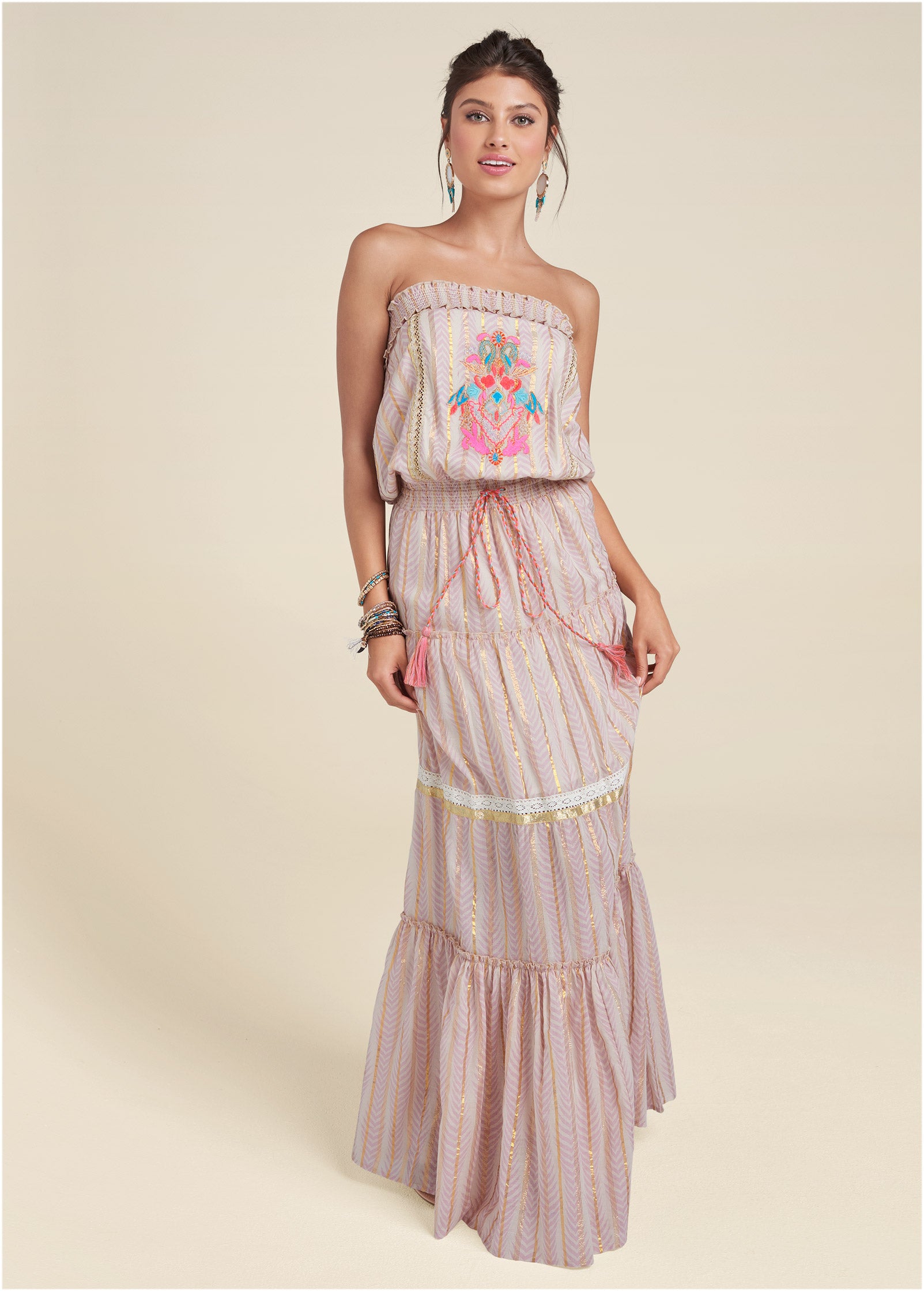 Feminine yet boho. this floaty tiered maxi is a piece you'll wear all year. This strapless style features a subtle chevron print and vertical gold-foiled stripes that add a luxe touch. Bright embroidery accents the bodice for a playful pop of color that is echoed by woven tassel-ties at the smocked waist.