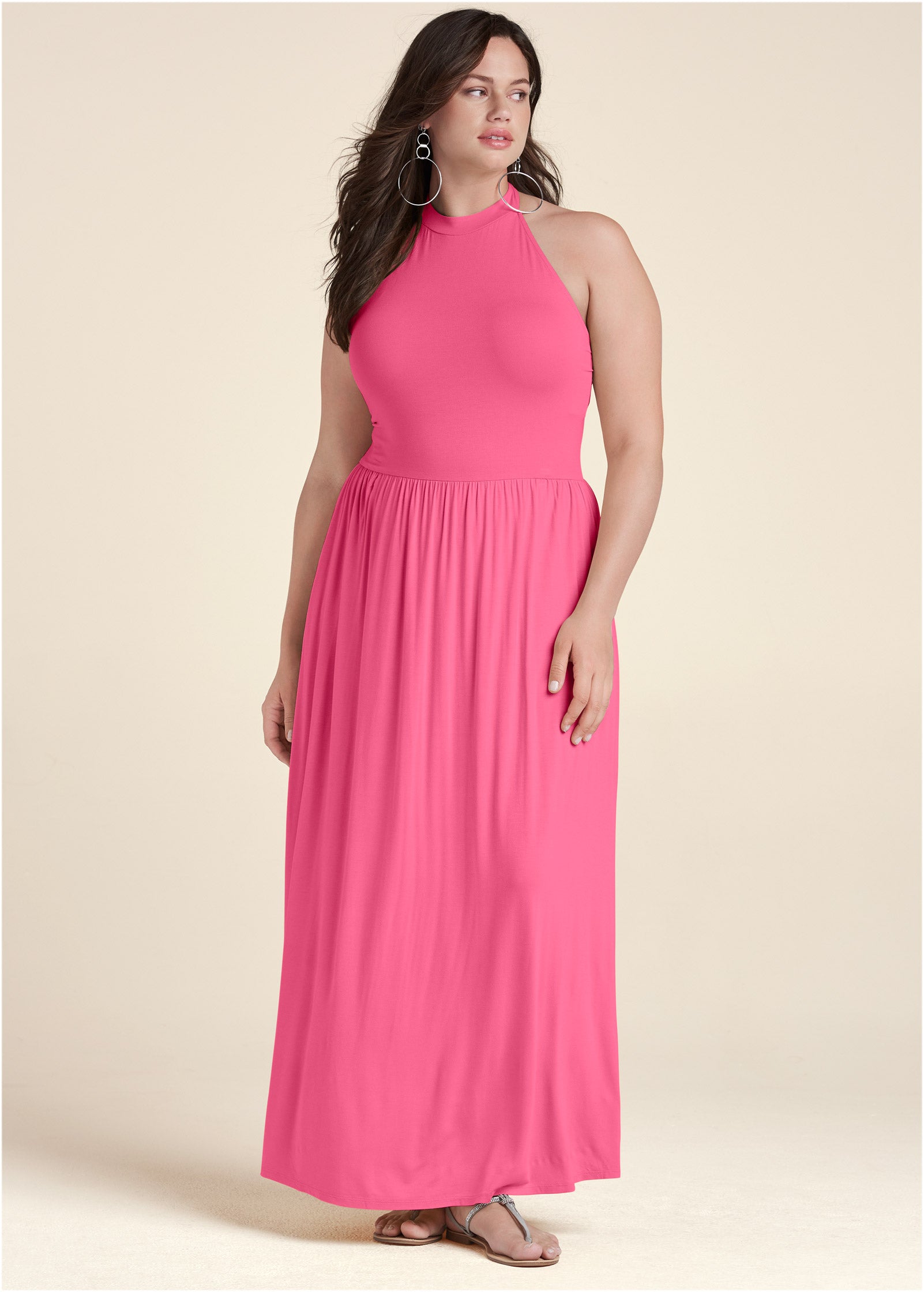 Comfy stretch fabric makes this maxi a spring to summer must-have! The high neckline and fitted bodice add coverage to the front. securing behind the neck in a halter tie. while bare shoulders and open back keep it alluringly Glamorous. Beach breezes have nothing on this easy made-for-vacay dress!* Sizes: XS (2). S (4-6). M (8-10). L (12-14). XL (16)* Plus sizes: 1X (18-20). 2X (22-24). 3X (26-28)* Halter tie neckline* Side seam pockets* 53" maxi length* Fabric has stretch* Viscose/spandex. Imported