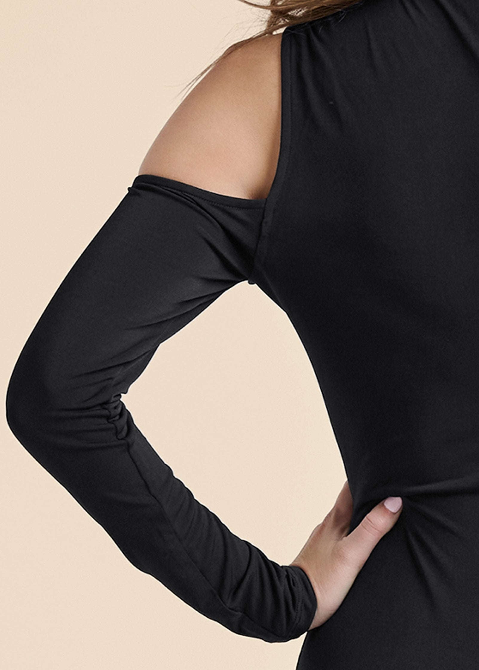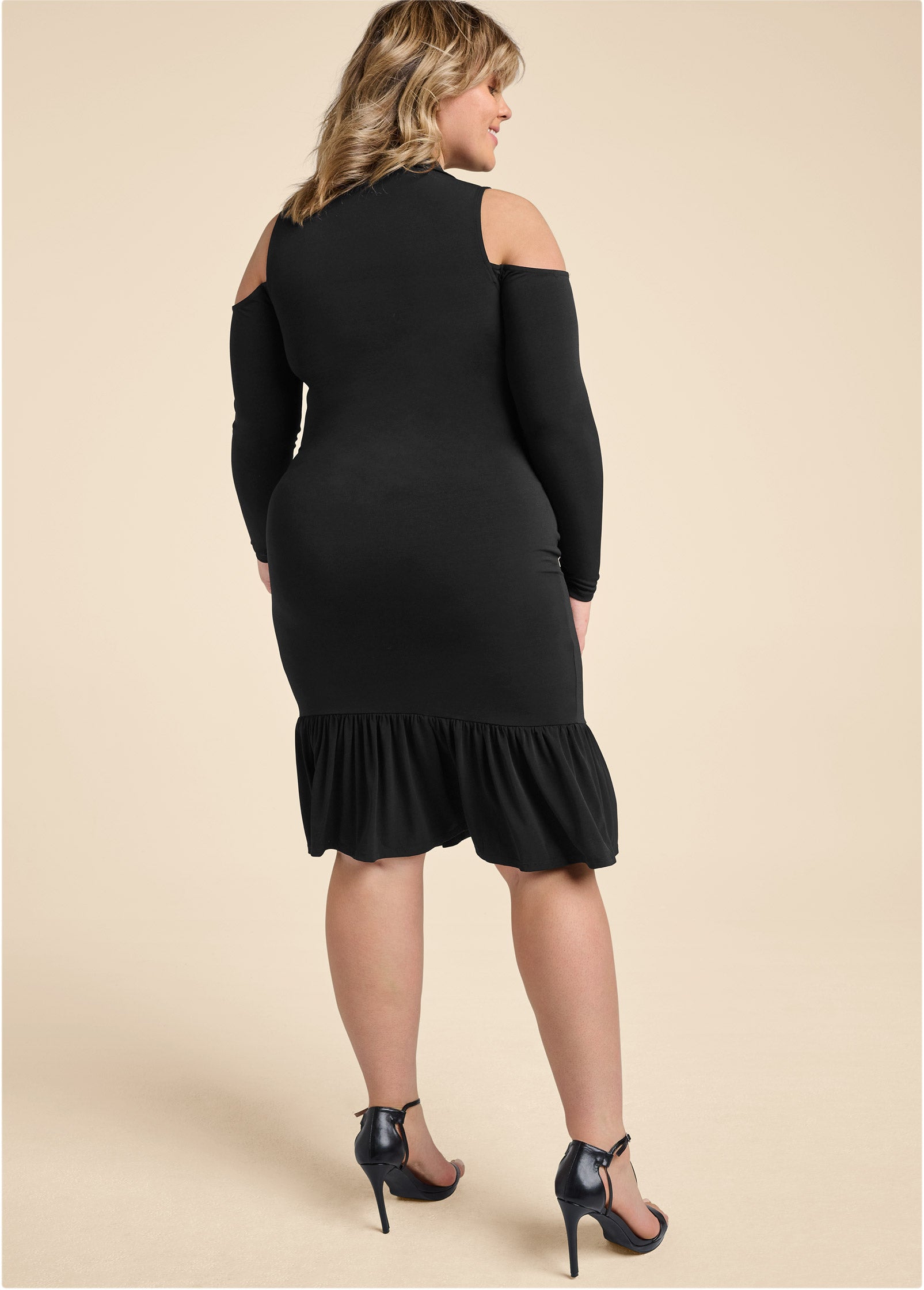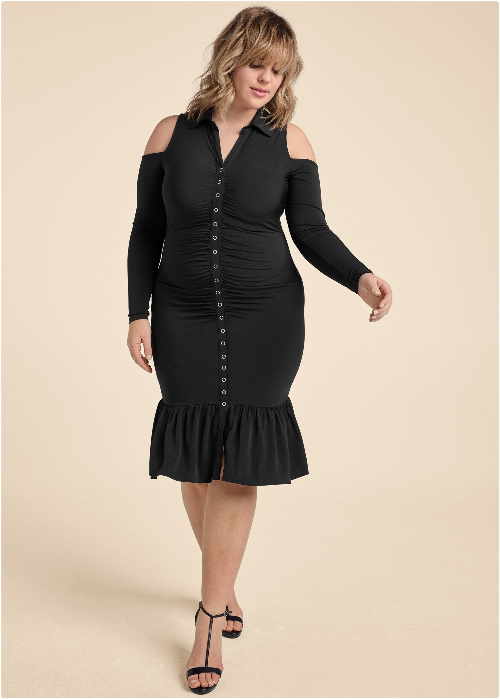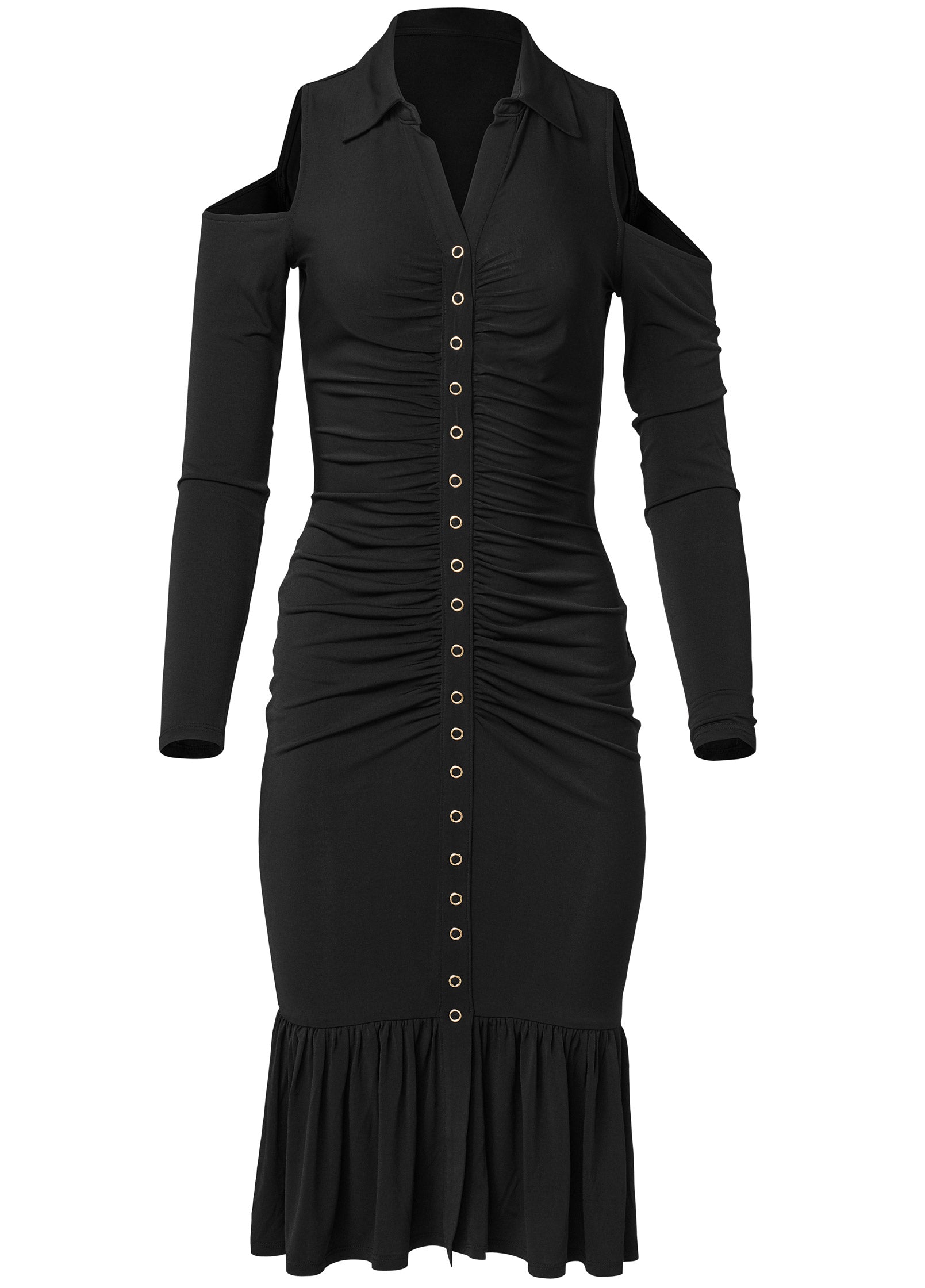 Dressing to impress or dressing for success. this Glamorous yet sophisticated dress excels at both. Layer under a blazer for a toned-down daytime look. then later reveal the flirty cold shoulders (and. if you're feeling daring. snap open a few buttons up top) for chic. evening-ready allure.* Sizes: XS (2). S (4-6). M (8-10). L (12-14). XL (16)* Plus sizes: 1X (18-20). 2X (22-24). 3X (26-28)* Functional snap button closure* Cold-shoulder details* Flared skirt detail* Hits below the knee 43"* Fabric has stretch* Poly/spandex. Imported