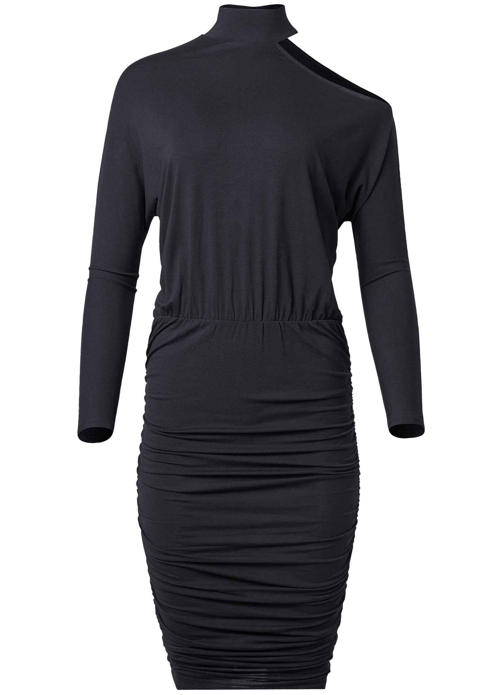 Ruched skirt meets blousy bodice in this midi dress to create a Glamorous and sleek balance! The mock neck gives coverage that contrasts the open shoulder. hinting at your sultry side before transitioning into fitted long sleeves. The back keyhole plays up your flirt whether paired with heels or booties.* Sizes: XS (2). S (4-6). M (8-10). L (12-14). XL (16) * Plus sizes: 1X (18-20). 2X (22-24). 3X (26-28)* For printed items; placement may vary* Bodycon skirt with ruching* Blouson bodice* Mock neck* Shoulder cutout* Keyhole at back* Belt not included* Hits at the knee 42"* Fabric has stretch* Viscose/spandex. Imported
