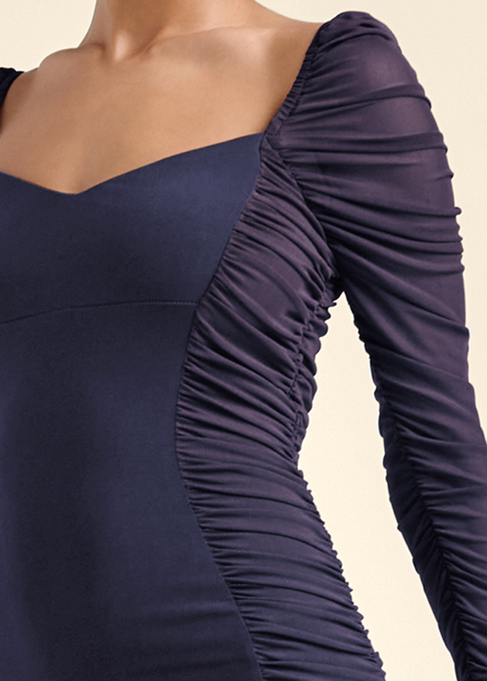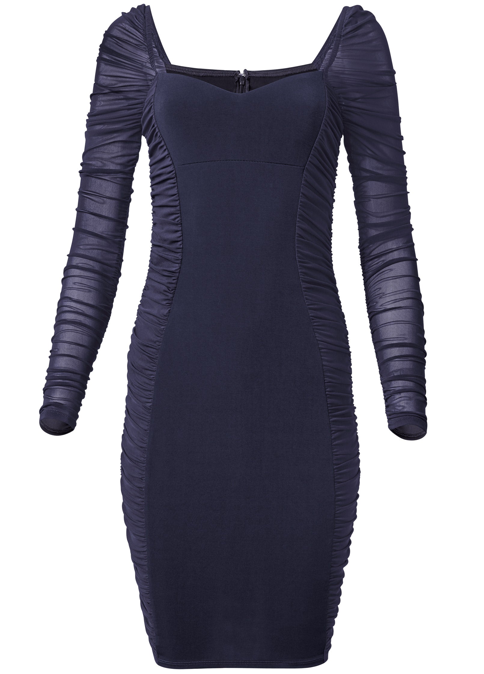 This ruched bodycon dress flaunts a flirty conceal-and-reveal design featuring lined. ruched mesh hugging your shape on each side and sheer mesh long sleeves. The sweetheart neckline and lower squared-off back play up this feminine knee-length dress. which closes with a subtle zipper in the back.* Sizes: XS (2). S (4-6). M (8-10). L (12-14). XL (16)* Plus sizes: 1X (18-20). 2X (22-24). 3X (26-28)* Zip-back closure* 37" approx. length* Fabric has stretch* Poly/spandex. Imported