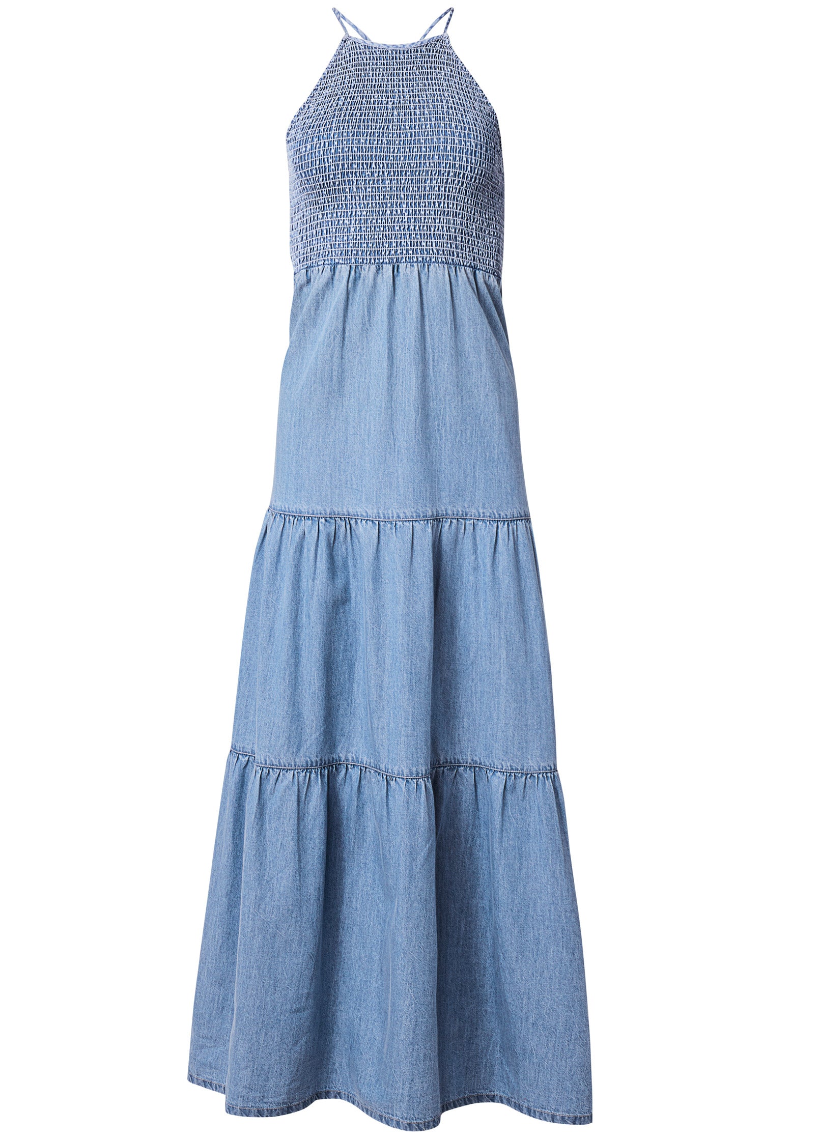 We're feeling blue but in a good way thanks to chambray! This maxi dress achieves easy boho vibes with its long tiered skirt. Smocking creates a fitted upper bodice with a high neck. secured with adjustable straps that crisscross in the back. You'll be reaching for this pull-on chambray dress on repeat!* Sizes: XS (2). S (4-6). M (8-10). L (12-14). XL (16) * Plus sizes: 1X (18-20). 2X (22-24). 3X (26-28)* Adjustable spaghetti straps crisscross at back* Smocked high-neck bodice* Tiered skirt* No closures* Maxi 58"* Fabric has some stretch* Cotton. Imported