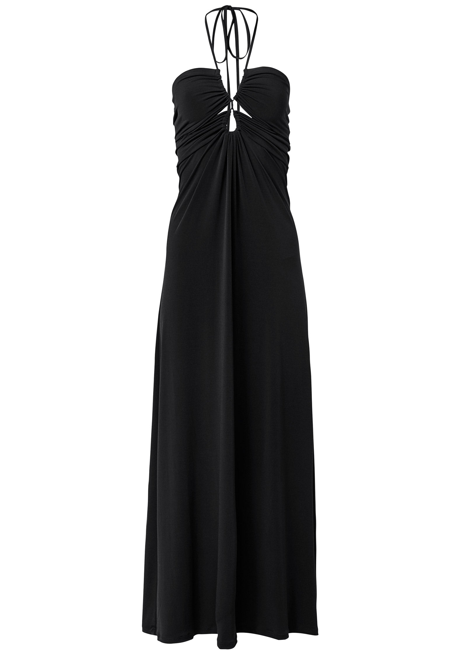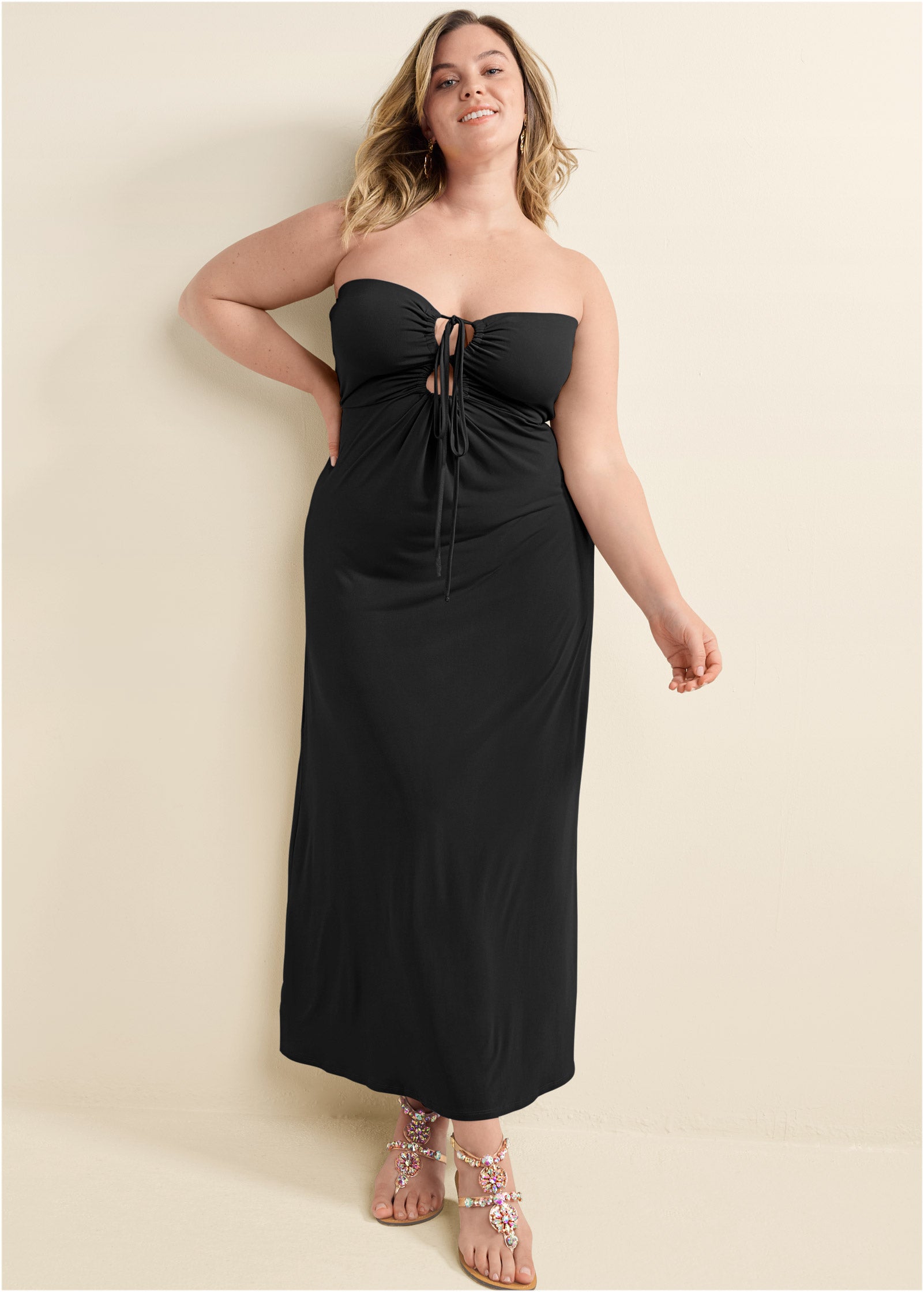 Halter neck or strapless? The choice is yours in this Convertible Maxi Dress! The front spaghetti tie can secure around the neck. or it can create a bow in front that cinches the two cutouts at the bust. Flattering gathers at the bodice give way to the looser skirt. giving a floaty feel to the silhouette.* Sizes: XS (2). S (4-6). M (8-10). L (12-14). XL (16) * Plus sizes: 1X (18-20). 2X (22-24). 3X (26-28)* Can be worn as halter neck or strapless* Two keyholes at front that cinch to create gathers* 48" approx. length; varies by size* Fabric has stretch* Poly/elastane. Imported