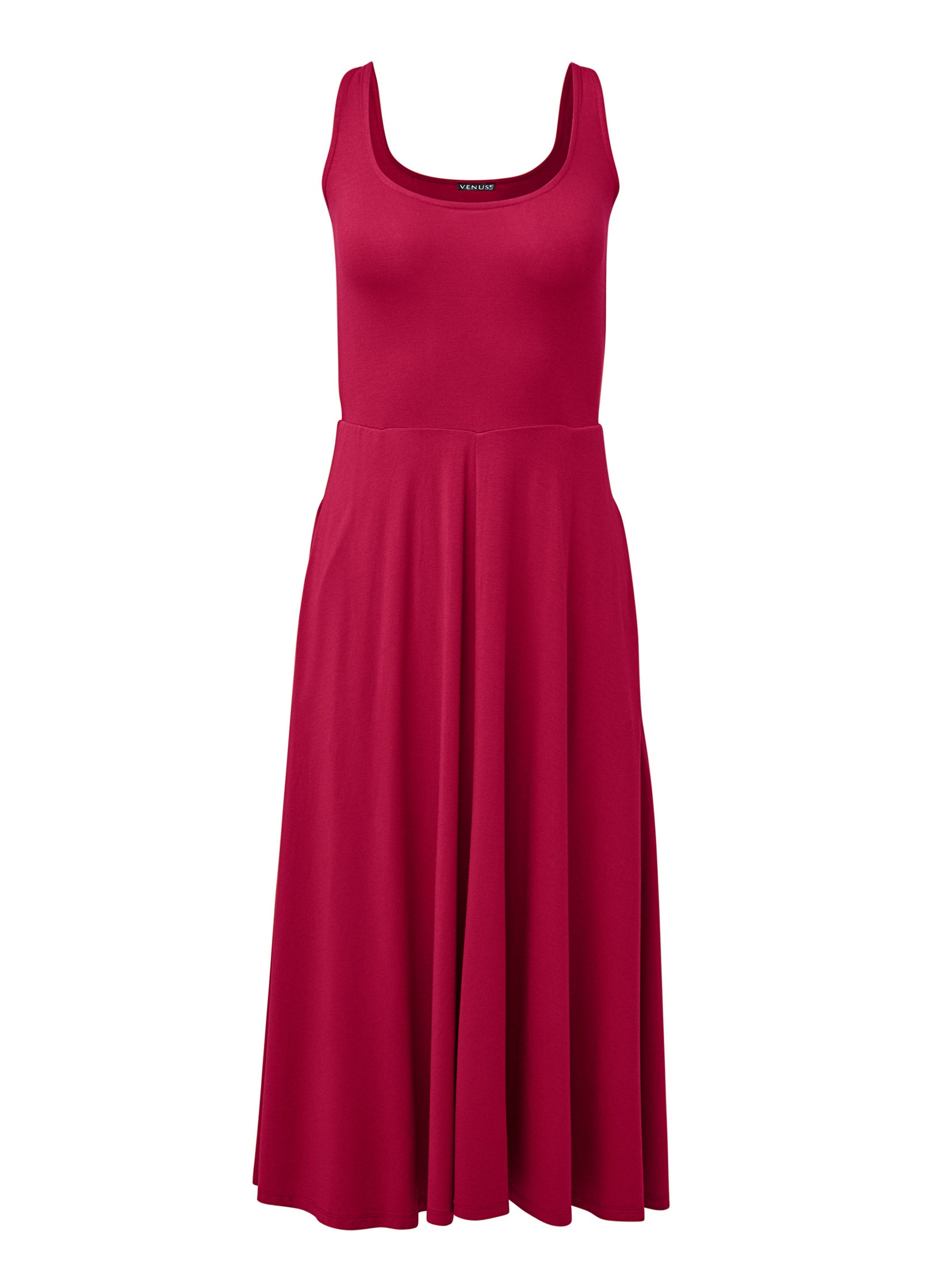 Swing into warmer weather in this breezy midi dress! Tank straps secure the flattering scoop neck and back. defining the fitted bodice until it transitions into the swingy hem. And guess what: It has pockets! Wear it alone or layer up for a look with extra dimension.* Sizes: XS (2). S (4-6). M (8-10). L (12-14). XL (16) * Plus sizes: 1X (18-20). 2X (22-24). 3X (26-28)* Scoop front and back* A-line* Side seam pockets* 47" approx. length; varies by size* Fabric has stretch* Ecovero viscose/spandex. Imported