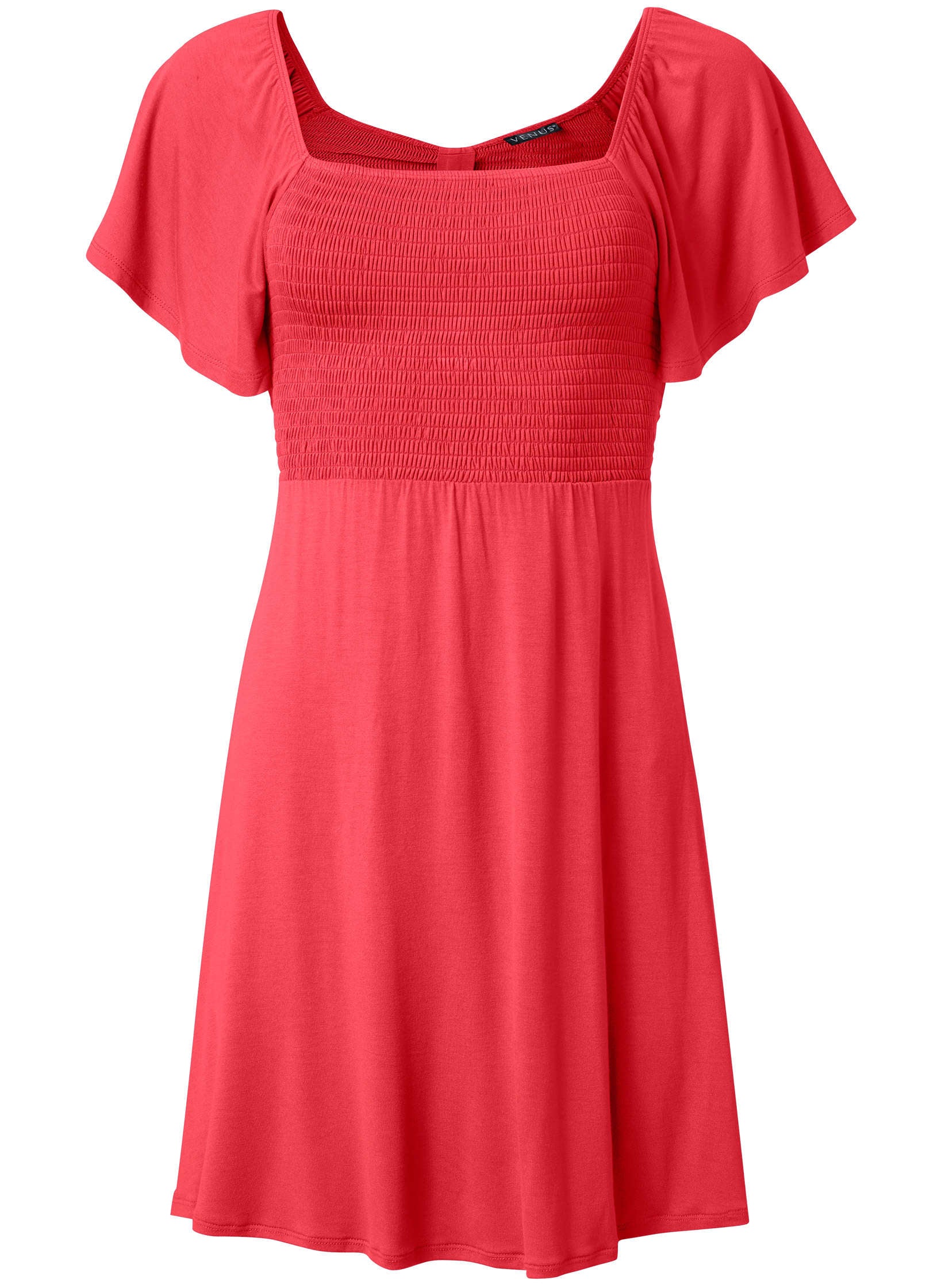 With its romantic vibe. this babydoll-inspired mini dress speaks to your inner goddess! With a fully-smocked bodice and open back that's cinched at the center strap. this short dress pulls on for all-day femininity. Flutter sleeves match back to the twirly hem below an empire waist.* Sizes: XS (2). S (4-6). M (8-10). L (12-14). XL (16)* Plus sizes: 1X (18-20). 2X (22-24). 3X (26-28)* Runs small; size up for a better fit* 27" approx. length; varies by size* Mini length * Babydoll* No closure * Flutter sleeves * Square neckline* Fabric has stretch * Viscose/spandex. Imported