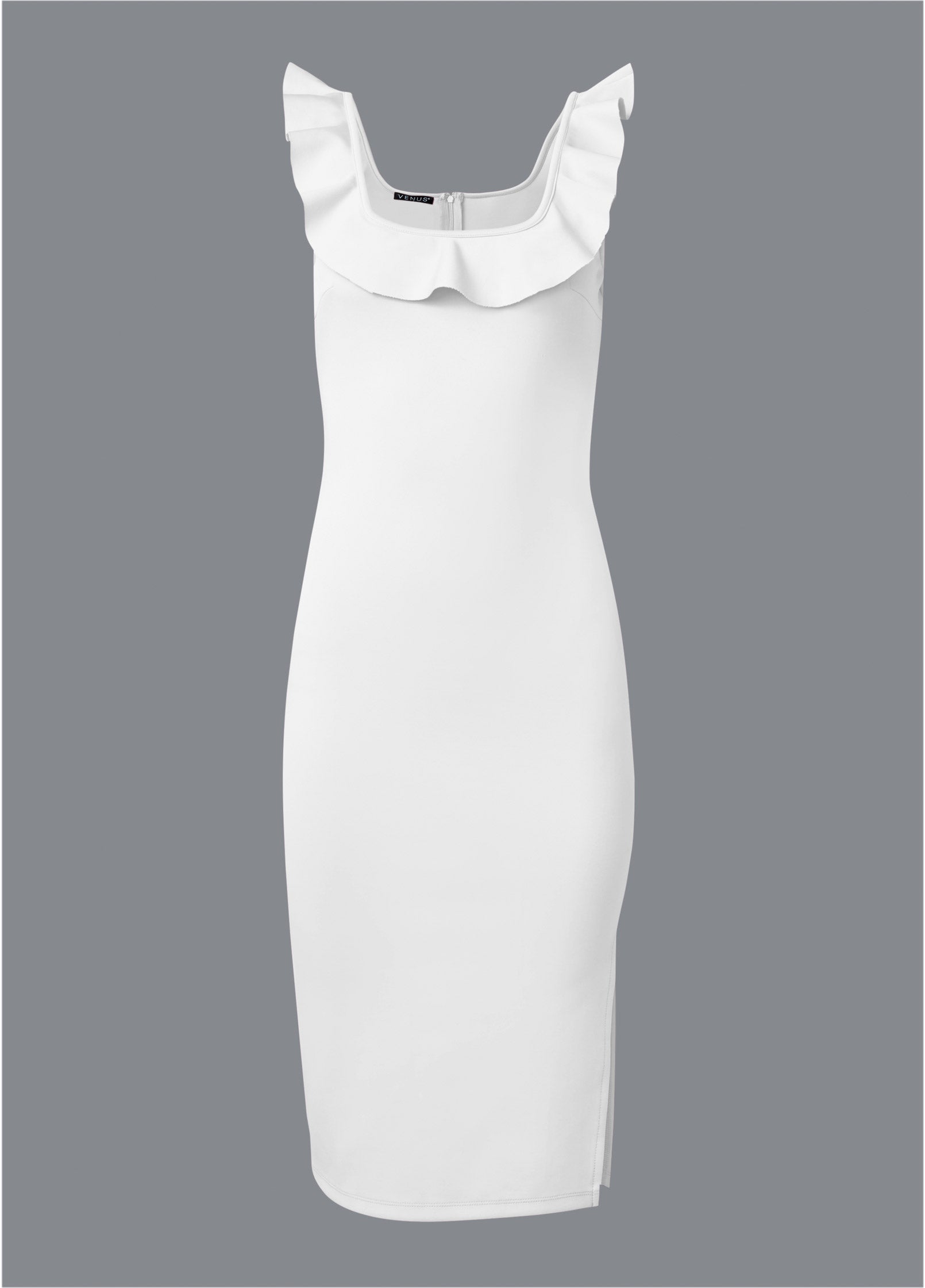 Get ready to ruffle! Detailed with ruffled trim from the tank straps across the squared neck and back. this curve-enhancing midi dress brings sophisticated style to any event. The side slit in the leg adds essential movement to the knee-length fitted hem so you can work the room with confidence.* Sizes: XS (2). S (4-6). M (8-10). L (12-14). XL (16) * Plus sizes: 1X (18-20). 2X (22-24). 3X (26-28)* Square neck and back* Ruffle detail along tank straps and neckline* Center back zipper closure* Side slit* Wear with shapewear for additional support* 45" approx. length; varies by size* Fabric has some stretch* Poly/elastane. Imported