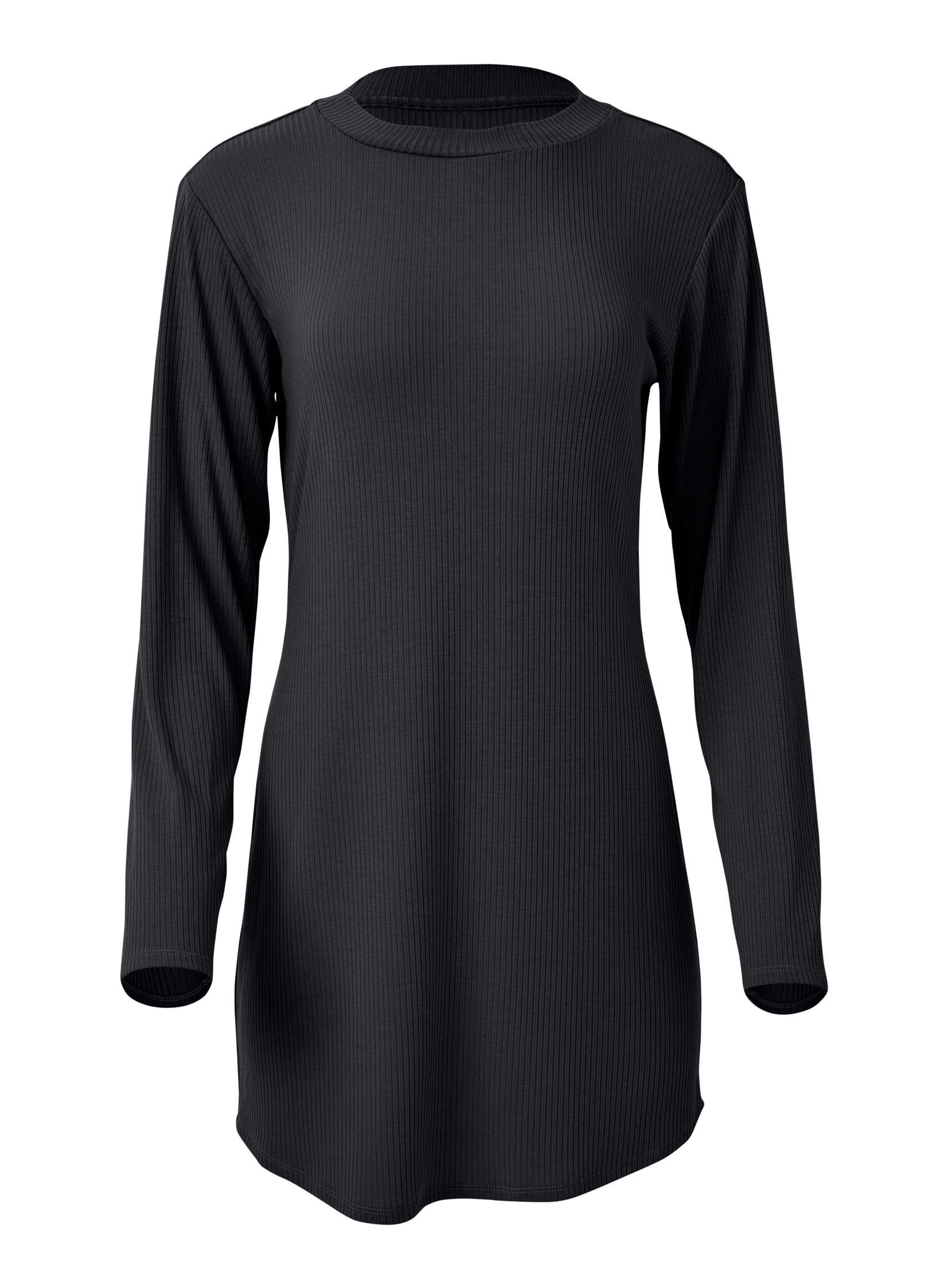 Shake things up with a touch of ribbed texture! Comfortably casual with its relaxed fit. this mini T-shirt dress almost feels like you're wearing jammies; it's that comfortable! Ribbing is THE look right now thanks to its versatility. and this dress does it in a way you won't want to take off.* Sizes: XS (2). S (4-6). M (8-10). L (12-14). XL (16) * Plus sizes: 1X (18-20). 2X (22-24). 3X (26-28)* Fabric has stretch* No closure* Crew neck* Long sleeves* 35" approx. length; varies by size* Poly/viscose/elastane. Imported