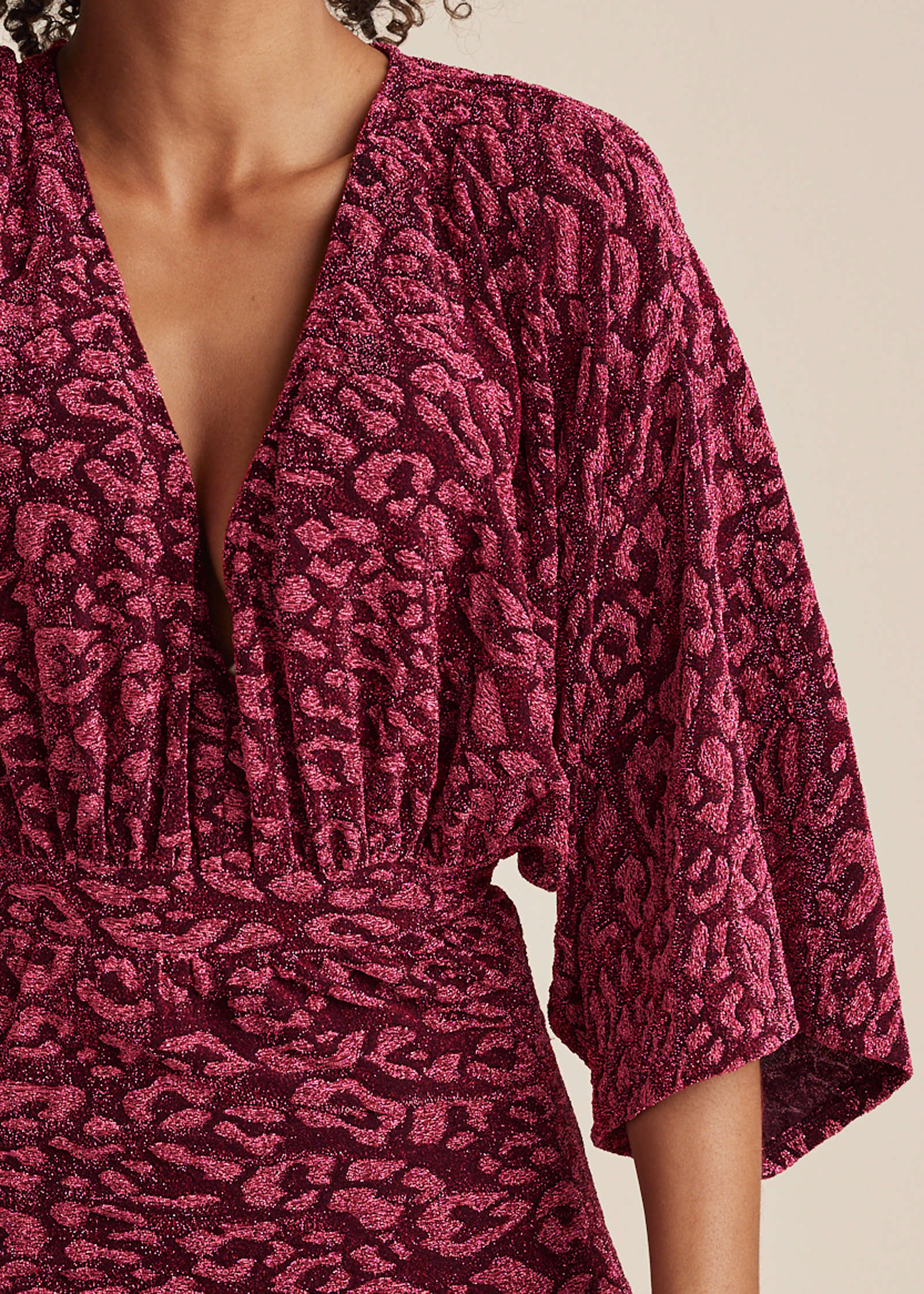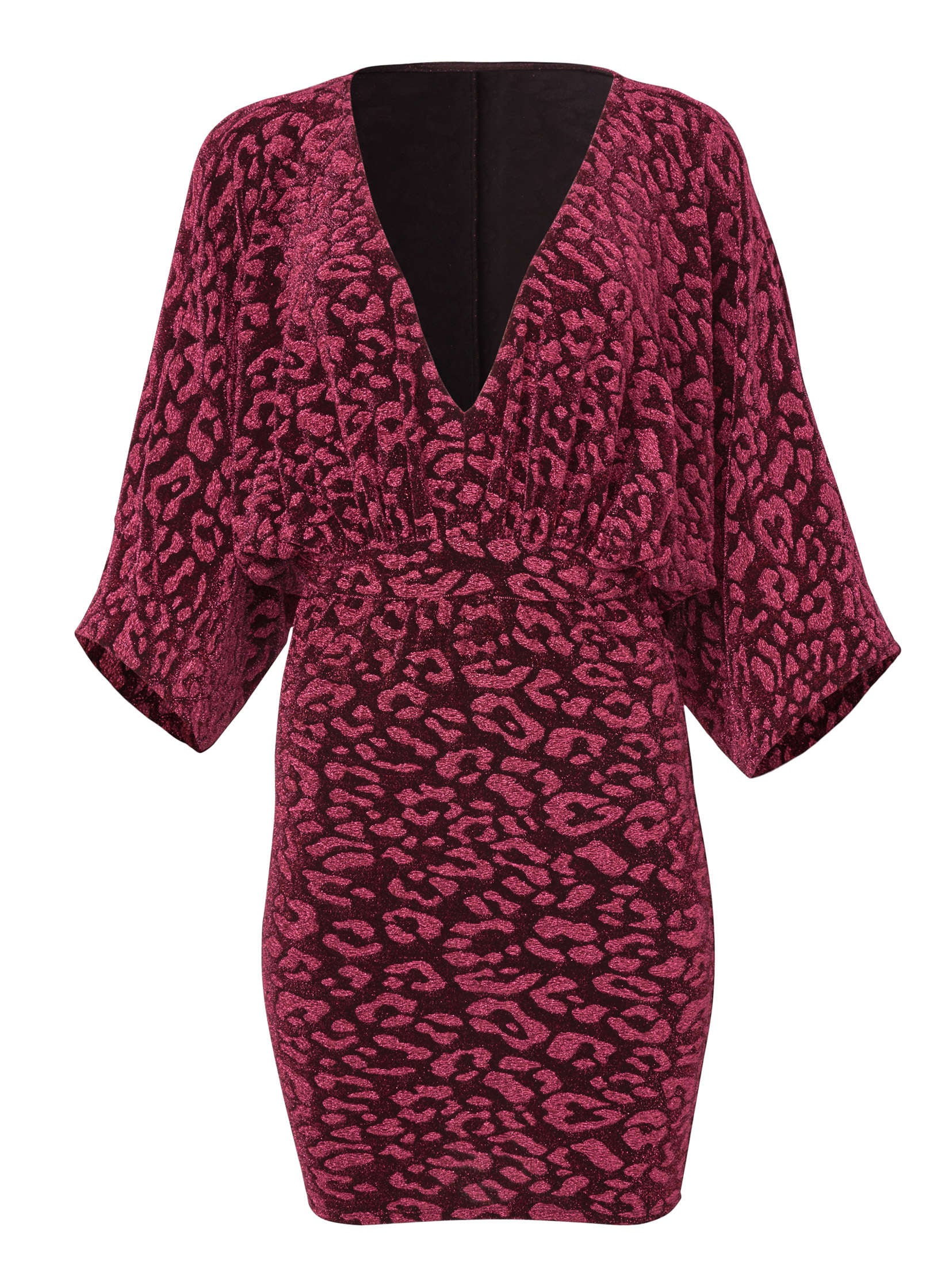 Step into the spotlight in this glittering leopard-print dress. Metallic fabric makes this bodycon mini the ultimate plus one. But that's not all: dolman sleeves move with you (hello dance floor partner). and then there's the fitted skirt that will be giving your figure compliments all night long.* Sizes: S (4-6). M (8-10). L (12-14). XL (16)* Plus sizes: 1X (18-20). 2X (22-24). 3X (26-28)* 37" approx. length; varies by size * 3/4 sleeves* Bodycon* Unlined* V-neck* Elastic waist* Polyamide/metallic/elastane. Imported