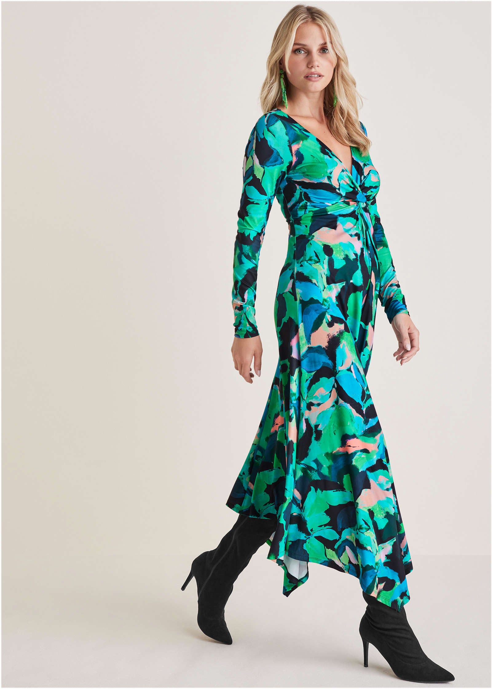 We've done it: Created a maxi that's breezy like a summer dress. but made to keep you warm in cooler temperatures. This effortless maxi has a plunging twist front that flatters every body type and a flowy skirt that's made to twirl. Long sleeves keep you covered on colder days (and nights). Keep it casual with boots or add heels to dress it up for your next event. * Sizes: XS (2). S (4-6). M (8-10). L (12-14). XL (16)* V-neckline* Plunging twist front* Long sleeves* Asymmetrical hem* Fabric has stretch* Polyester/elastane. Imported