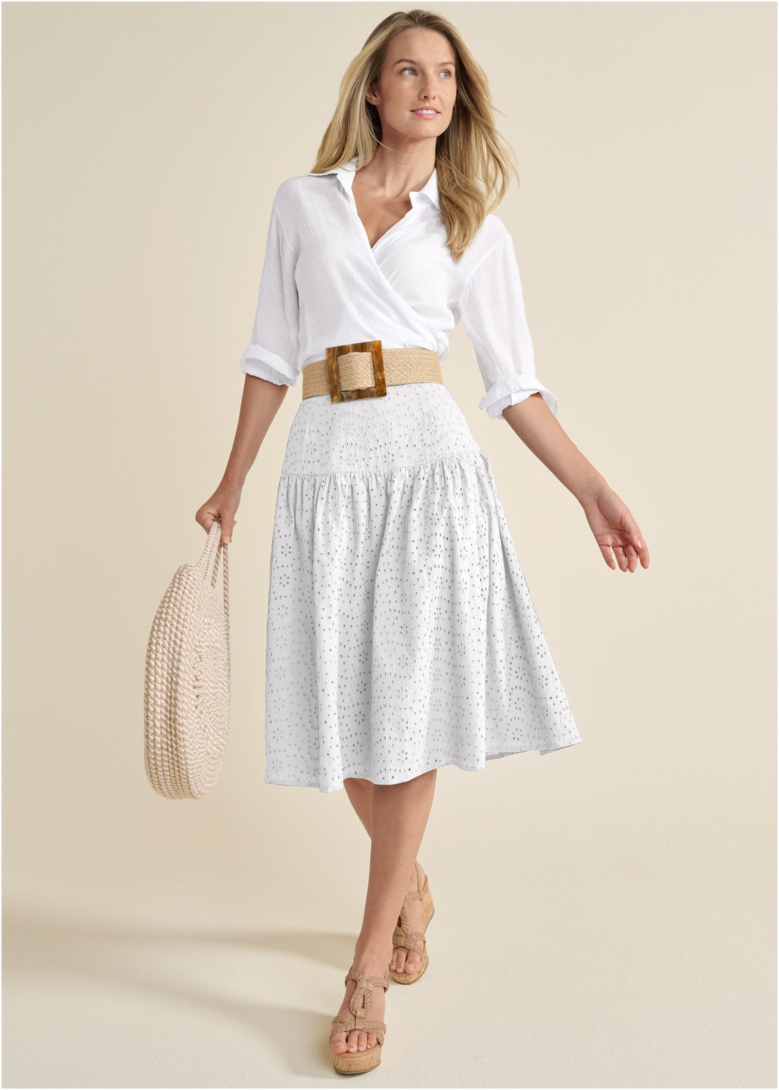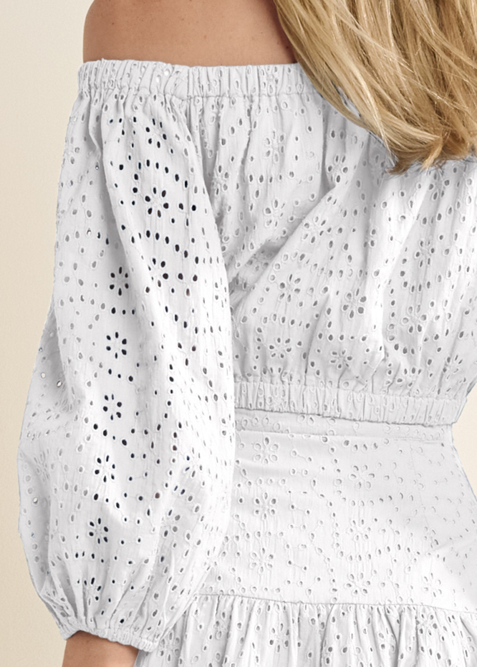 Timeless eyelet reveals your feminine side in this versatile two-piece midi dress. The 3/4 sleeve off-the-shoulder top is cropped short and secured with an elastic hem. pairing perfectly with the included skirt or your jeans. The swingy drop-waist skirt hits just below the knee and twirls with every step!* Available in plus sizes* Invisible zipper closure* Top has elastic off-the-shoulder neckline with 3/4 sleeves* Fitted wide waistband* Fully lined eyelet* Top: 17" approx. length* Skirt: 29" approx. length from waist to bottom hem* Measurements vary by size* Fabric does not have stretch * Cotton. Imported