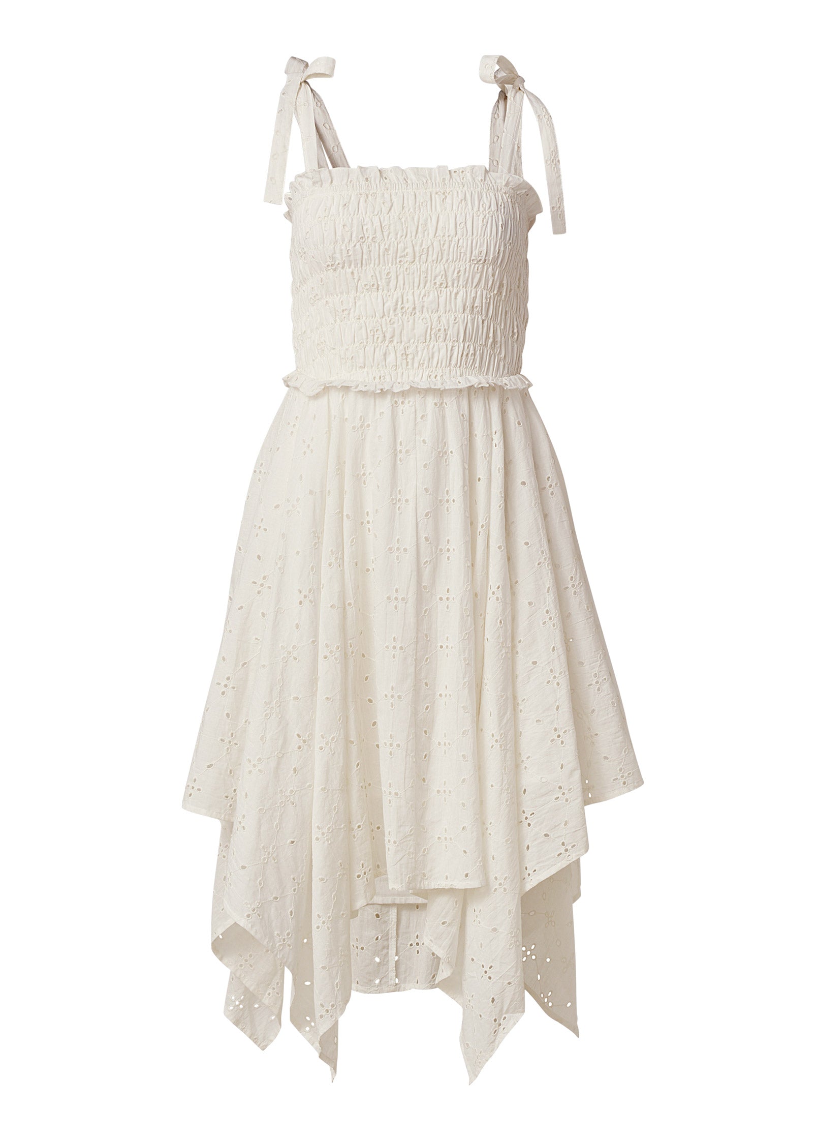 The breezy hanky hem and allover eyelet detail give this dress its playful attitude! Tie shoulder straps make the silhouette more fun. securing the square-cut smocked bodice in place before transitioning into the twirly. asymmetrical skirt. Flirty and feminine. this dress turns heads at every occasion.* Sizes: XS (2). S (4-6). M (8-10). L (12-14). XL (16)* Plus sizes: 1X (18-20). 2X (22-24). 3X (26-28)* Tie shoulder straps with square neckline* Eyelet hanky hem* Fully lined to shortest point of skirt* Smocked bodice with eyelet detail* 34" at shortest point; 47" at longest point* Measurements vary by size* Fabric has some stretch* Cotton. Imported